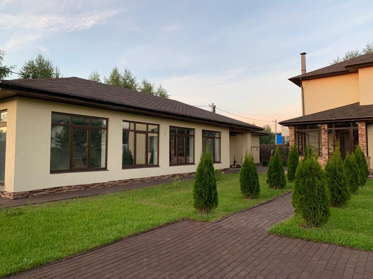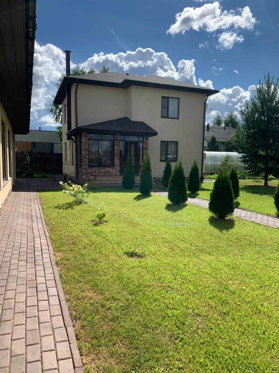 Продается дом 109 кв.м, на участке 12 соток. ДНП Большое Петровское, в 5 км до города Чехов, 43 км от МКАД по Симфер. шоссе. Дом капитального строения, для круглогодичного проживания. Построен в 2017-м году из пеноблоков, утеплён снаружи пеноплекс, фундамент бетонный-ленточной, стены пеноблоки, перекрытия деревянные, окна стеклопакеты, кровля мягкая, полы плитка, ламинат, наружная отделка-декоративная штукатурка. Планировка: на первом этаже коридор, прихожая, гостиная совмещенная с кухней, спальня, санузел, Бойлерная с отдельным входом. На втором этаже три спальни, санузел совмещённый с ванной. Коммуникации: отопление газовое , электричество 25 кВт, Septic топаз-пять, скважина 57 м. Отдельное строение бани 164 кв.м, (липа, лиственницы, абаш) в бане сауна и бассейн, комната отдыха, душевая и санузел. Гараж 7*8 на две машины. На участке теплицы растут плодовые деревья , есть место для дальнейшей ландшафтный планировки. В пешей доступности торговый центр , автоб. остановка. По участку установлен дренаж.