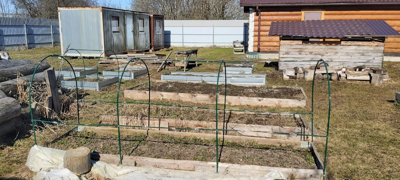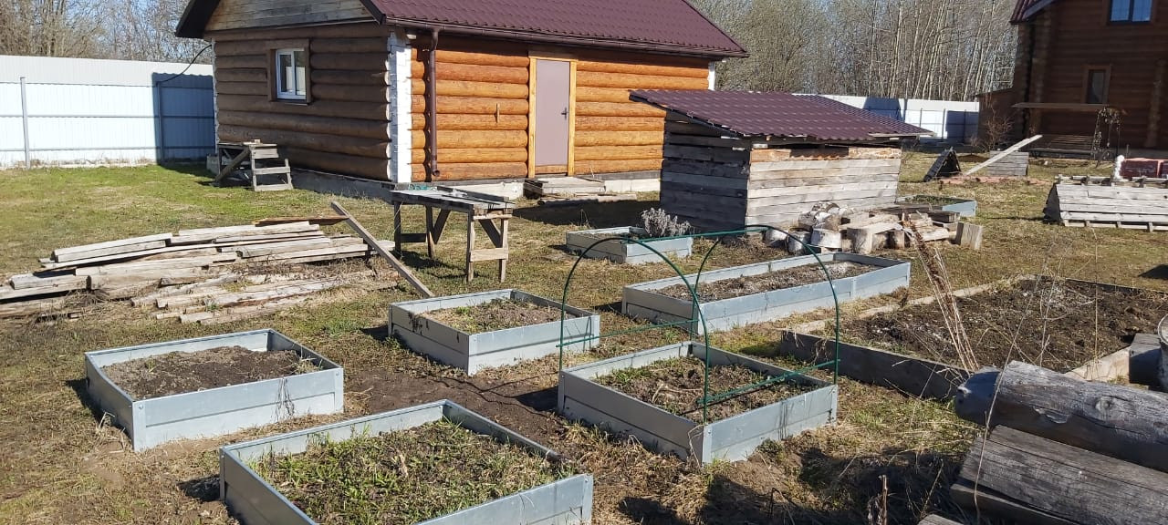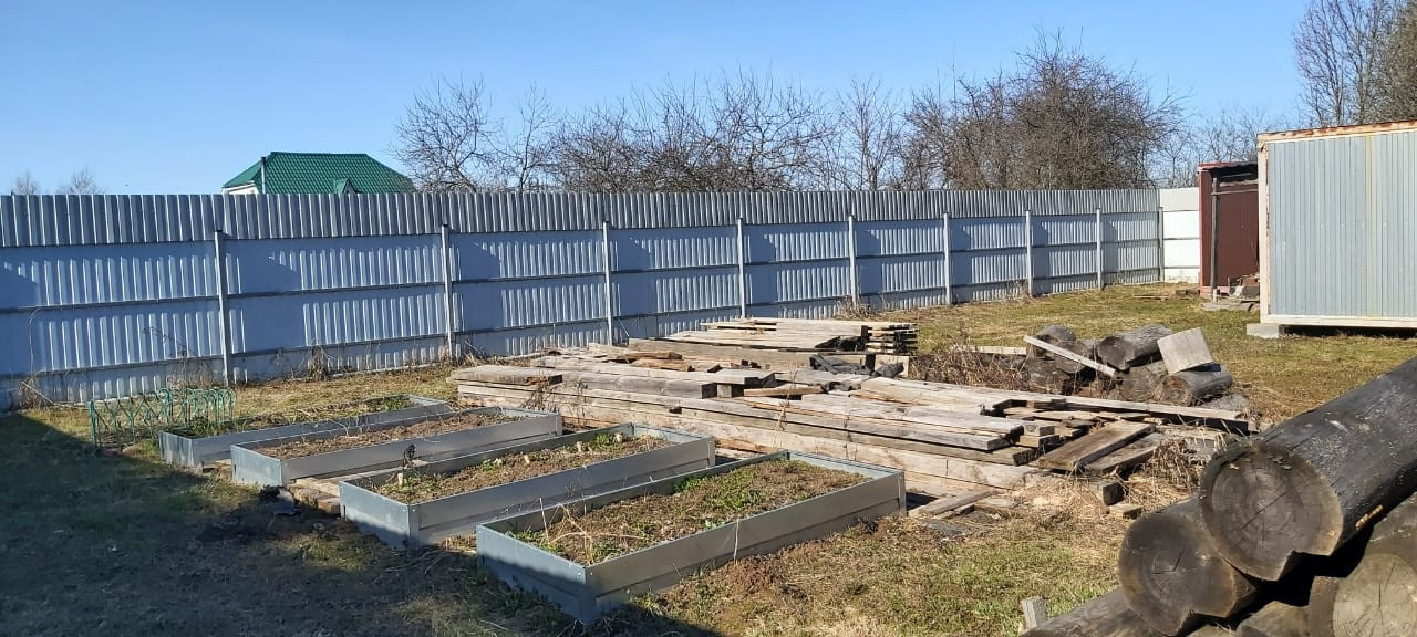 Участок 15 соток огорожен забором из профнастила. Правильной формы, ухожен, засеян травой, высокие грядки, теплица.