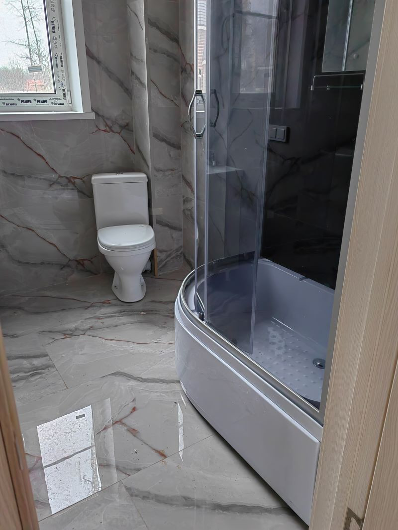 Коробка : фундамент монолитная плита; коробка из газобетонный блоков; кровля — металл черепица с утеплителем; ввод коммуникаций в дом; полы теплые, водяные, проложены с отдельными контурами под каждое помещение с возможностью регулировать температуру в каждой комнате, поэтому установка батарей на стенах не требуется. Это экономит пространство в доме и удобно в эксплуатации; стяжка; люк на чердак с выдвижной лестницей с возможностью использования чердачного пространства под хозяйственные нужды; наружная отделка ; окна ПВХ, дверь входная с терм разрывом. Плитка. Ламинат. Натяжной потолок.