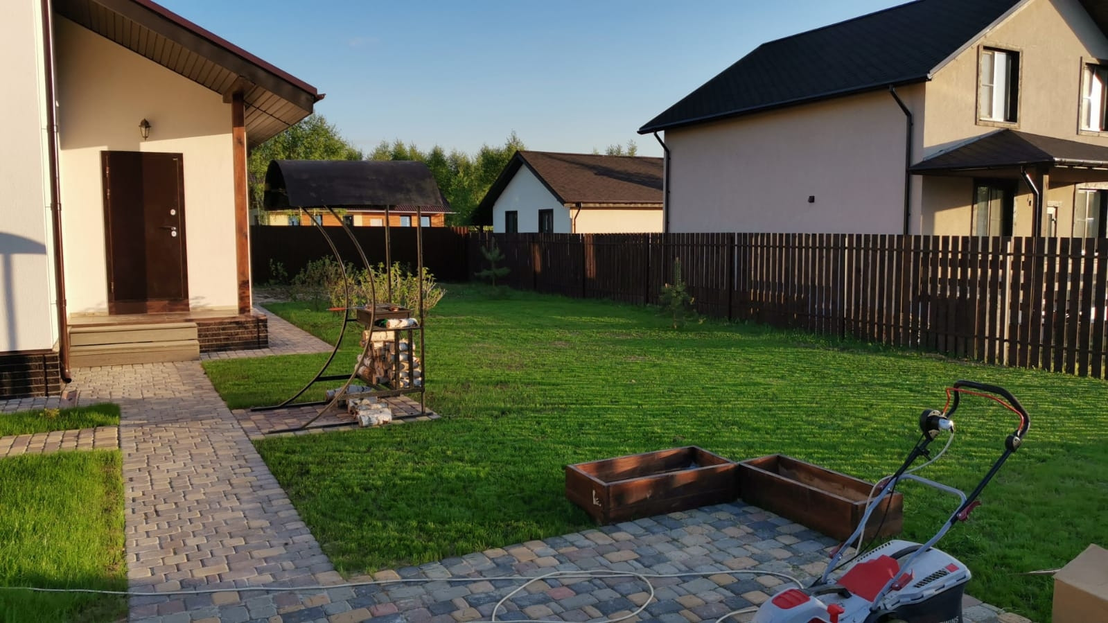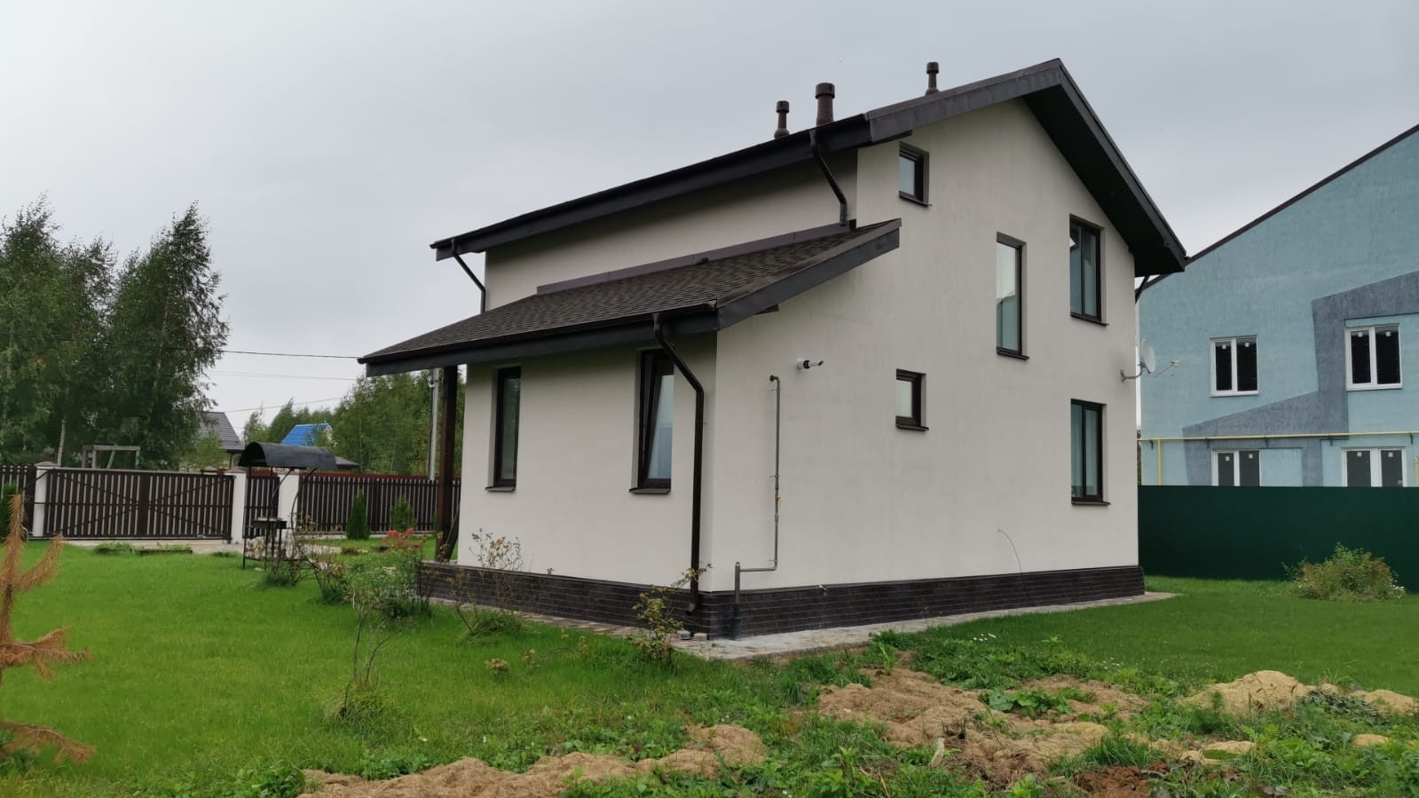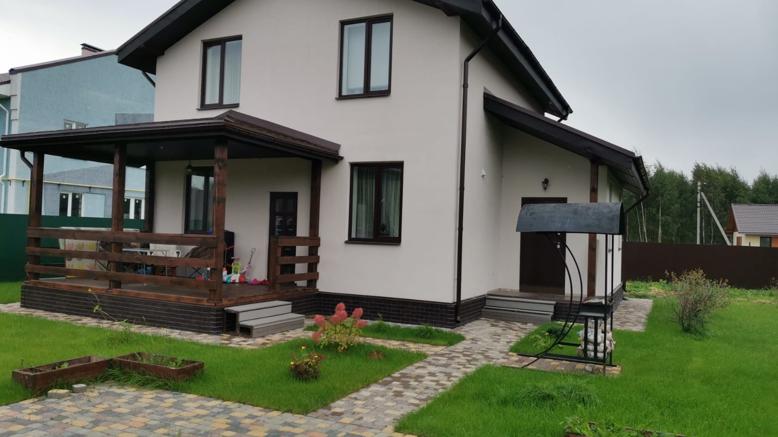 Дом расположен на участке 7 соток, огорожен забором, ворота электрические, детская площадка, мангал. Посажен газон, туи, плодовые деревья, смородина, гортензии.