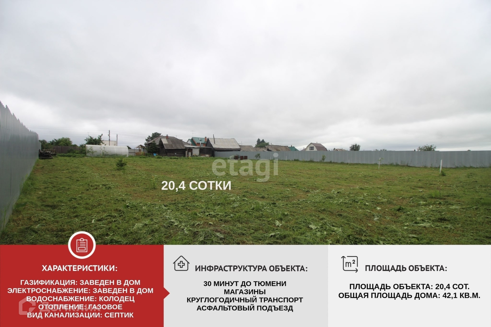 Продается жилой дом в 30 минутах езды от Тюмени в д. Костылева (Червишевский тракт). Располагается в центральной части деревни. Вся инфраструктура в пешей доступности. Площадь дома 42,1 кв.м. Газ. Окна заменены на пластиковые. Уютная летняя веранда. Участок чистый и ровный, площадью в 20 соток расположен на высоком месте. Ухожен, есть насаждения. Колодец прямо в ограде. Есть 2 сарая, баня. Прекрасный вариант как для проживания, использования под дачу или строительства собственного дома в живописном месте. Можно использовать как домик выходного дня, делать домашние заготовки, собирать ягоды и грибы и есть где хранить. Регулярные автобусные рейсы до Тюмени несколько раз в день, остановка рядом. Есть магазин. Рядом расположен лес, а река прямо за участком. В трех километрах находится международный спортивный центр Жемчужина Сибири. Территория деревни ухожена, на дорогах асфальт. Земля и дом в собственности. Звоните!