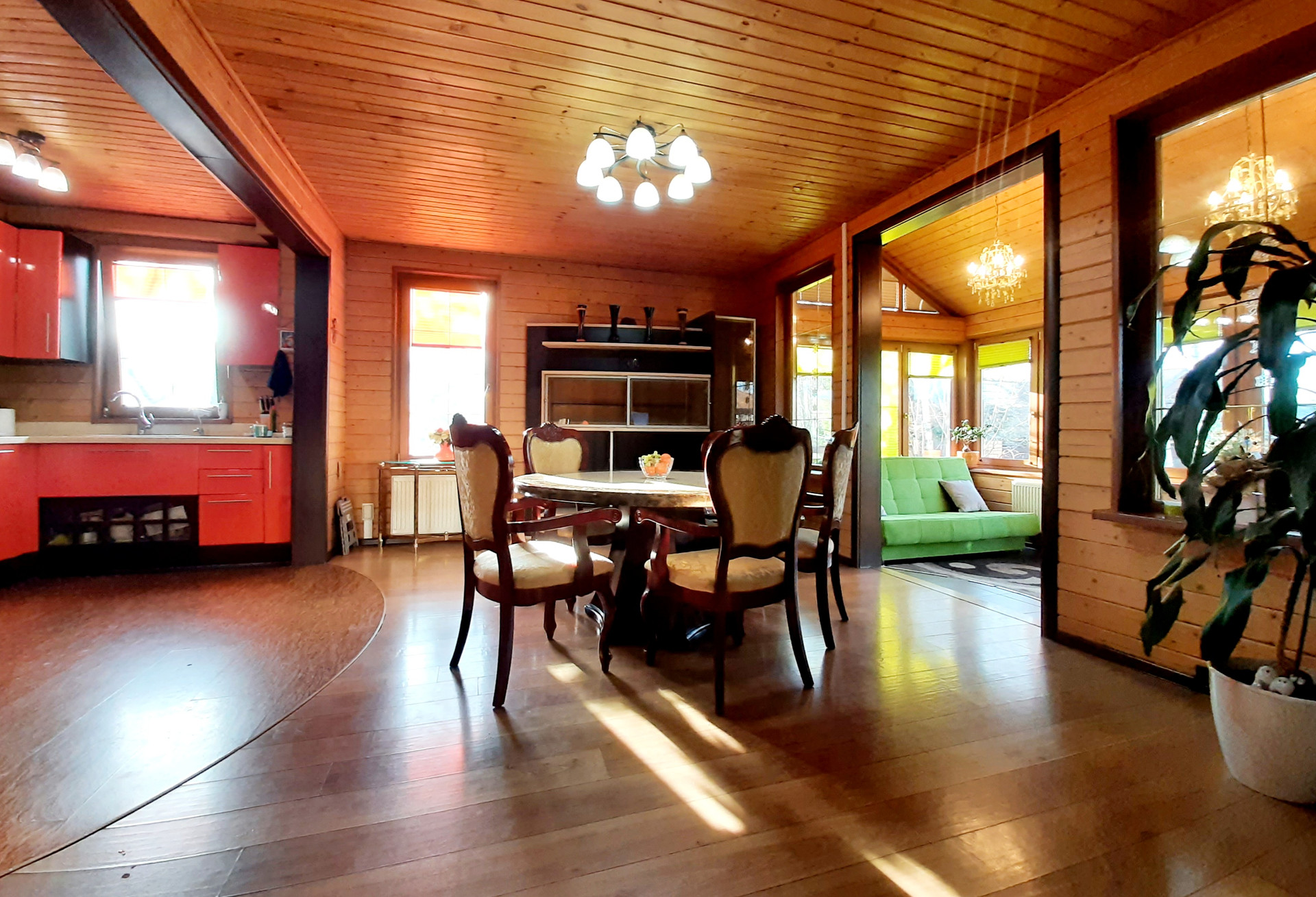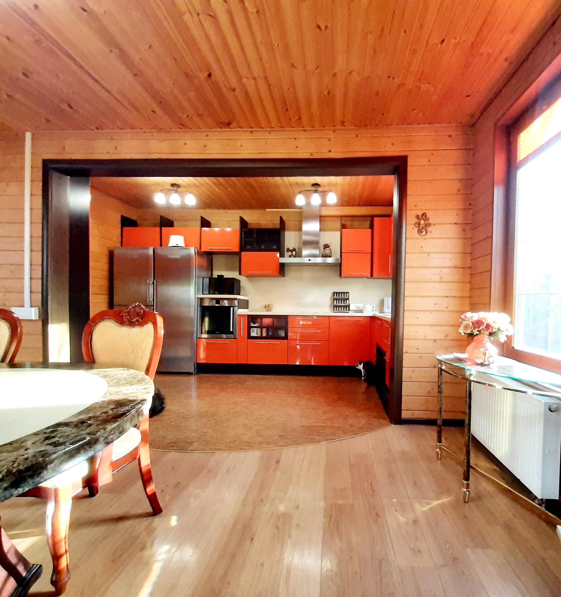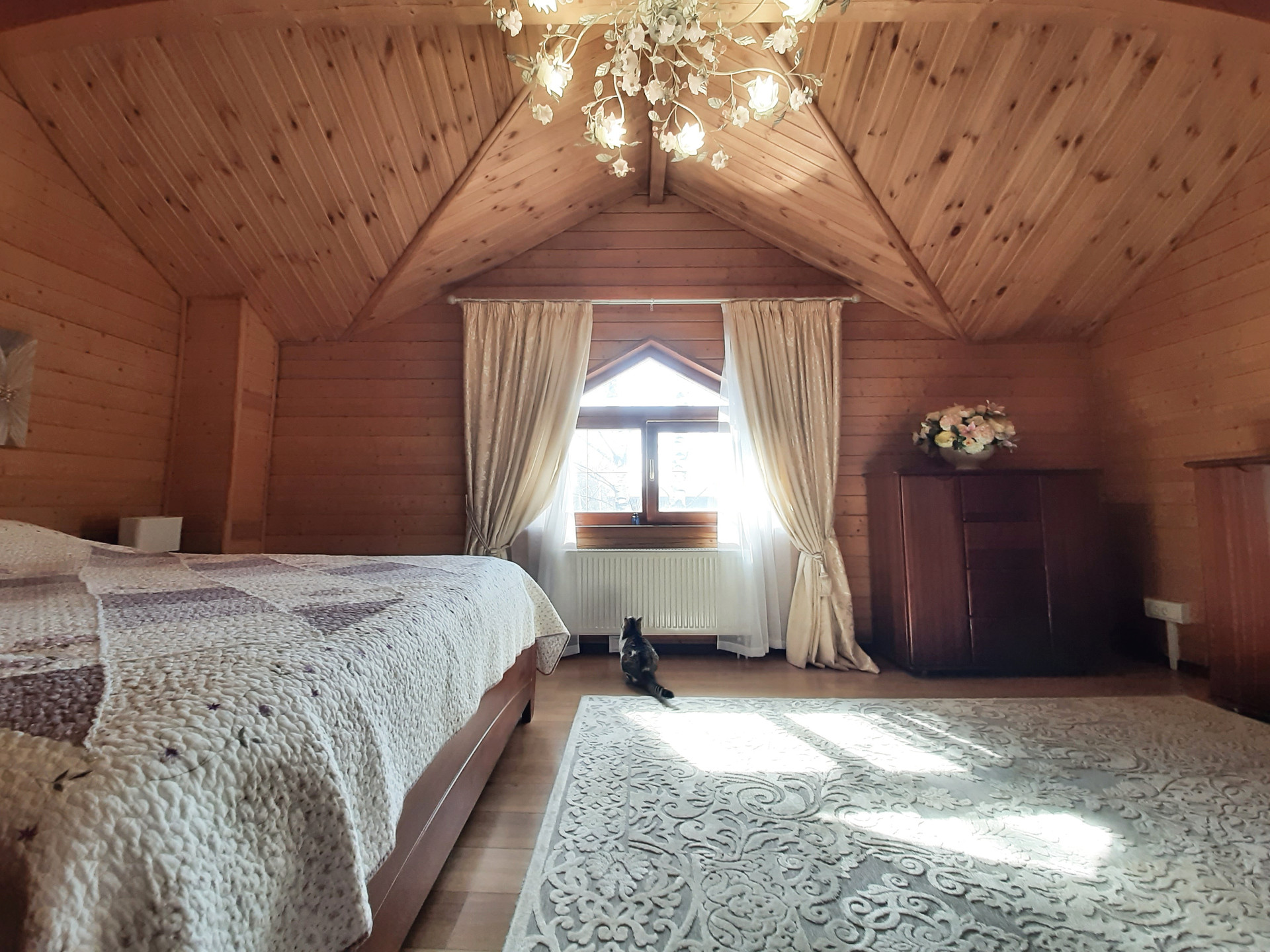 Дом расположен на самой высокой точке поселка, окна ориентированы по всем сторонам света. Функциональная удобная планировка дома позволяет комфортно жить в нем большой семье. При отделке использовались экологически чистые материалы, установлены деревянные стеклопакеты, сделан теплый пол на и обогрев крыльца. Благодаря второму свету в гостиной и большому количеству окон дом светлый. Прекрасно держит тепло даже в самые суровые зимы. Дом укомплектован всей необходимой мебелью и техникой.