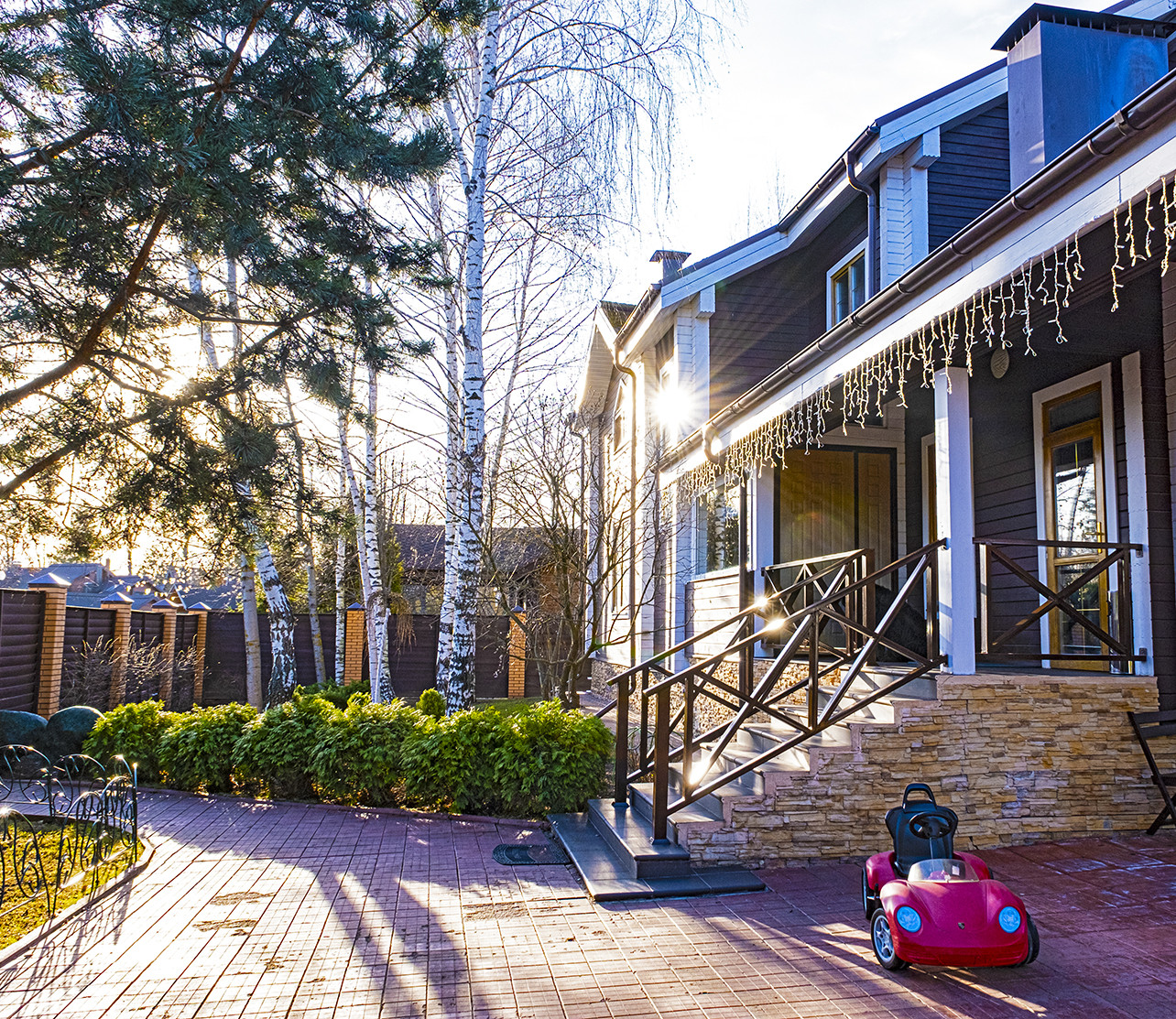 Поселок бизнес-класса застроен в едином архитектурном стиле деревянными домами с широкими ухоженными улицами и газонами. Огороженный периметр, видеонаблюдение, пропускная система, круглосуточная охрана. На территории поселка оборудованы детские площадки, искусственный пруд зимой превращается в каток, есть хоккейная коробка, мини футбол, корт, зимой заливаются горки. Поселок на 226 дома обжитой, социально однородный, зеленый и ухоженный. Форма управления поселком-кооператив. Ежемесячные взносы 11 тысяч р в месяц за охрану, уборку снега и территории, вывоз мусора. Пай в кооперативе входит в стоимость дома.