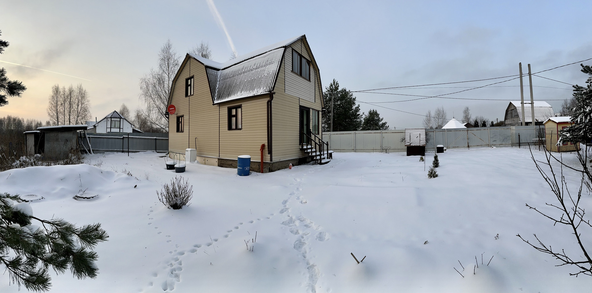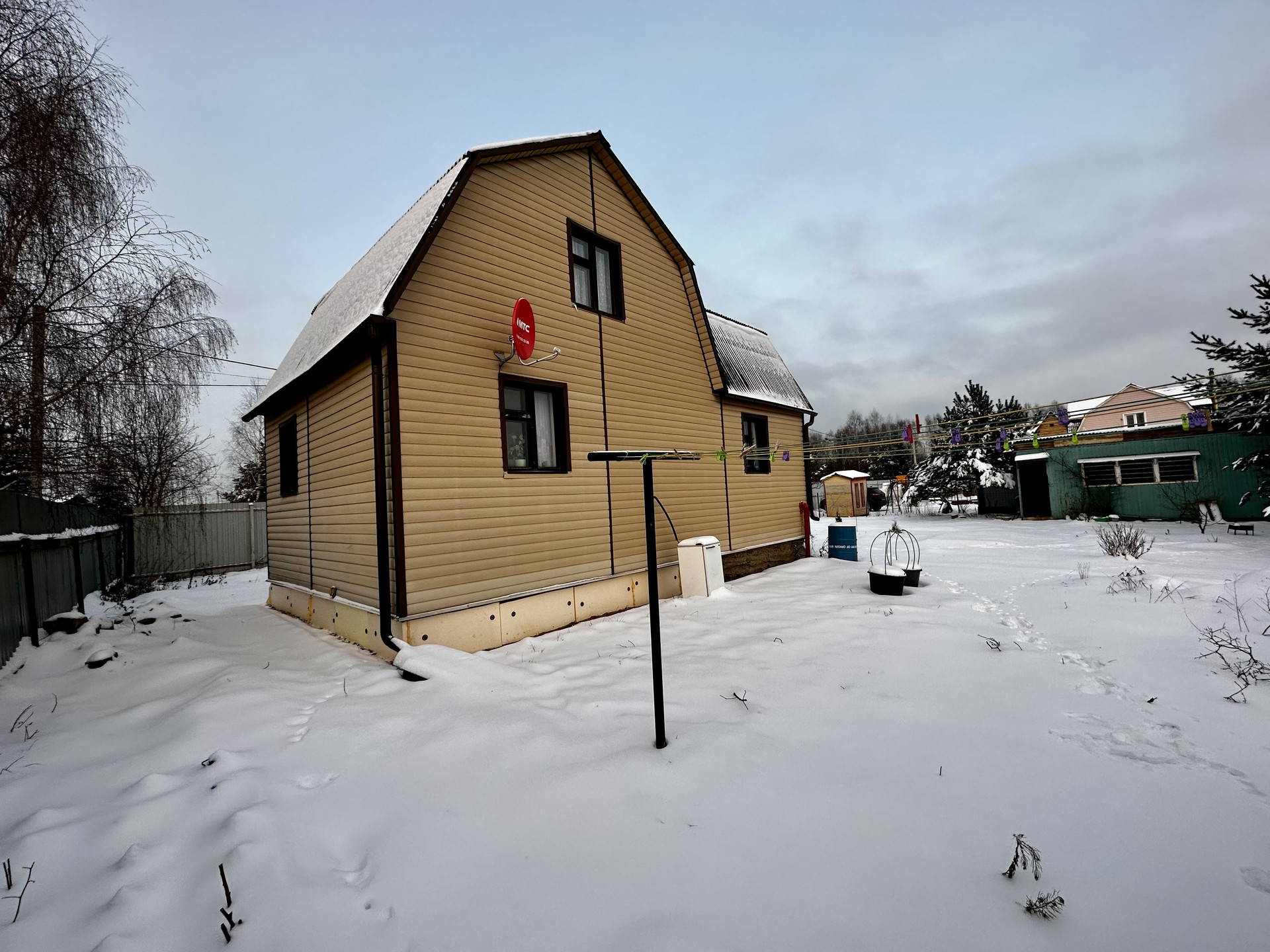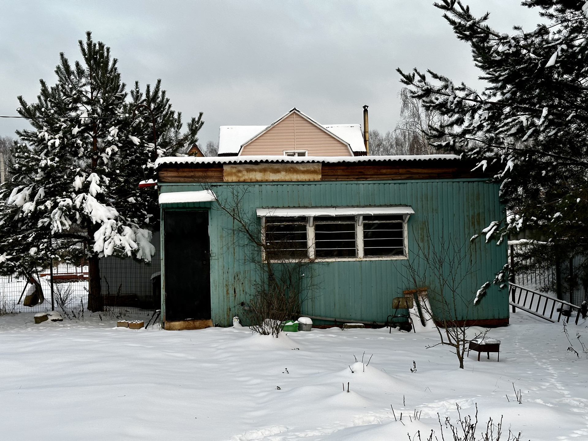 Участок ровный и ухоженный, квадратной формы, с трех сторон огорожен проф-листом, с задней части где нет соседей, установлена сетка рабица. На участке основной дом, и два хозблока