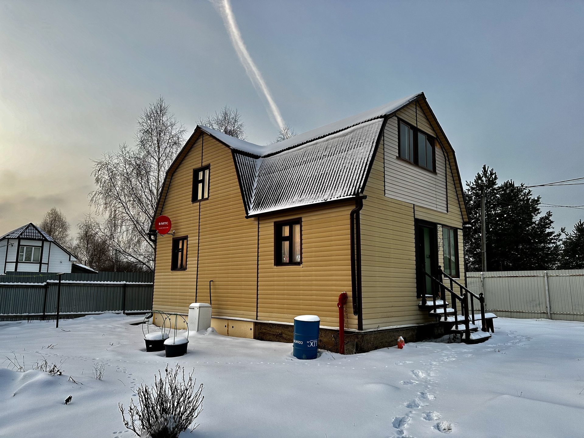 Дом 2009 г. постройки, зарегистрирован в 1017г., стены из шлакоблоков, обшит сайдингом, фундамент плита, кровля ондулин, окна деревянные. Первый этаж полностью отделан кроме ванной комнаты (совмещена с туалетом). Пол линолеум и половая доска, потолок имитация бруса.