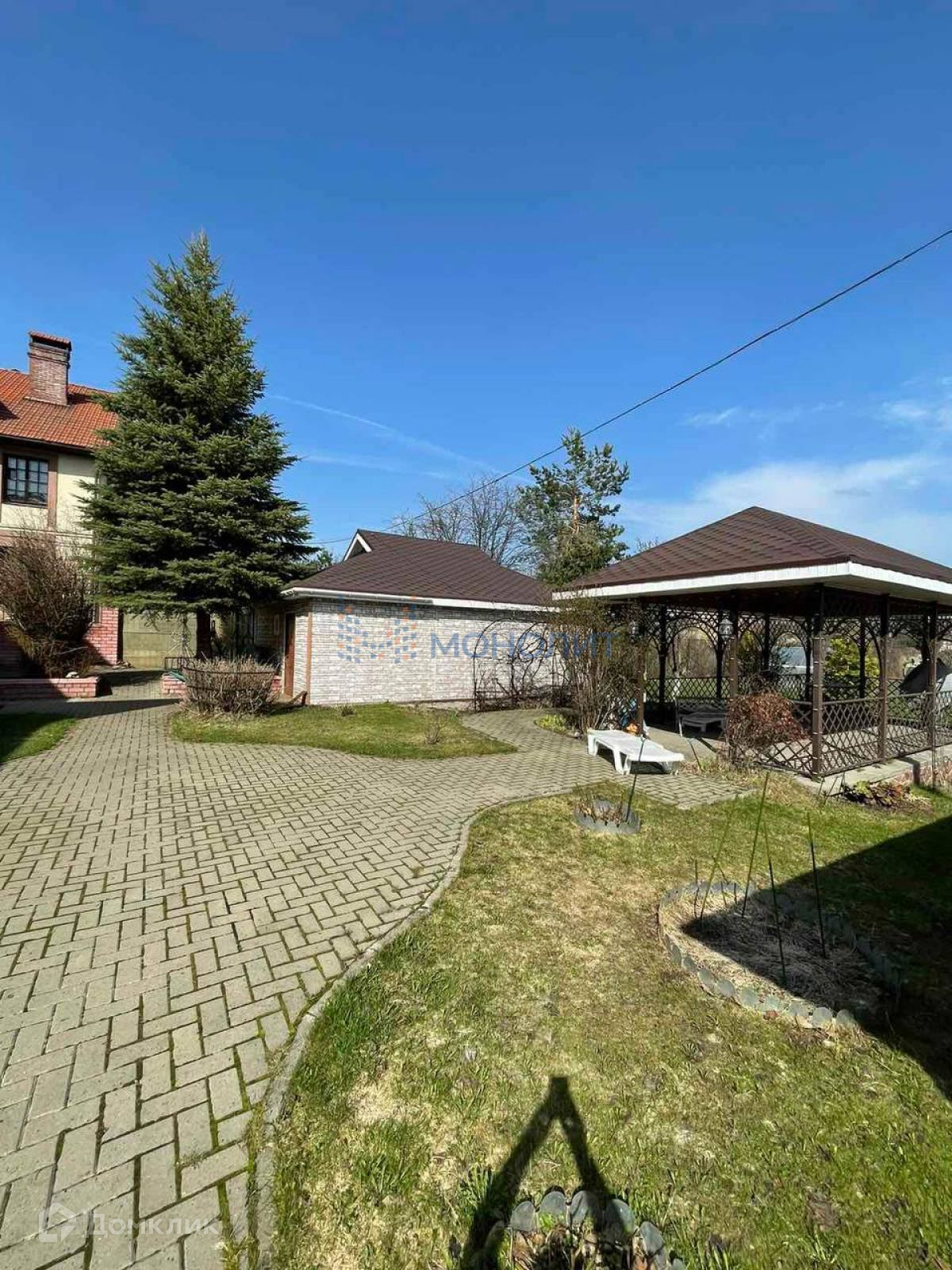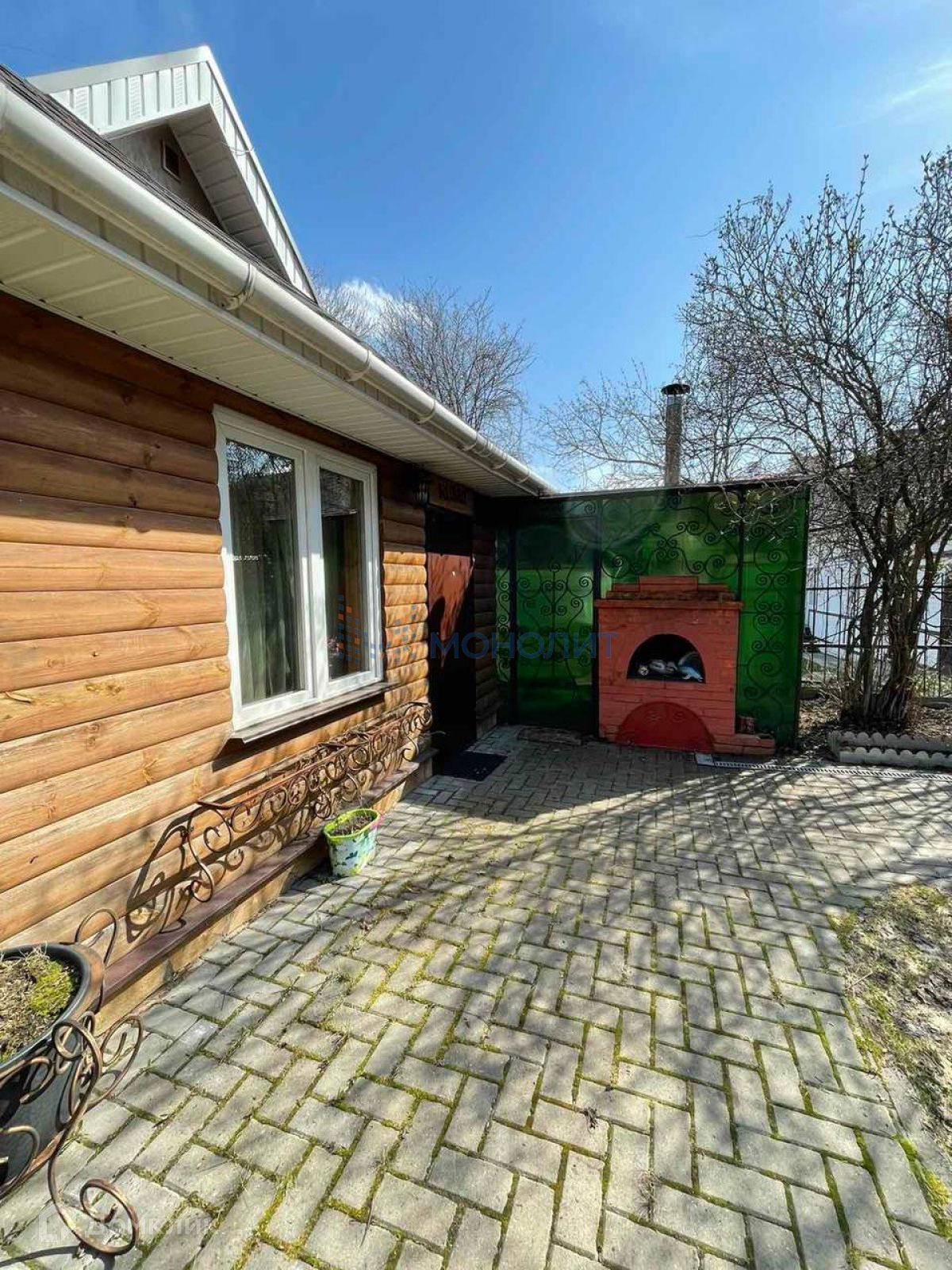 На территории располагаются: баня (место отдыха, душевая комната, зона барбекю), кованная беседка, кирпичный хозблок.