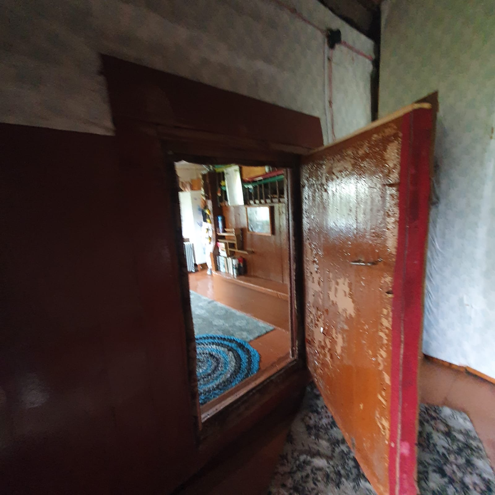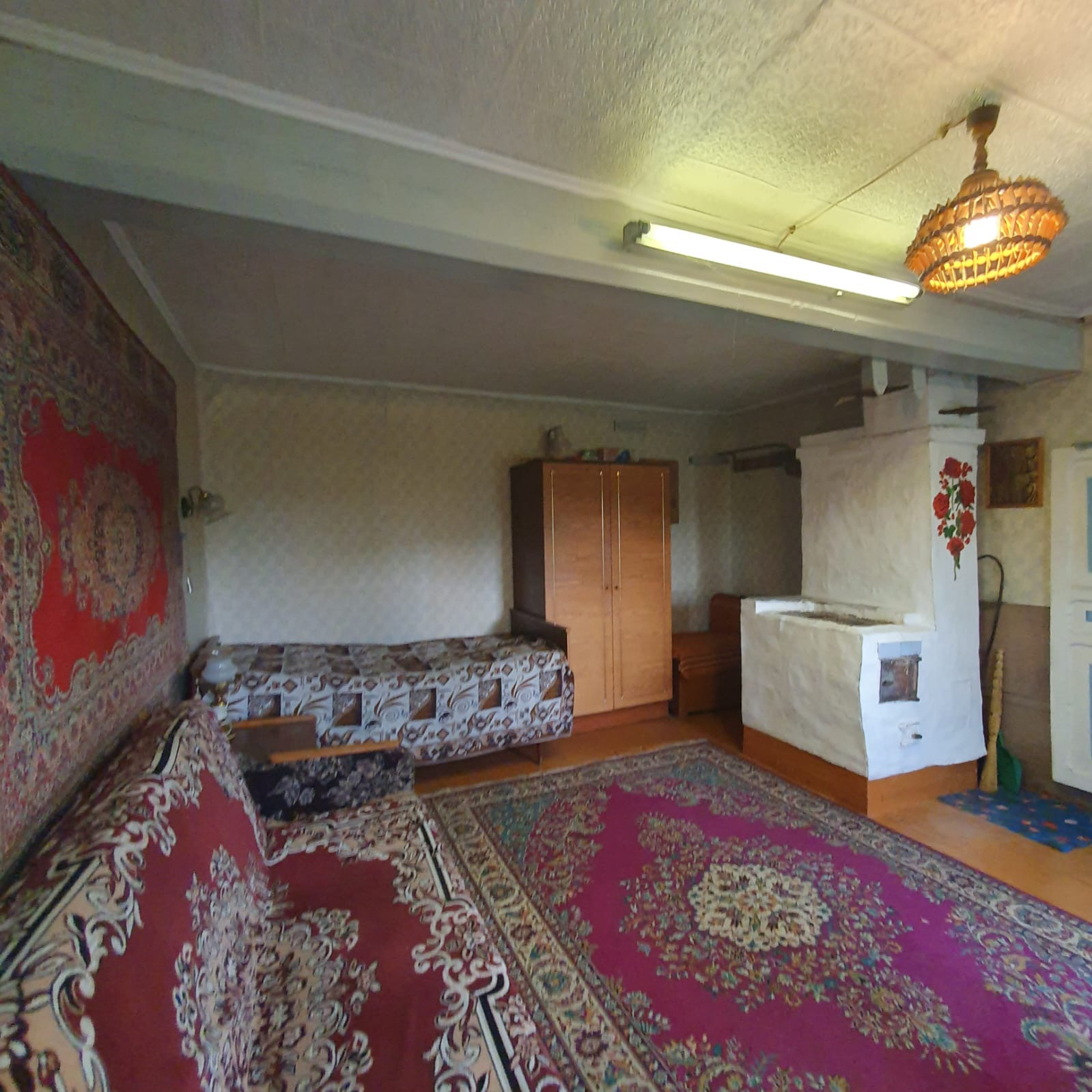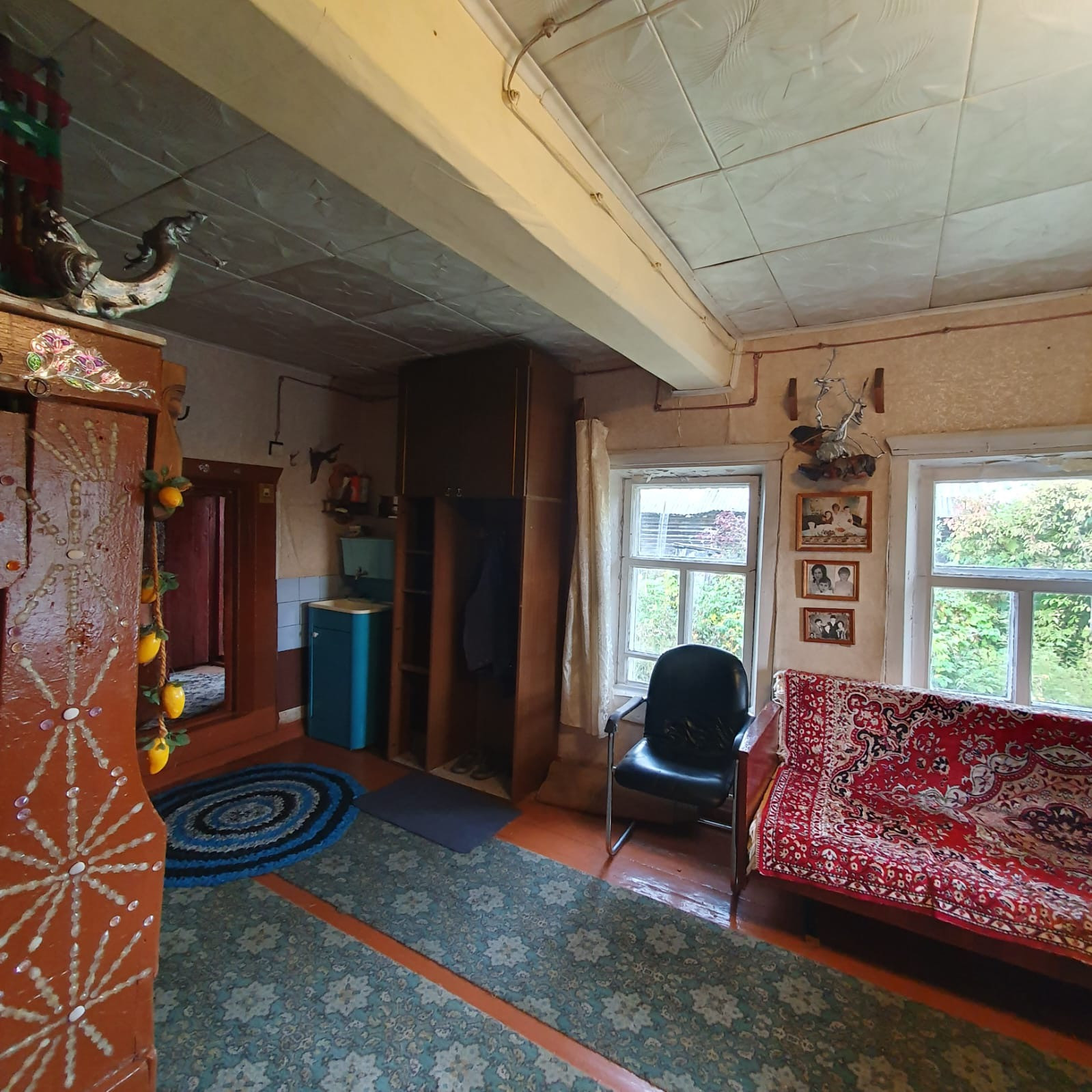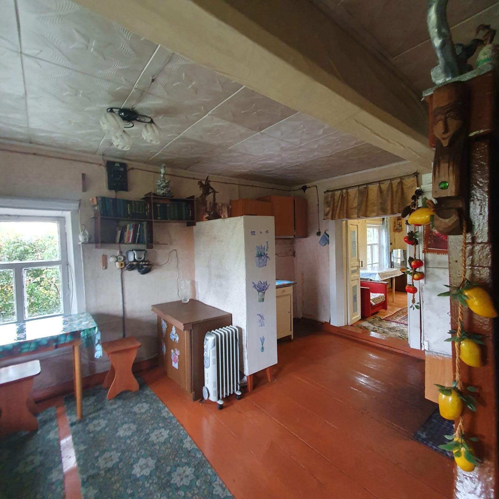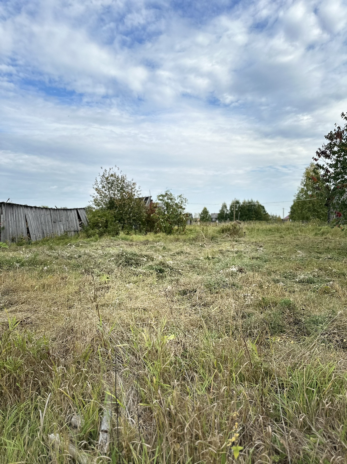 Дом стоит на ровном , прямоугольном участке , где находится банька, сарай, кустарники, посадки.