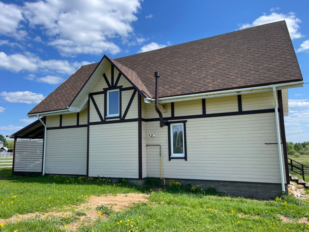 Полы - ламинатплитка. Фундамент - ленточный. Крыша - мягкая черепица. Утепленные слои дома по 200 мм. Окна - ПВХ. Наружная отделка - дерево. Для окраски стен второго этажа была использована специальная краска для дерева. Первый этаж выполнен из гипсокартона и окрашен современной краской. Дом по документам жилой (есть возможность прописки!).