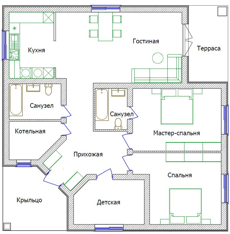 Одноэтажный дом, 133 м2. Фундамент - монолитная плита. Планировка построена так, чтобы сделать каждый квадратный метр площади полезным. В этом доме предусмотрена: