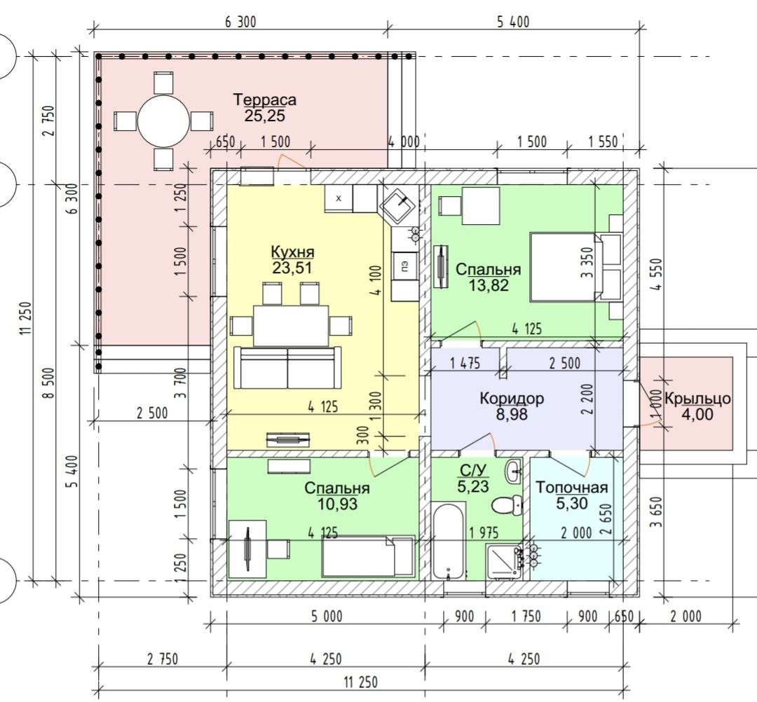 Планировка максимально комфортная: с разделением активной и жилой зон (см в картинках выше). Кухня-гостиная 23 кв.м с большим количеством света, благодаря большим окнам, 2 спальни, санузел, прихожая, большое хозпомещение.