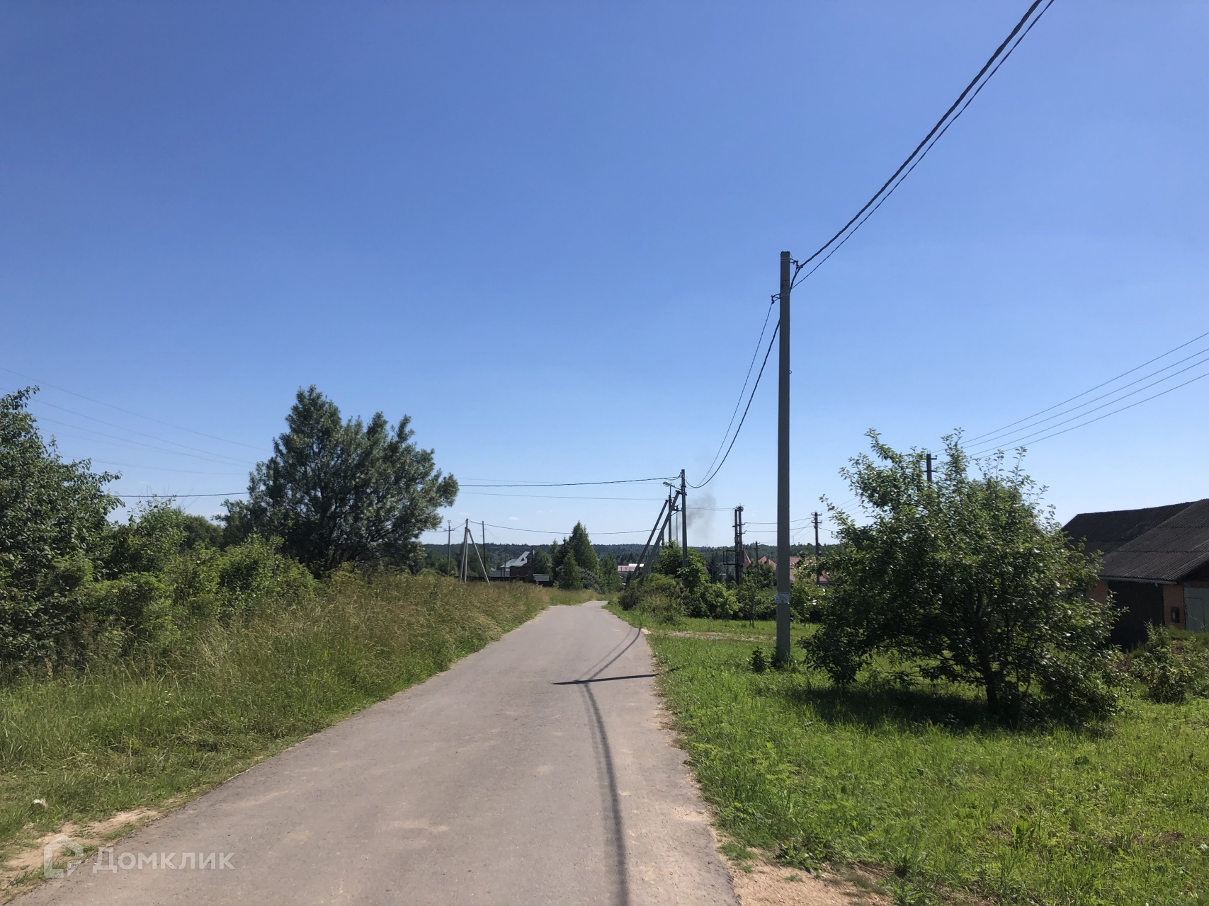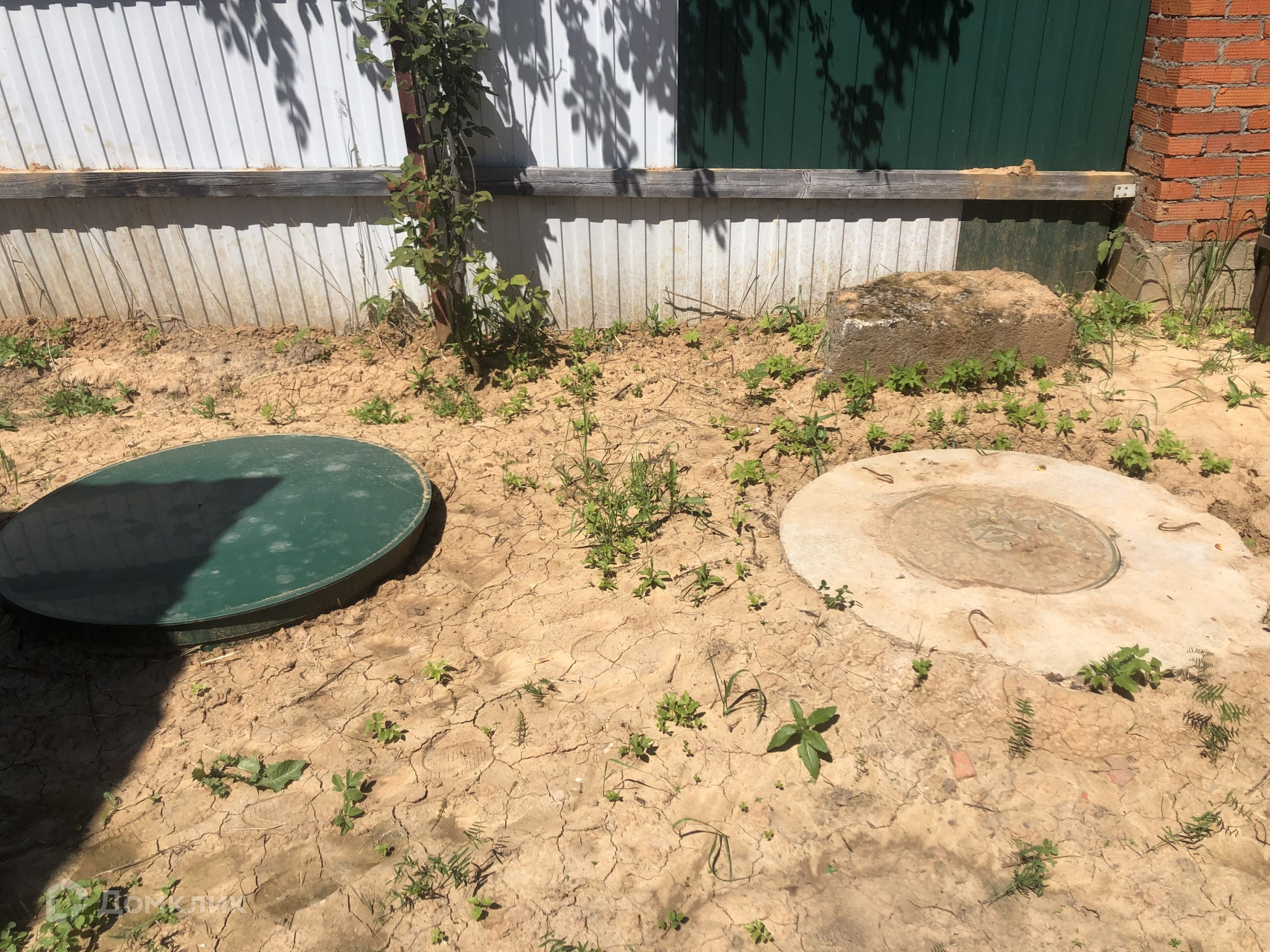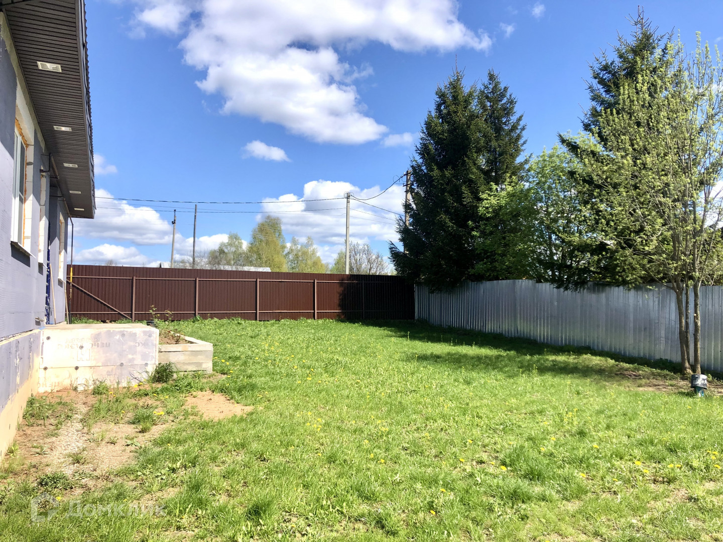 Участок прямоугольной формы, выровненный, посажен газон, есть место для ведения хозяйства или постройки бассейна.