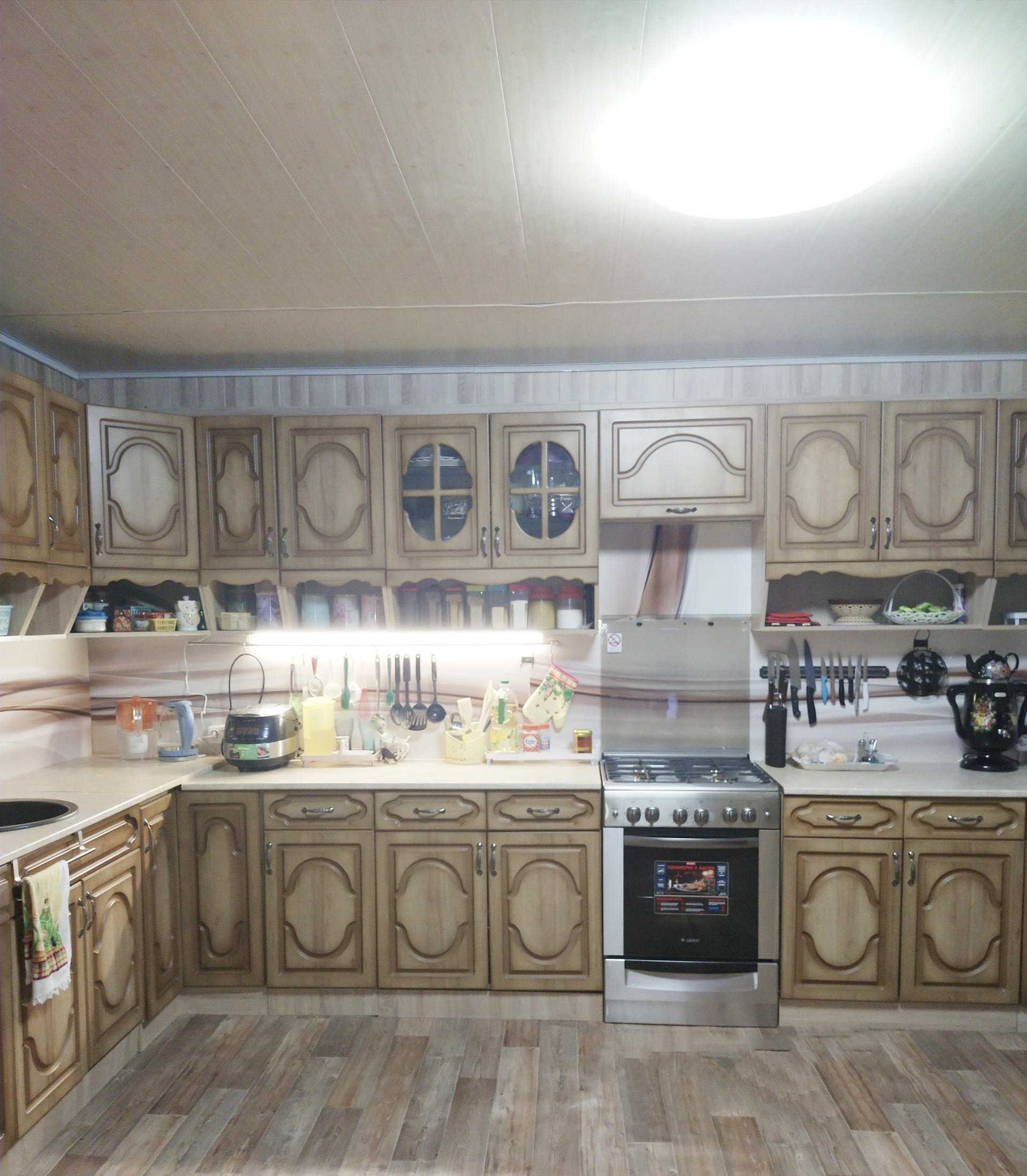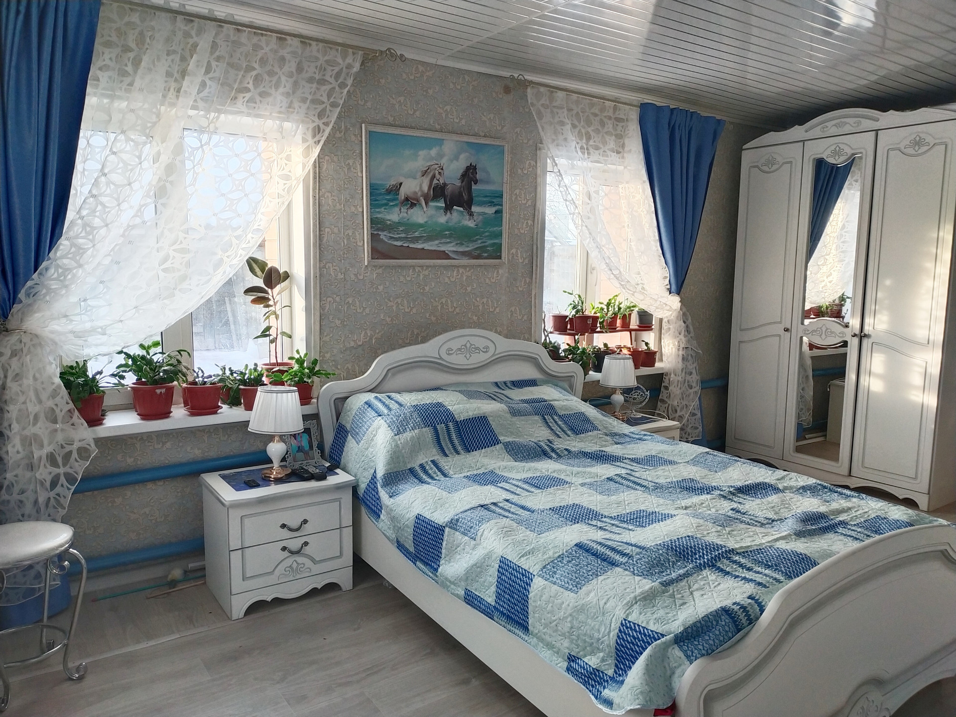 В доме гостиная с большой кухней,3 спальни,гардеробная,бойлерная.