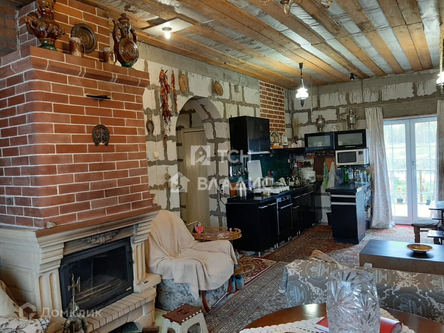 На первом этаже расположены: прихожая, гардеробная, две изолированные комнаты площадью 10,6 и 16,7 метров и просторная кухня-гостиная площадью 32,8 метров с камином. Один совмещённый санузел (площадь - 7,5 метров). Окна ПВХ.