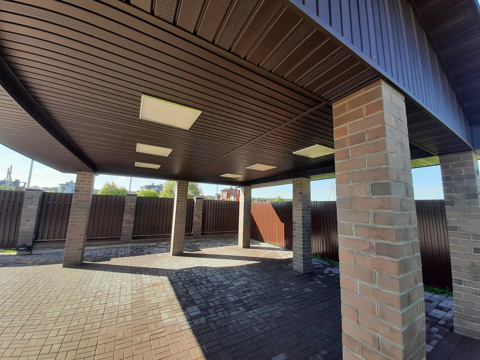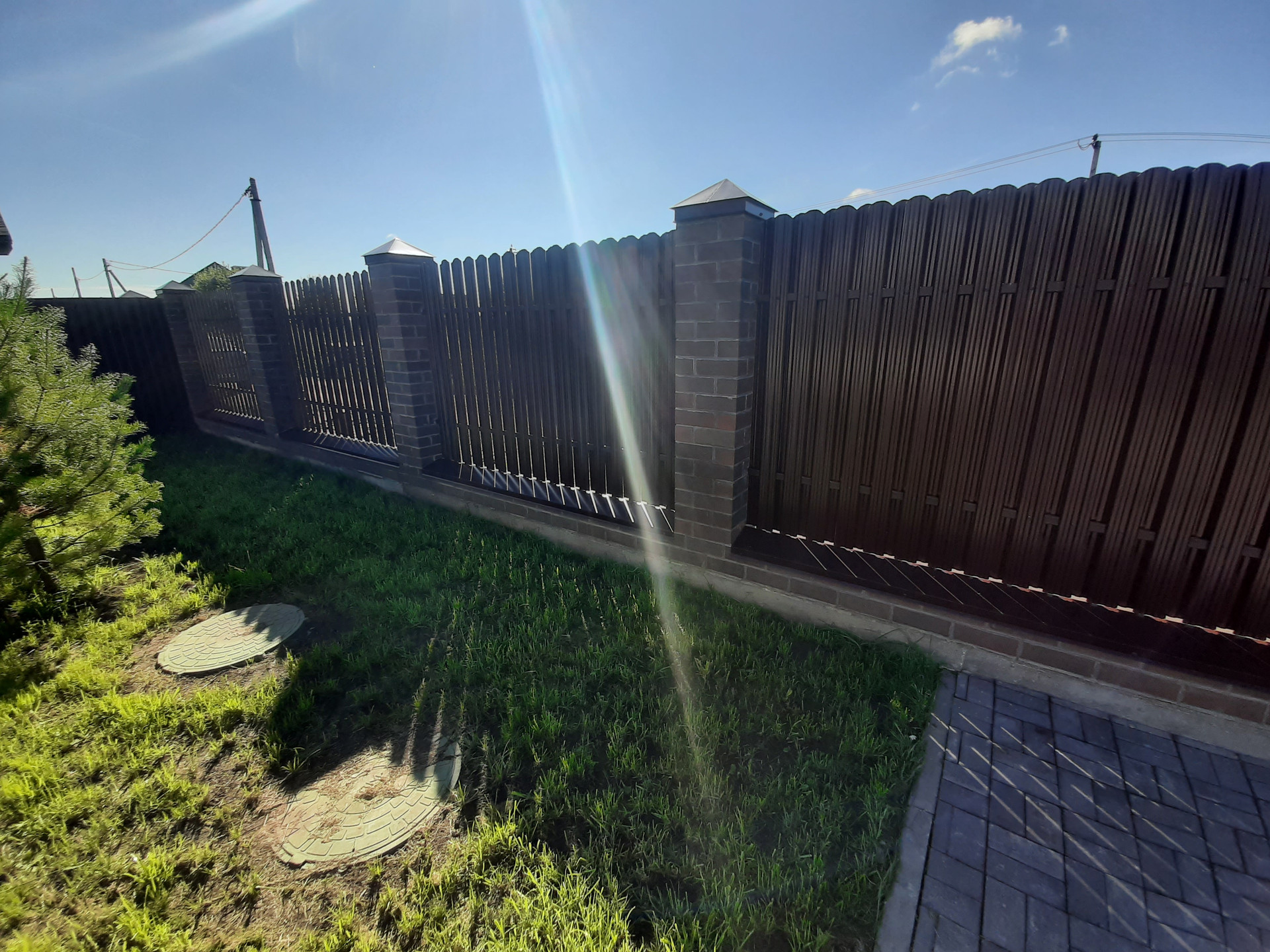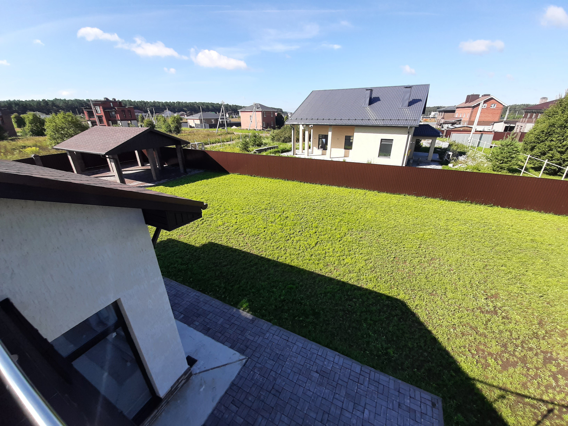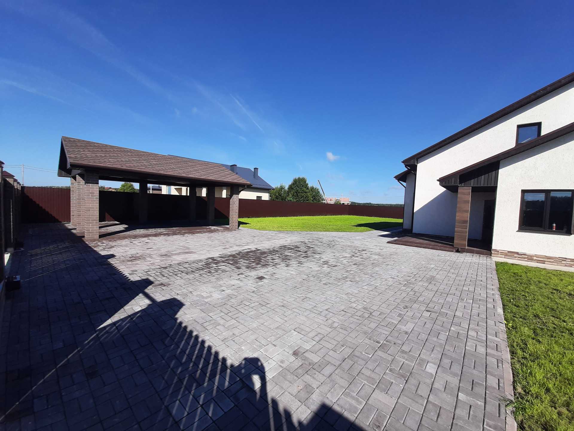 Участок огорожен забором, электрические ворота, калитка с выводом эл.кабеля под видеодомофон, открытый гараж с навесом на 2 автомобиля, площадка и дорожки вымощены брусчаткой на монолитной плите, участок полностью благоустроен, засеян газоном, растут сосны, клумба у крыльца.