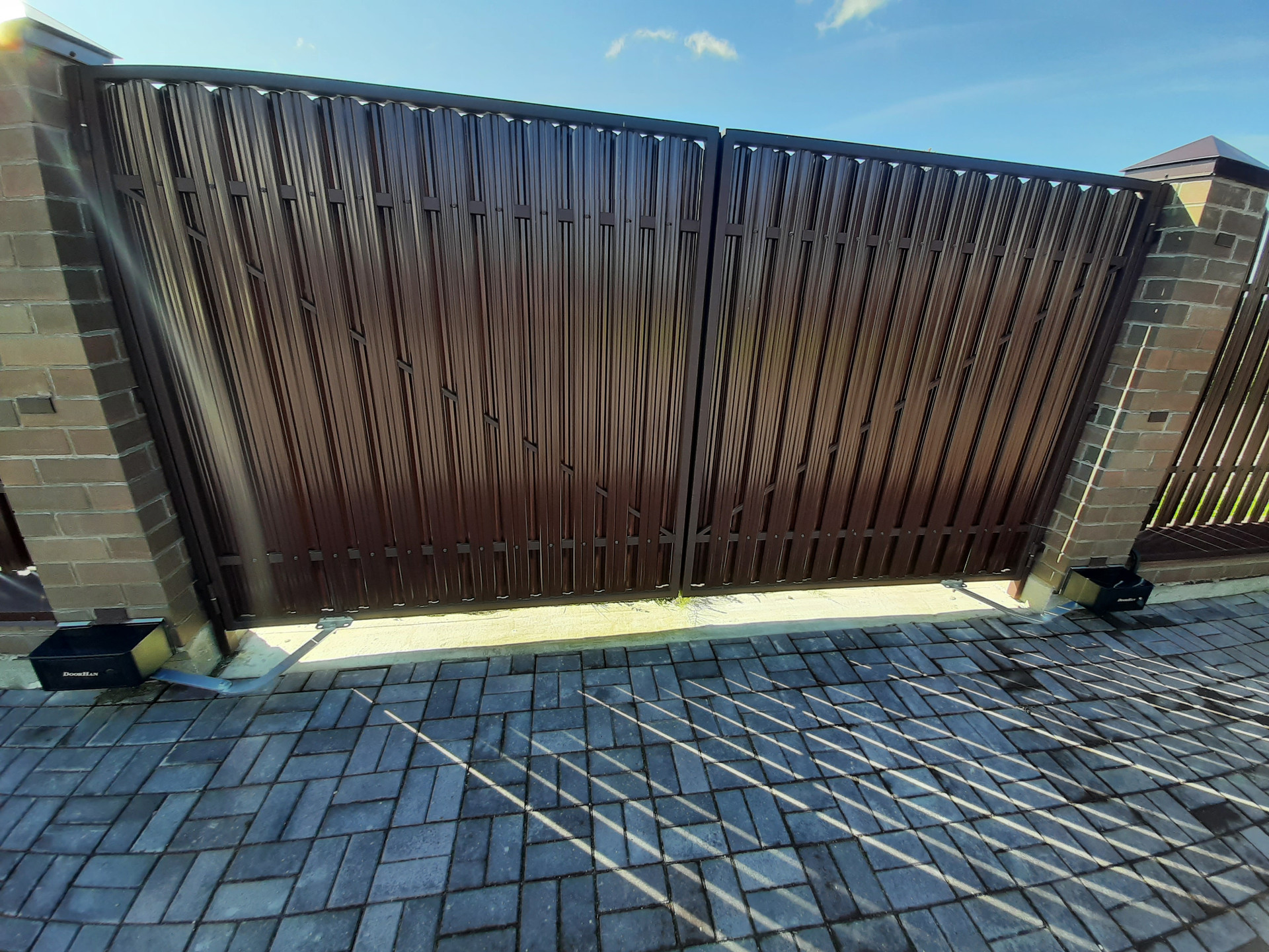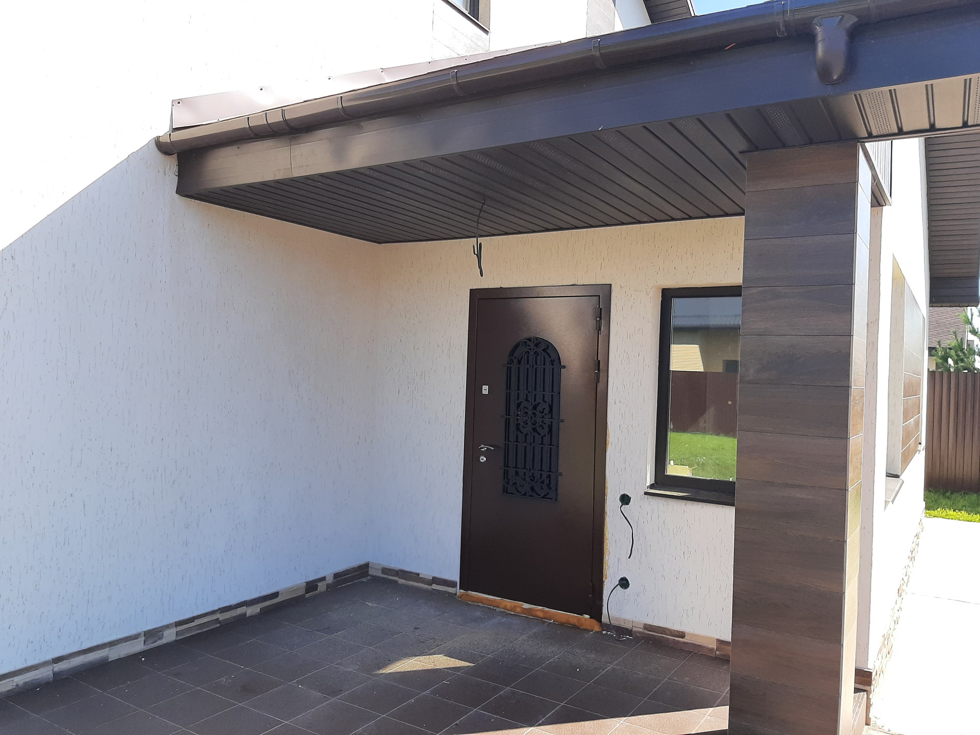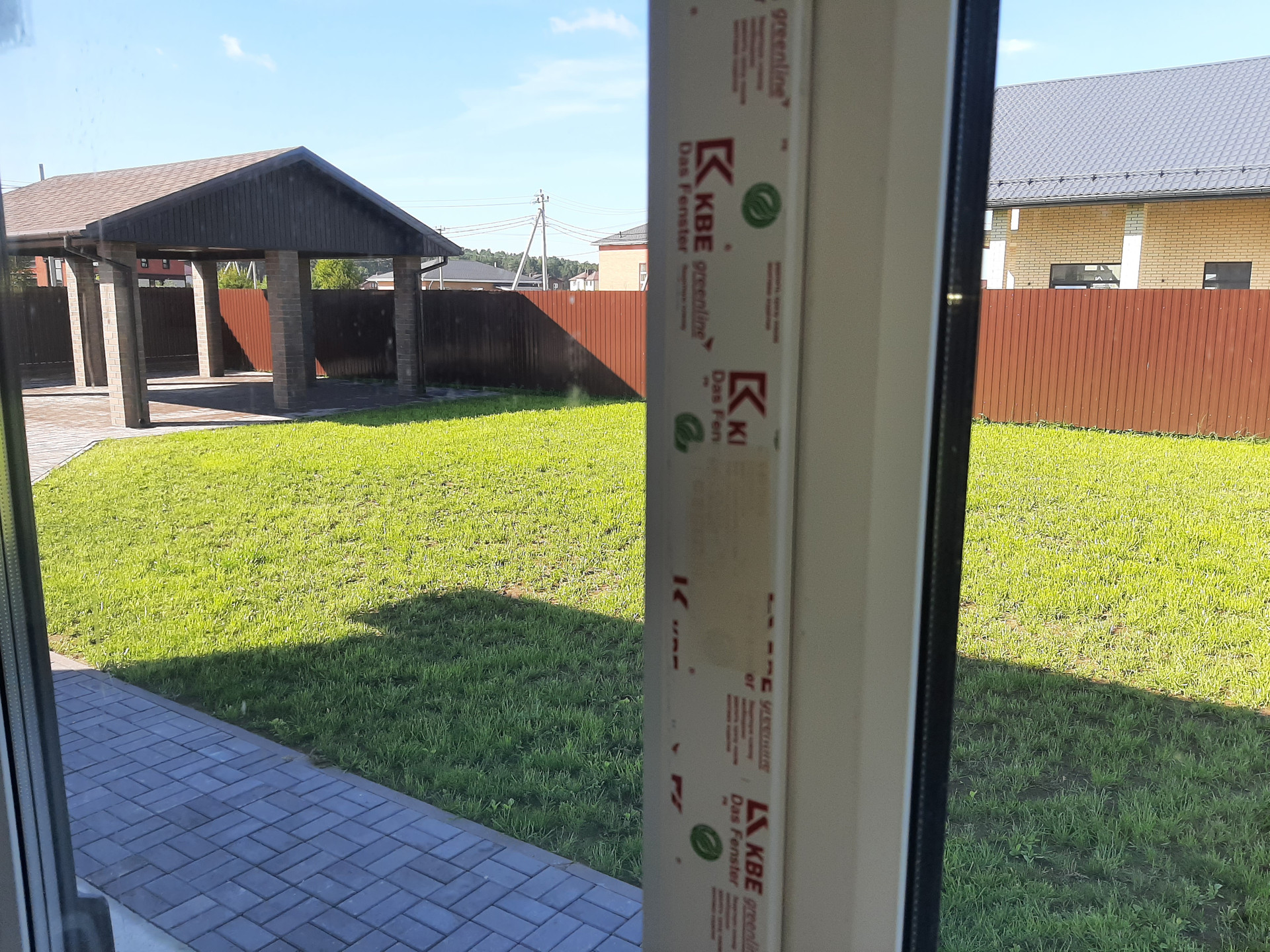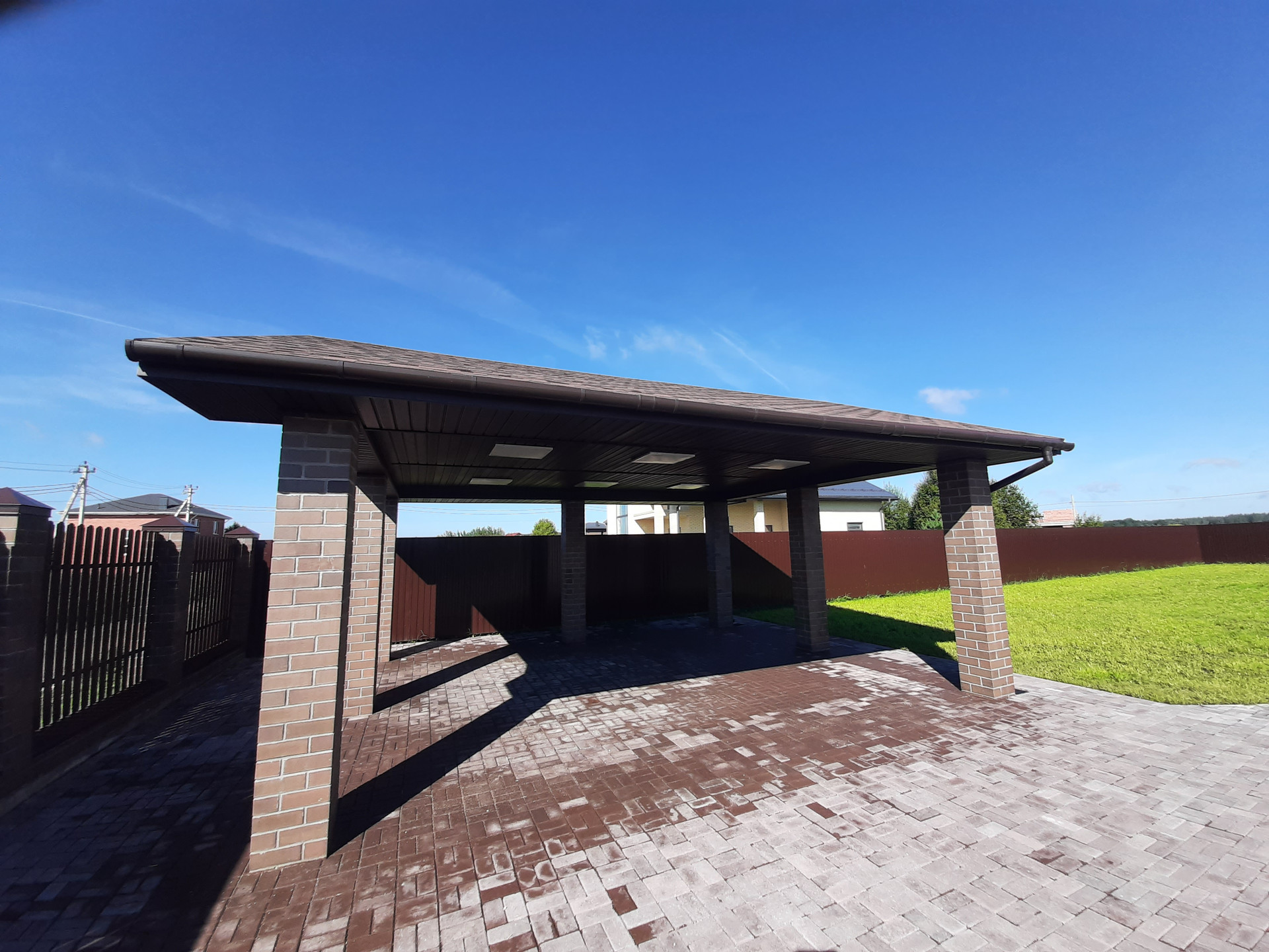 Участок огорожен забором, электрические ворота, калитка с выводом эл.кабеля под видеодомофон, открытый гараж с навесом на 2 автомобиля, площадка и дорожки вымощены брусчаткой на монолитной плите, участок полностью благоустроен, засеян газоном, растут сосны, клумба у крыльца.