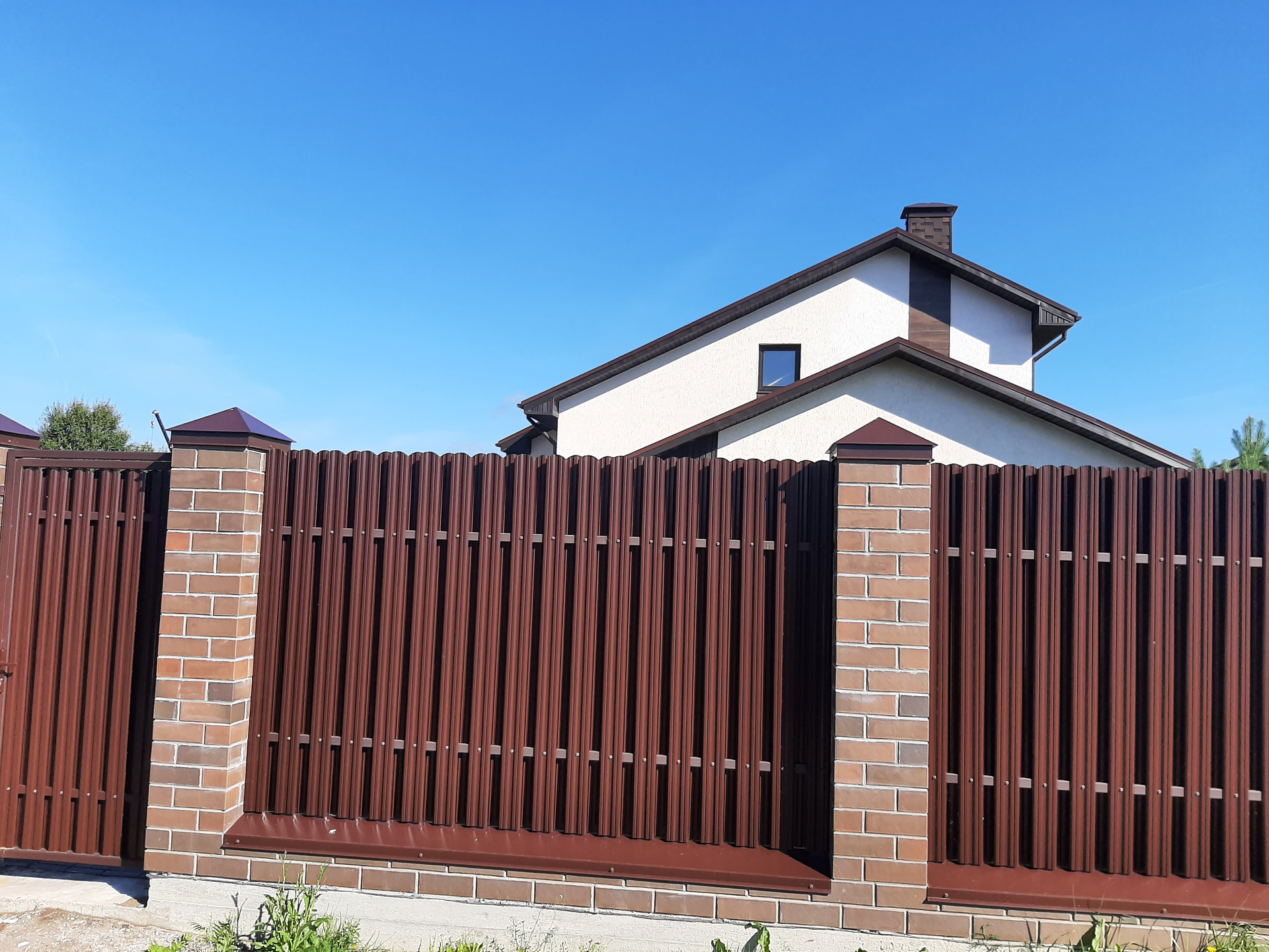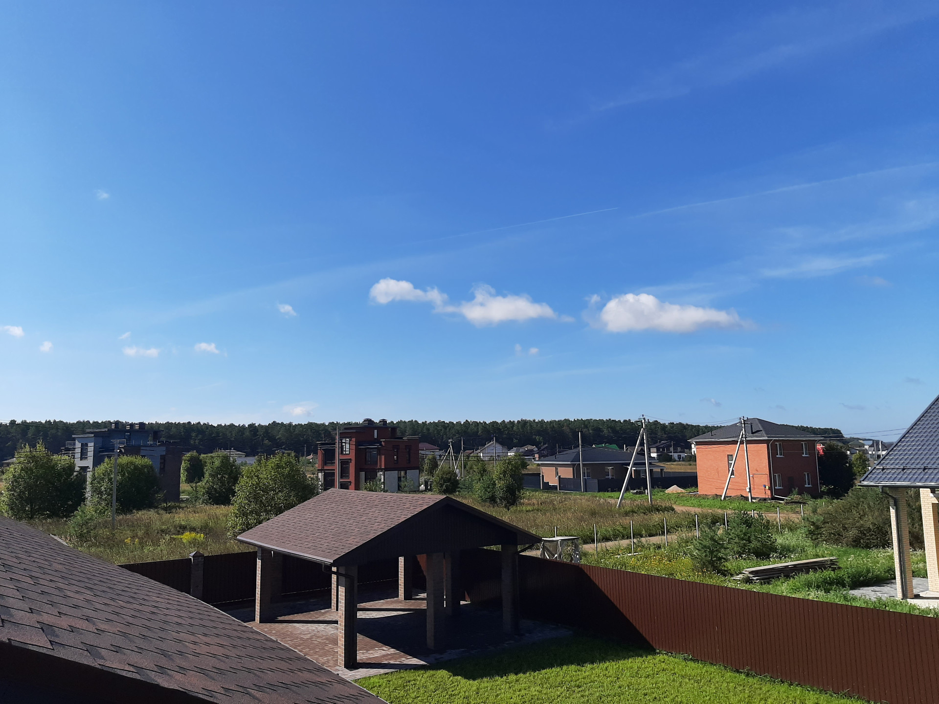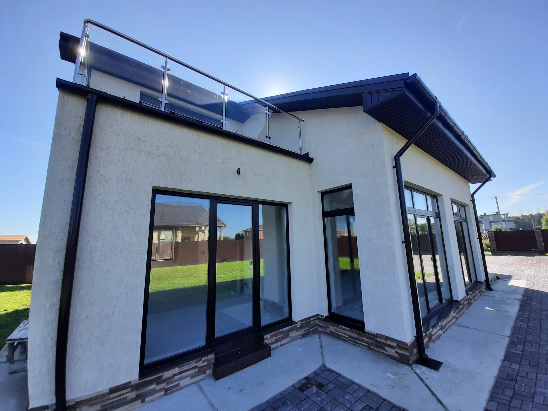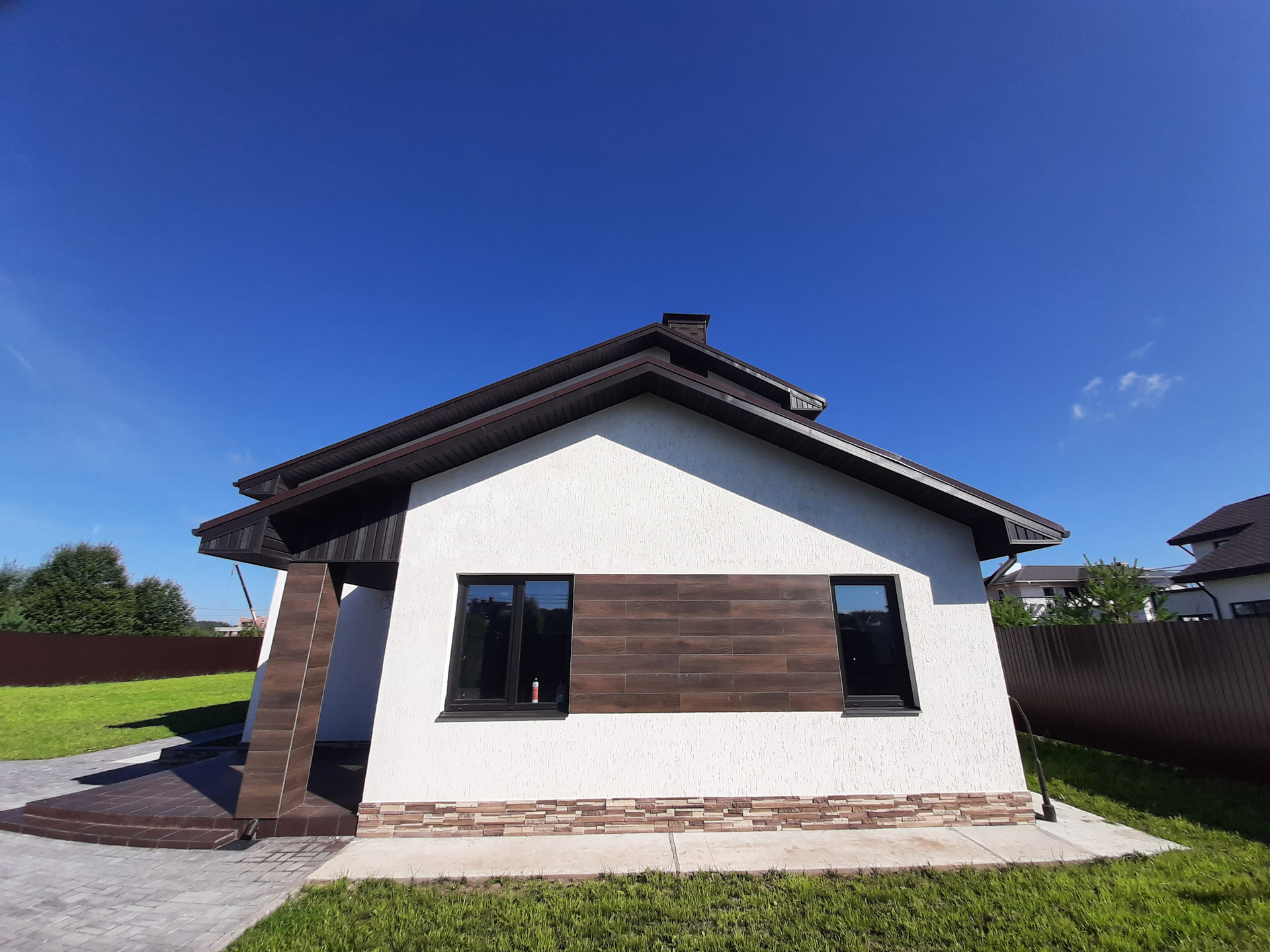 Участок огорожен забором, электрические ворота, калитка с выводом эл.кабеля под видеодомофон, открытый гараж с навесом на 2 автомобиля, площадка и дорожки вымощены брусчаткой на монолитной плите, участок полностью благоустроен, засеян газоном, растут сосны, клумба у крыльца.