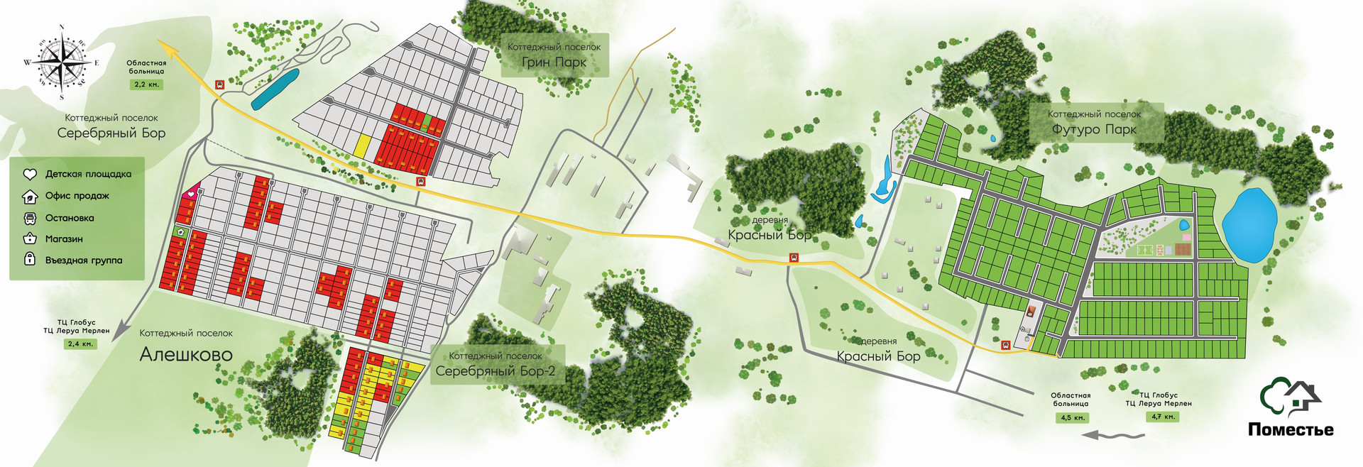 От поселка в 2 км находится Областная больница, 2 км Гипермаркет Глобус, Леруа Мерлен, рядом Школа № 83, школа № 59, детский сад №191, детский сад №112. Остановка маршрутного такси №132.. Рядом сосновый бор, лесопарковая зона.