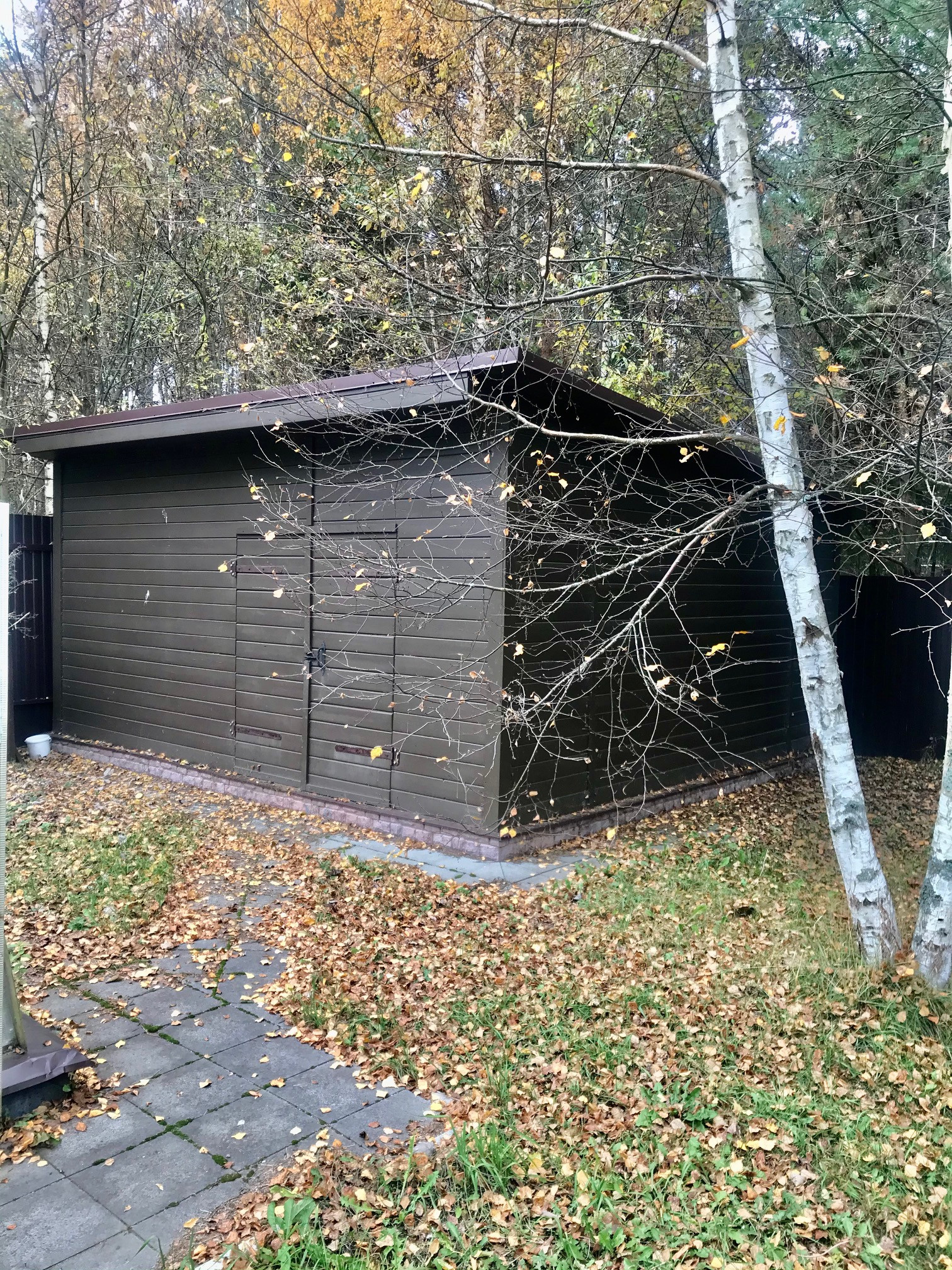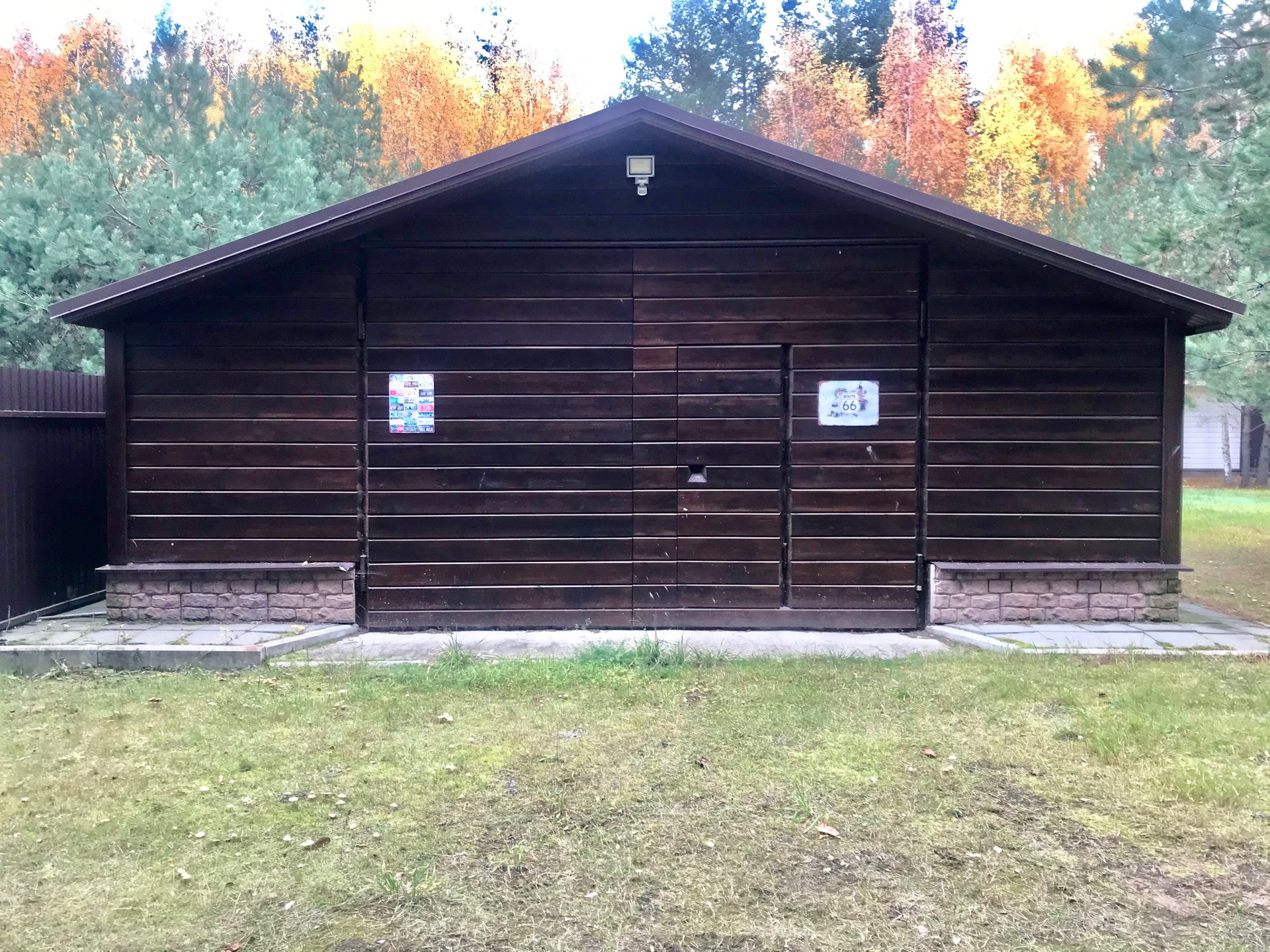 ​Гараж металлический, утеплен и обшит имитацией бруса.