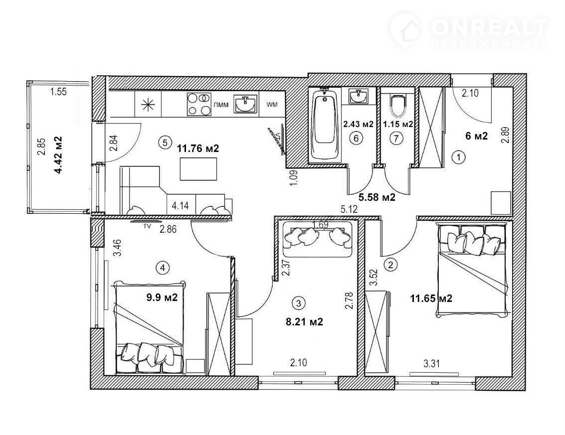 Площадь без балкона - 56,75 м2