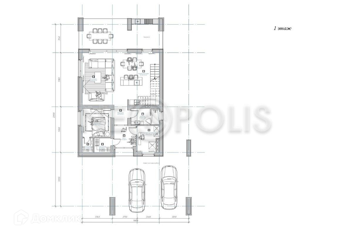 1 этаж: прихожая, кухня-столовая, гостиная, спальня с ванной комнатой, санузел, бойлер.