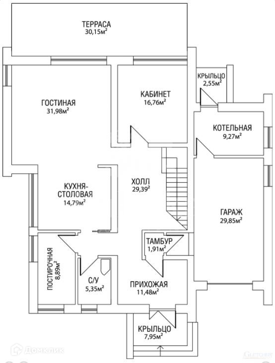 первый этаж - гостиная, кухня-столовая, кабинет, постирочная, с/у