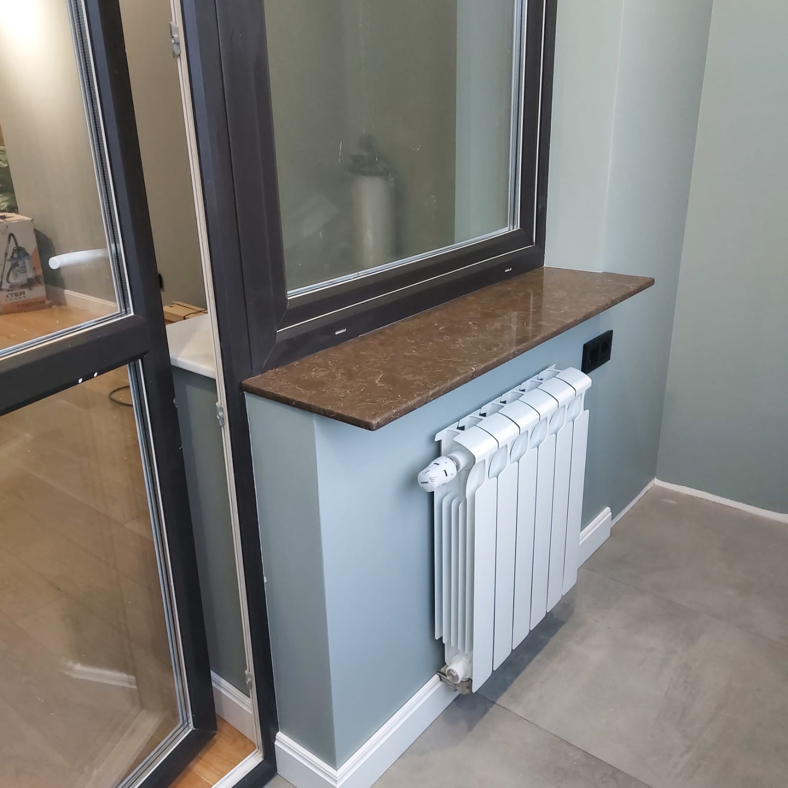 ЛОДЖИЯ (3,5 м2) - утеплена по всему периметру, полу и потолку, установлено панорамное остекление из металло-пластикового профиля (Rehau) c 2-х камерным стеклопакетом. Выведен радиатор отопления (6 секций). Лоджия очень теплая, проверено крещенскими морозами, в минус 22 градуса регулятор тепла радиатора устанавливался не на всю мощность. Натяжной потолок, на полу керамогранит со встроенным теплым полом. Установлен широкий подоконник из кварцевого агломерата.