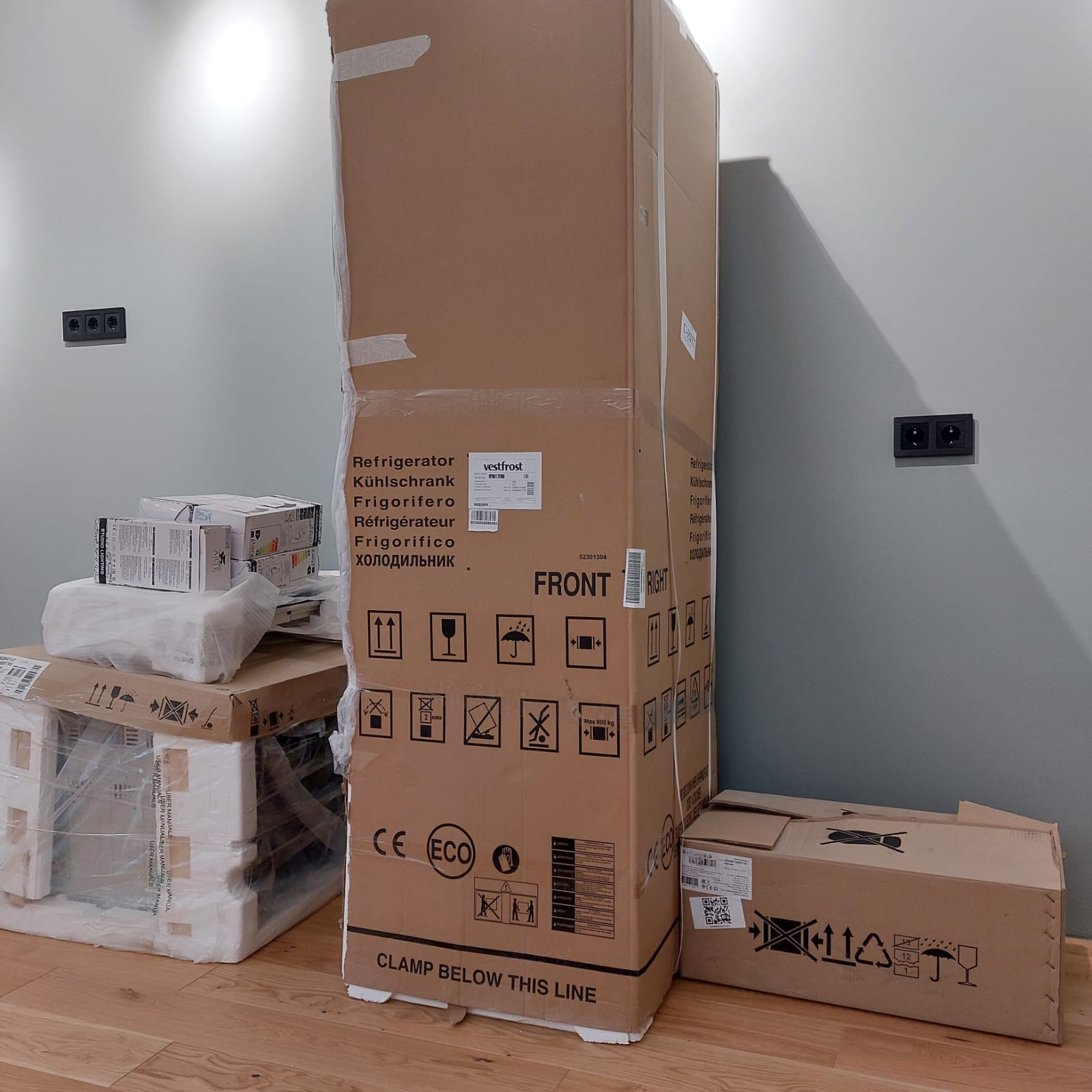 Встраиваемый холодильник VESTFROST с системой No Frost в морозильной камере - стоит в упаковке на квартире.