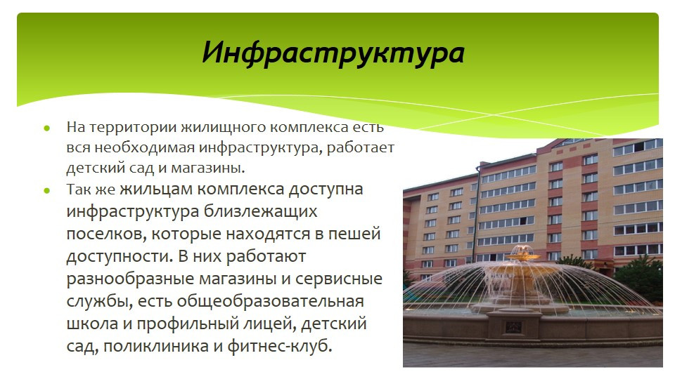 • Так же жильцам комплекса доступна инфраструктура близлежащих поселков,