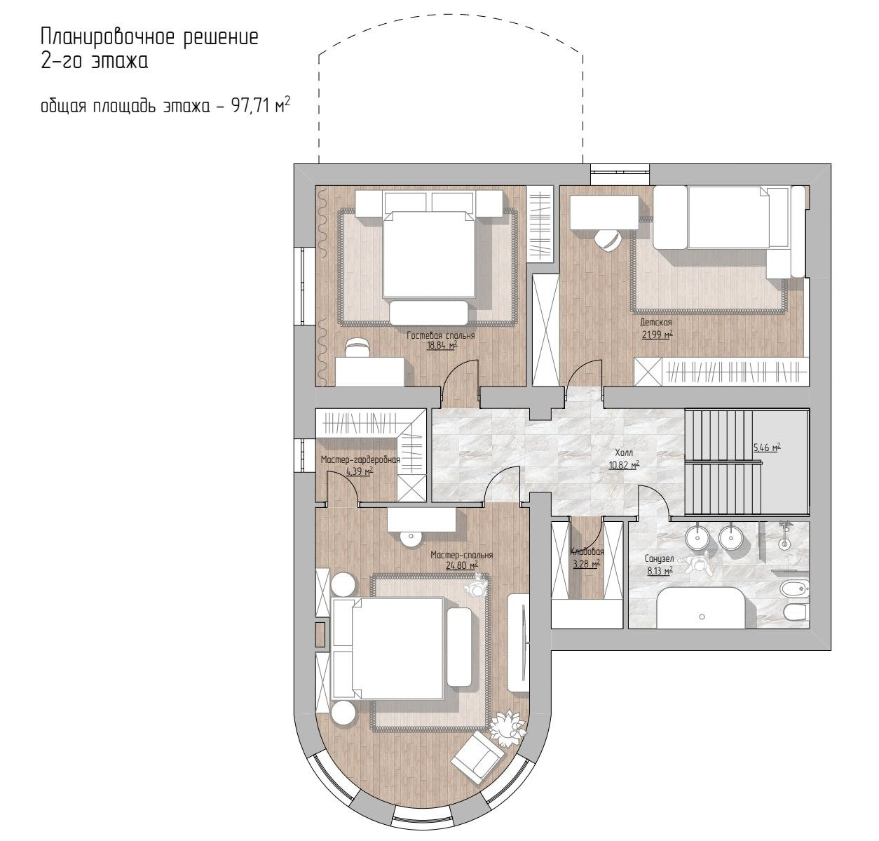 2 этаж: хозяйская спальня с гардеробной, 2 детских, просторный санузел и кладовая, из которой можно сделать еще один санузел.