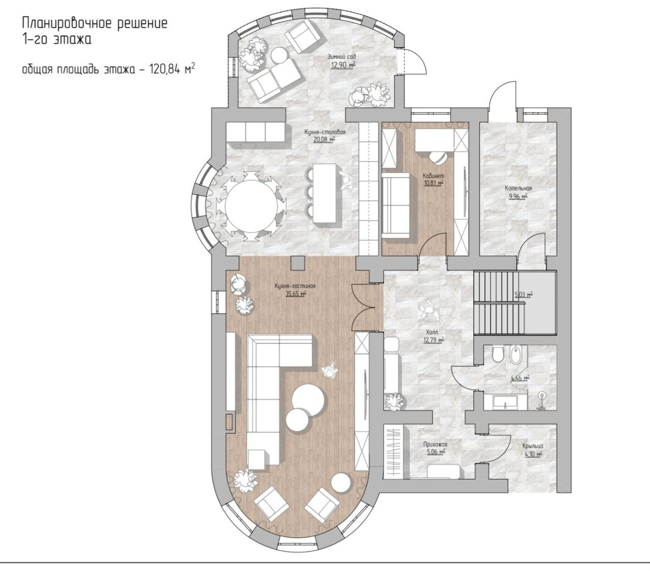 1 этаж: большая зона кухни-столовой-гостиной, с/у, гардеробная, котельная, выполняющая функции подсобного помещения, кабинет/спальня.