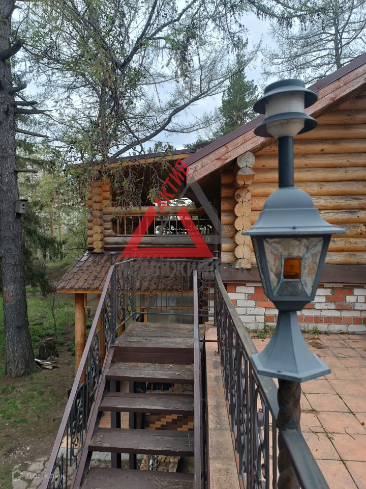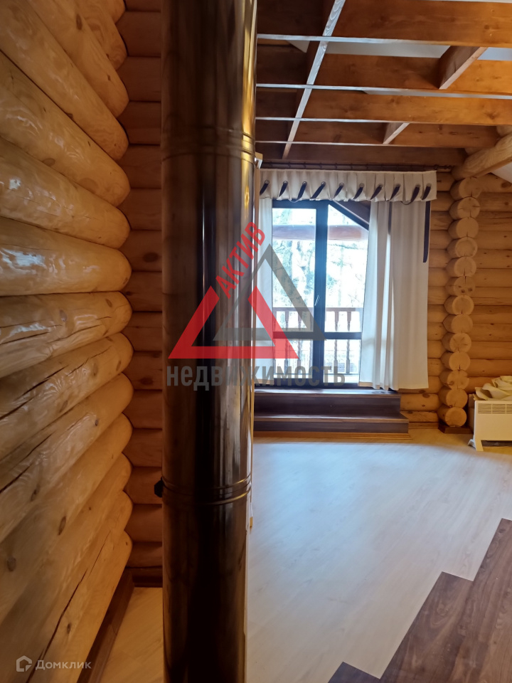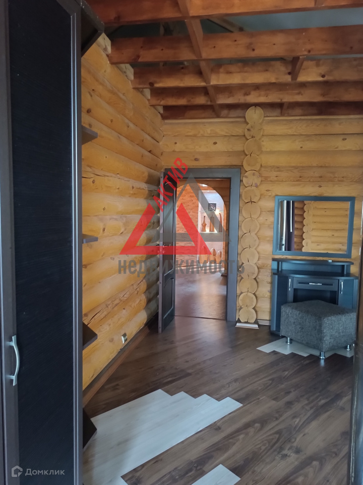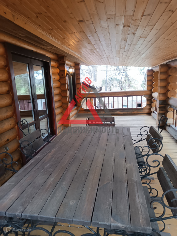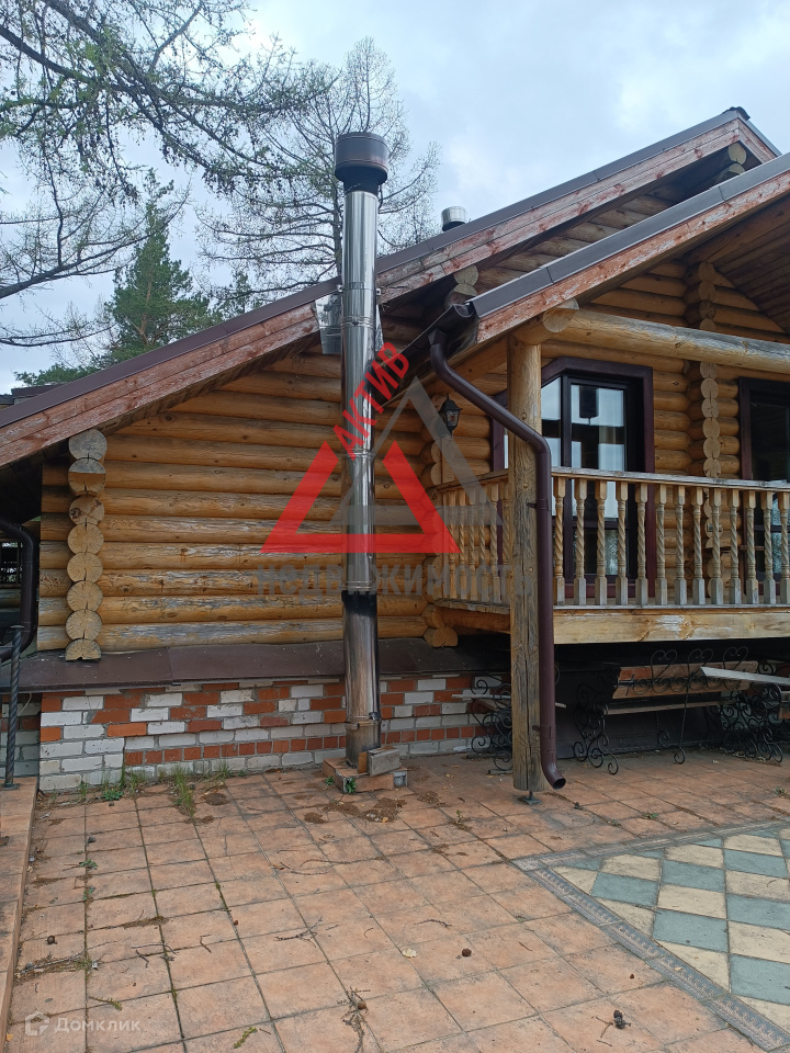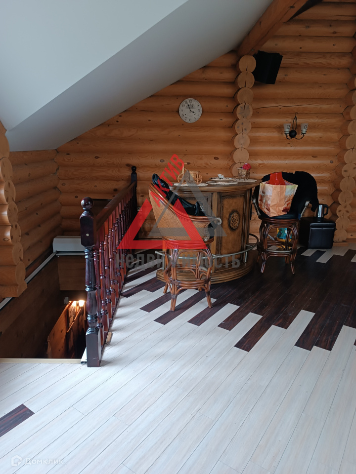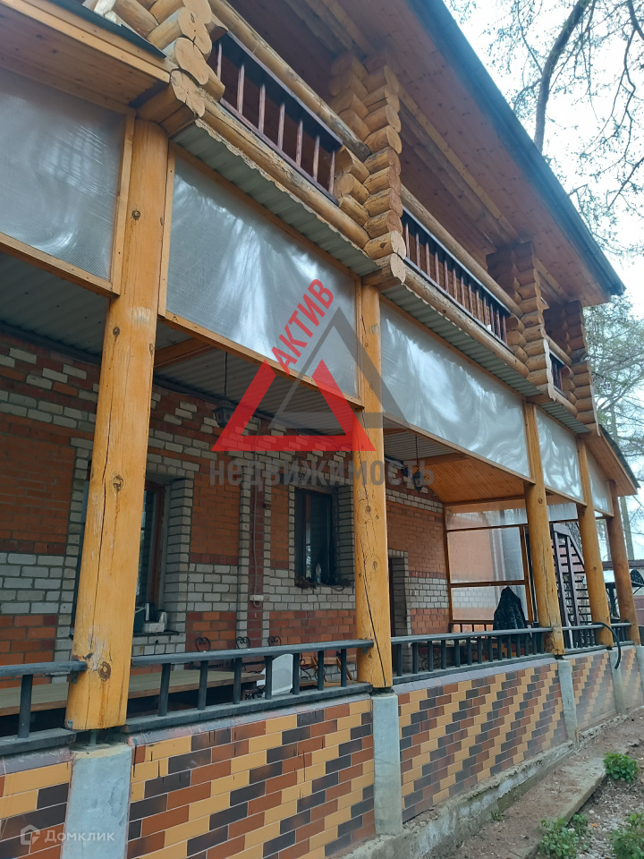 Первый этаж выполнен из кирпича, второй из оцилиндрованного бревна.