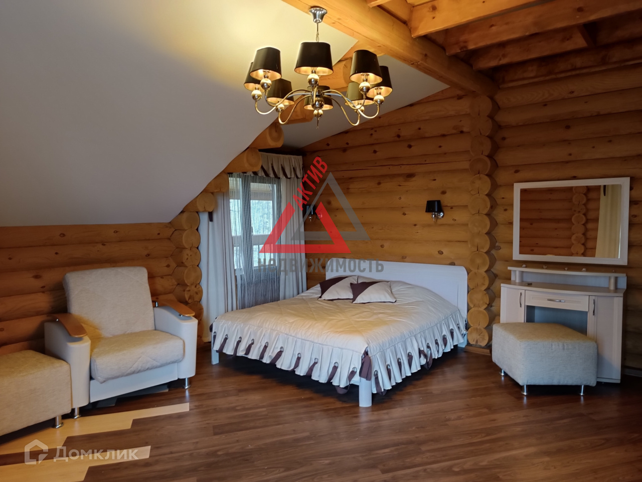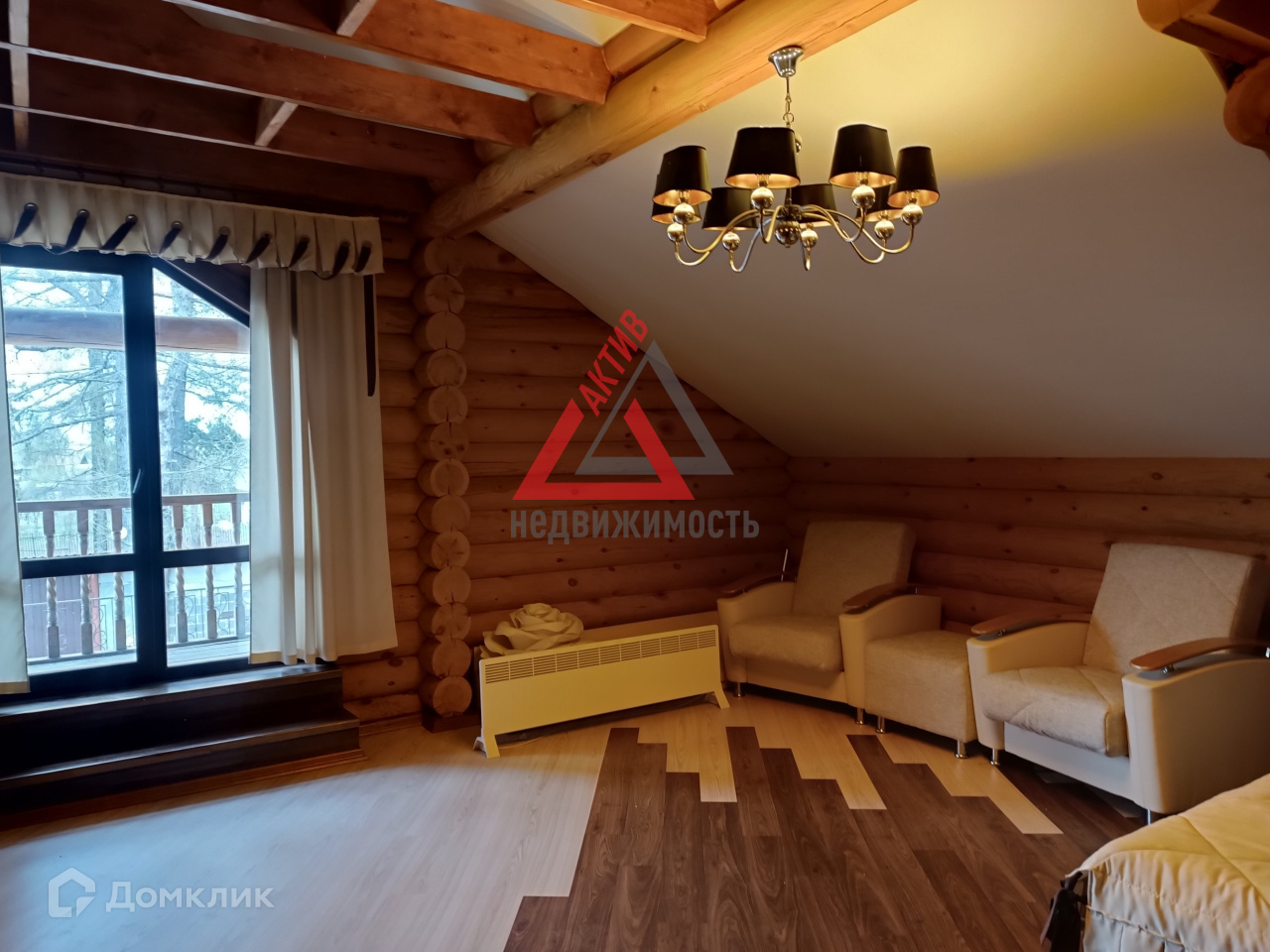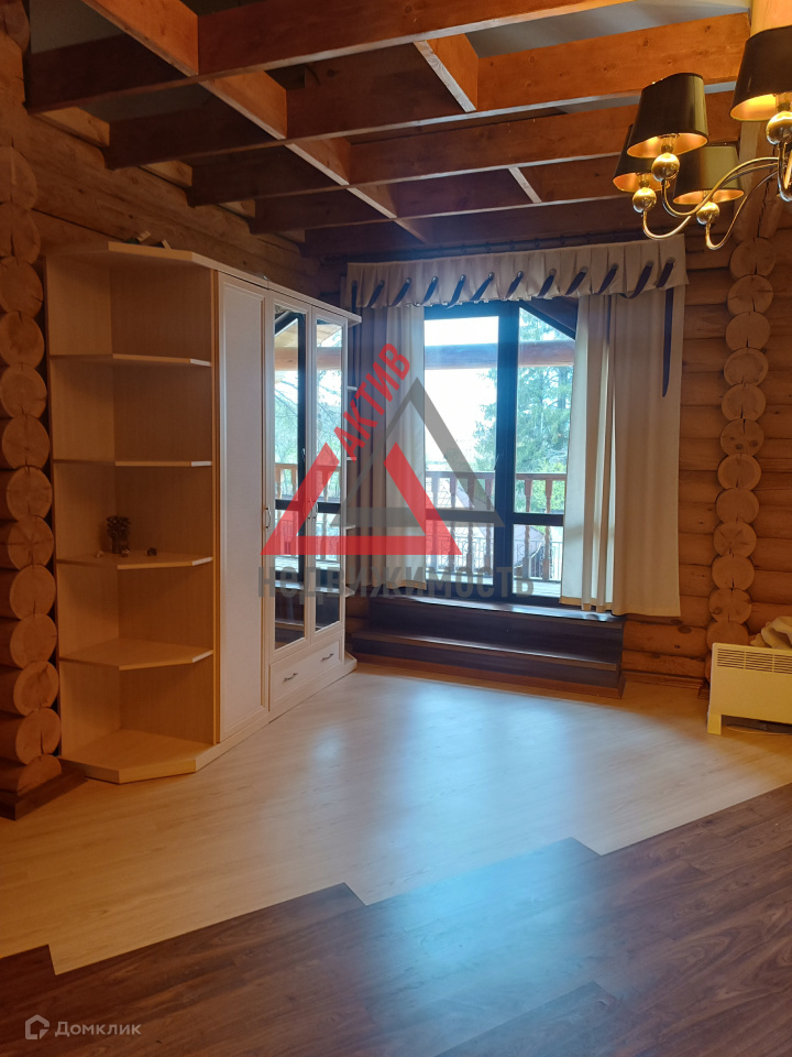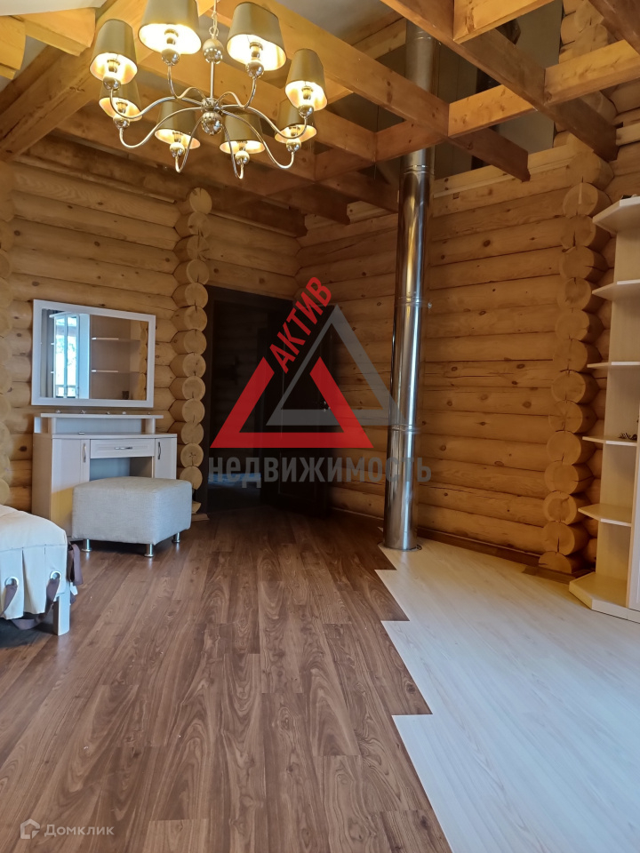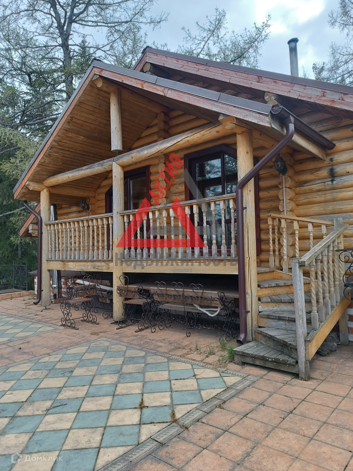 Первый этаж выполнен из кирпича, второй из оцилиндрованного бревна.
