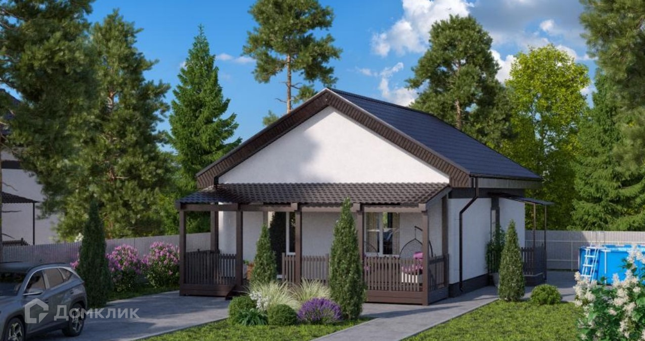 Дом одноэтажный 52 кв.м. из газобетонных блоков с утеплением, снаружи декоративная фактурная штукатурка фасада.