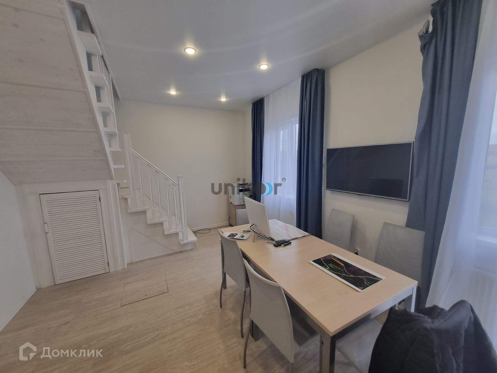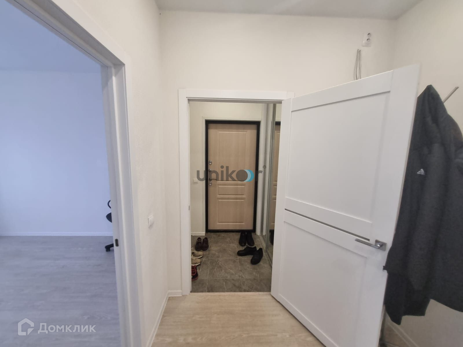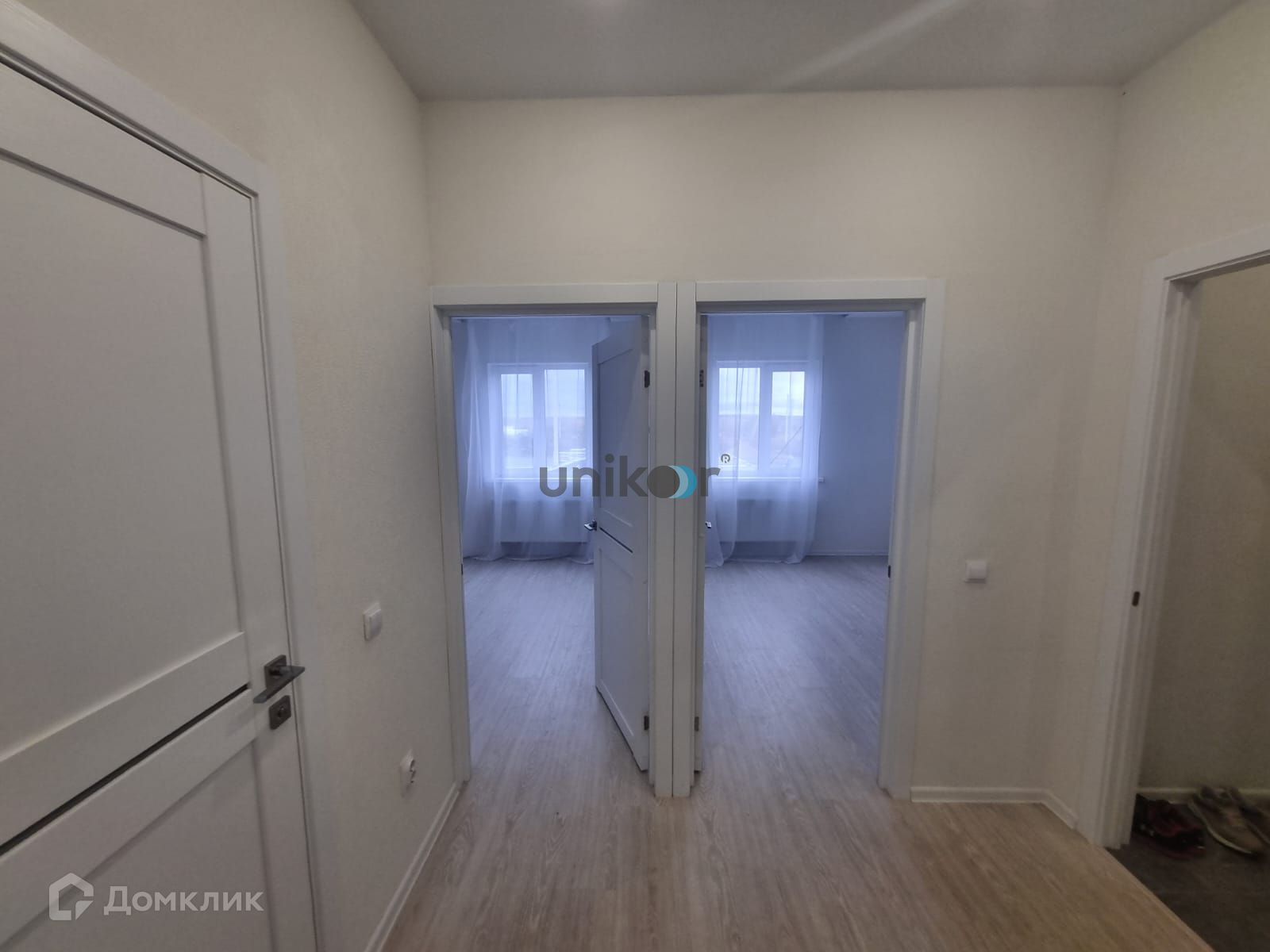 Установлены светлые двери с красивой фурнитурой. Ламинат 33-го класса прочности. Натяжной потолок с точечным освещением. В ванне на полу плитка, на стенах уложен кафель. В прихожей на полу плитка, установлен шкаф купе, где спрятаны все коммуникации.
