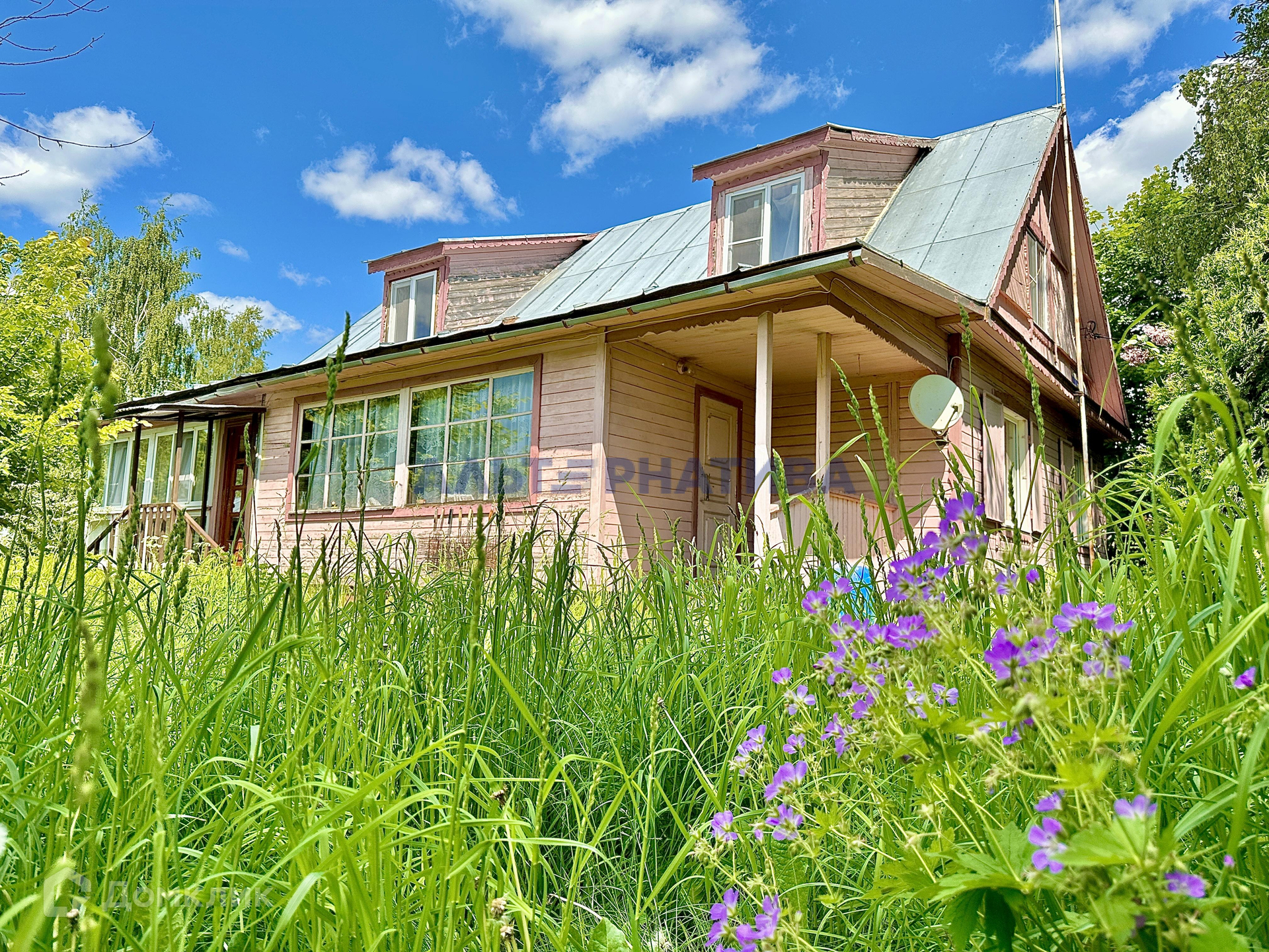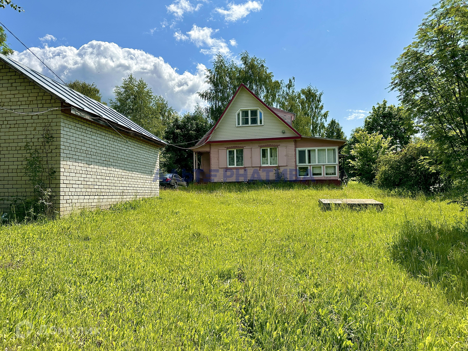 Сам дом 1996 года постройки. Построен из бруса. Облицован имитацией бруса. Фундамент ленточный. Есть большое подполье высотой 2 метра. Кровля фальцевая. Нигде не течет.