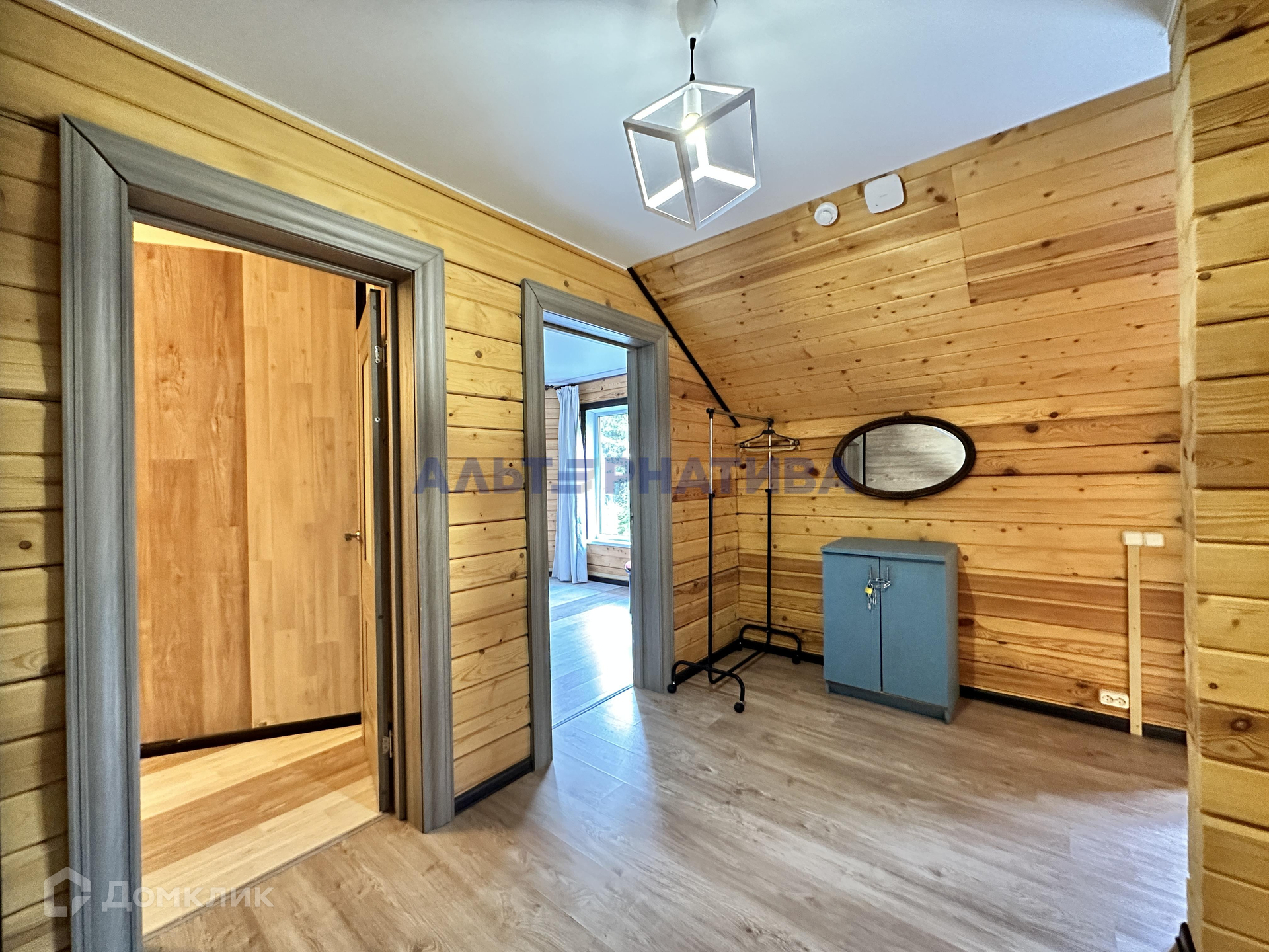 Первый этаж включает в себя веранду,  тамбур, холл, гостиную совмещенную с кухней, санузел и гостевую комнату. На втором этаже расположены три спальни и большой совмещенный санузел. Внутренняя отделка выполнена с использованием натуральных материалов, создавая атмосферу комфорта и уюта.