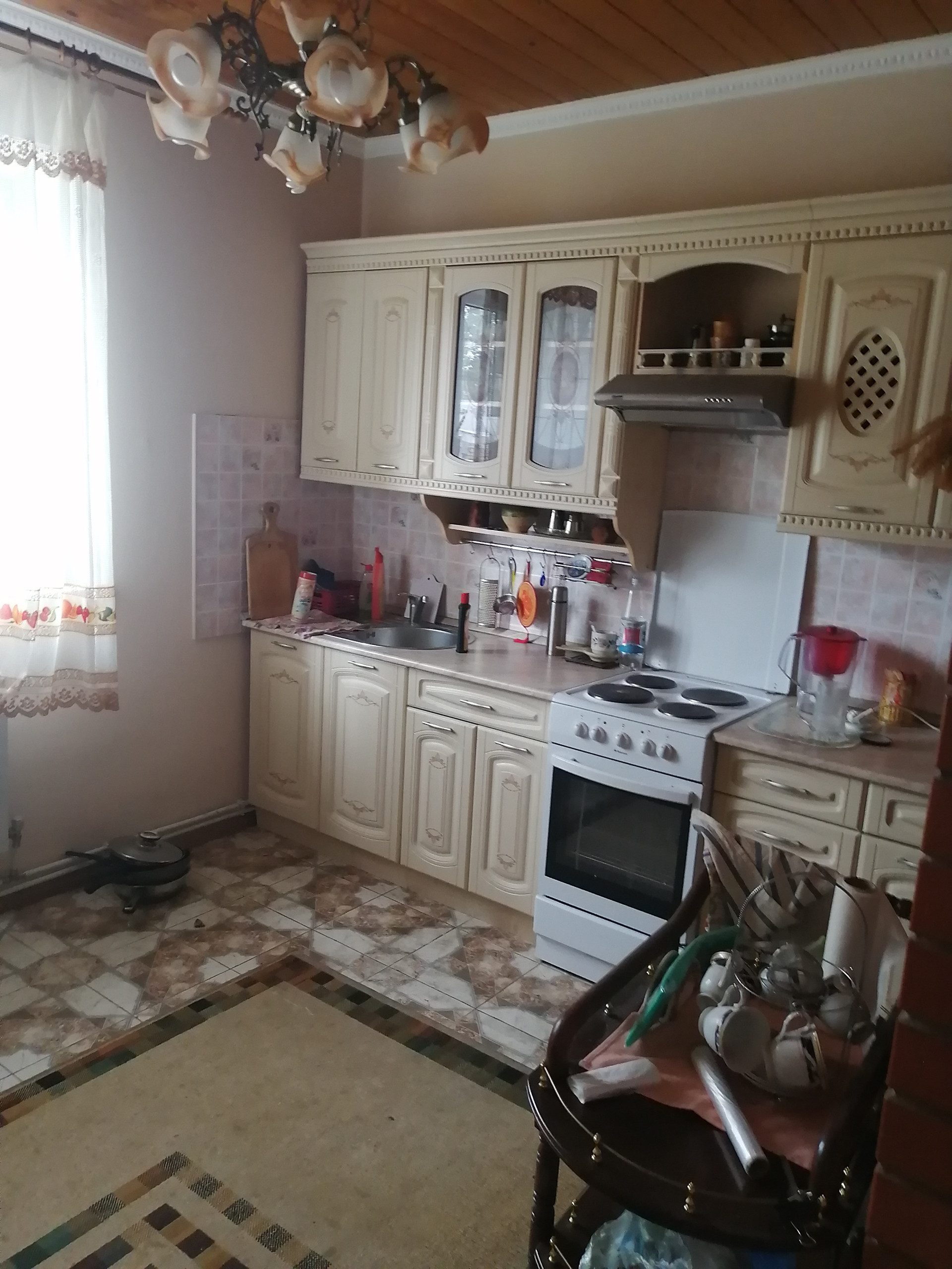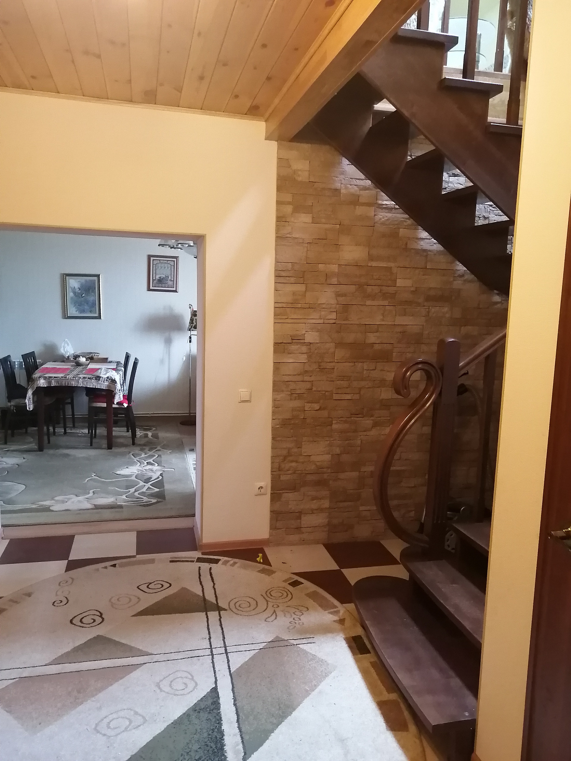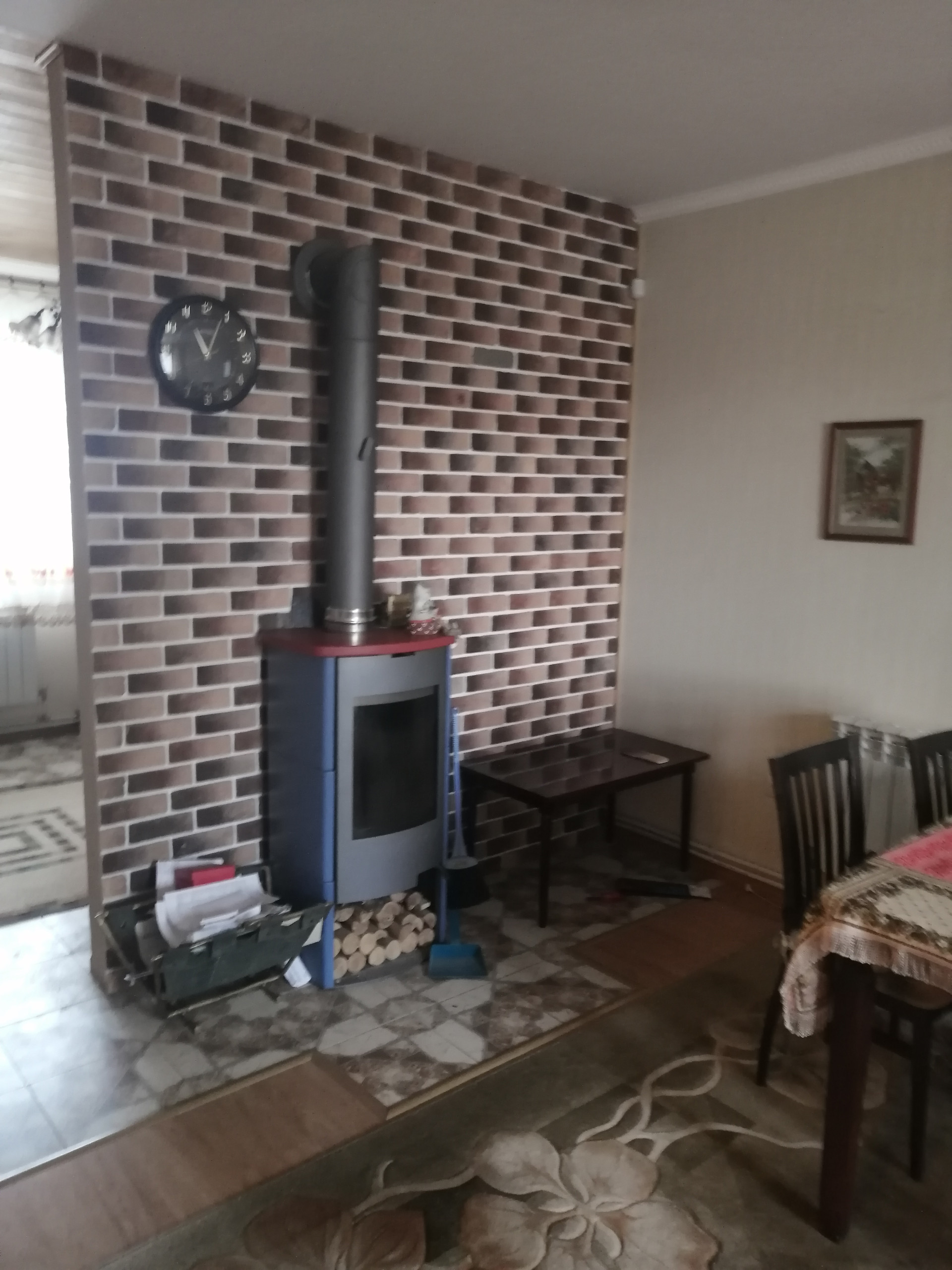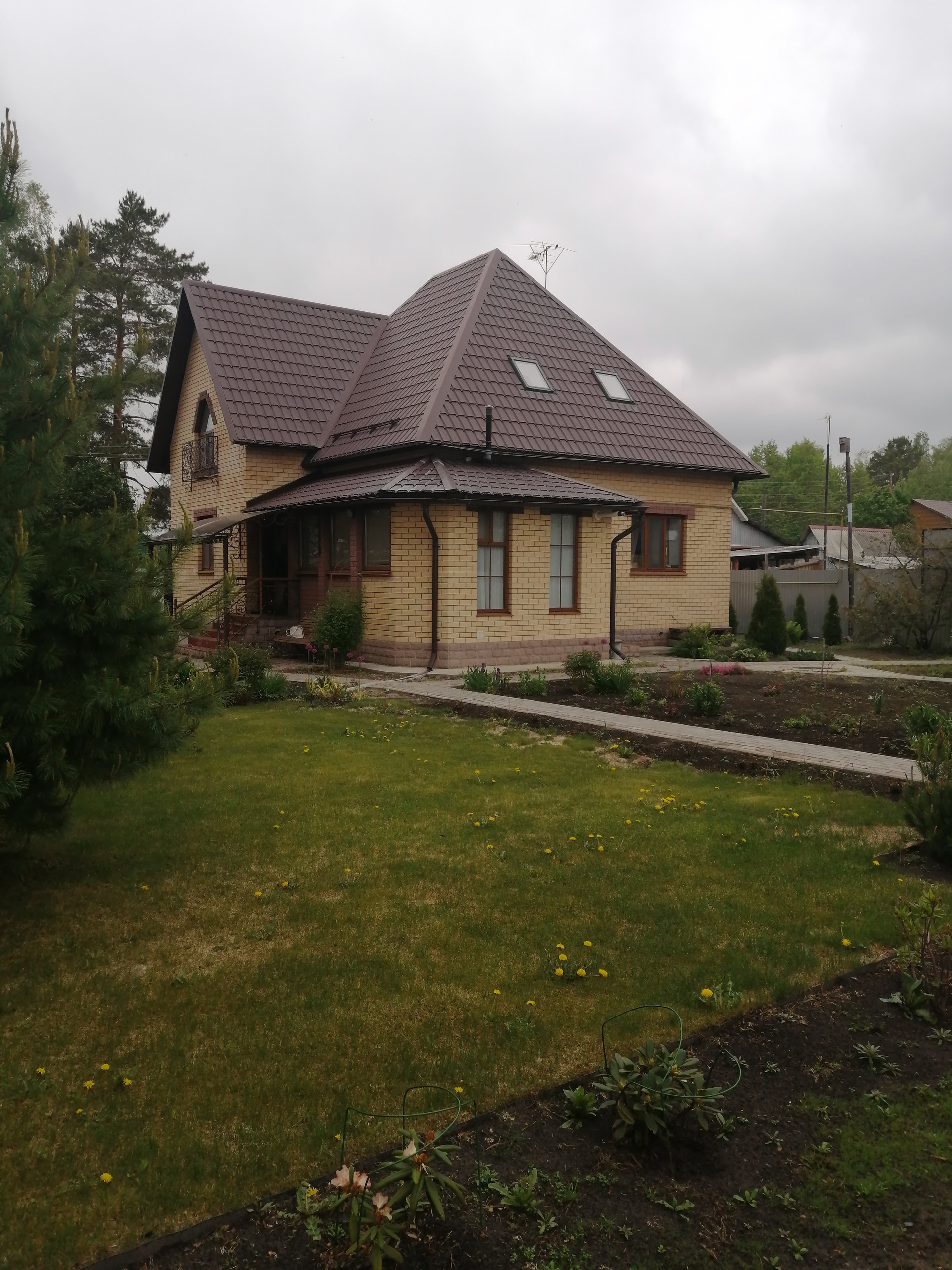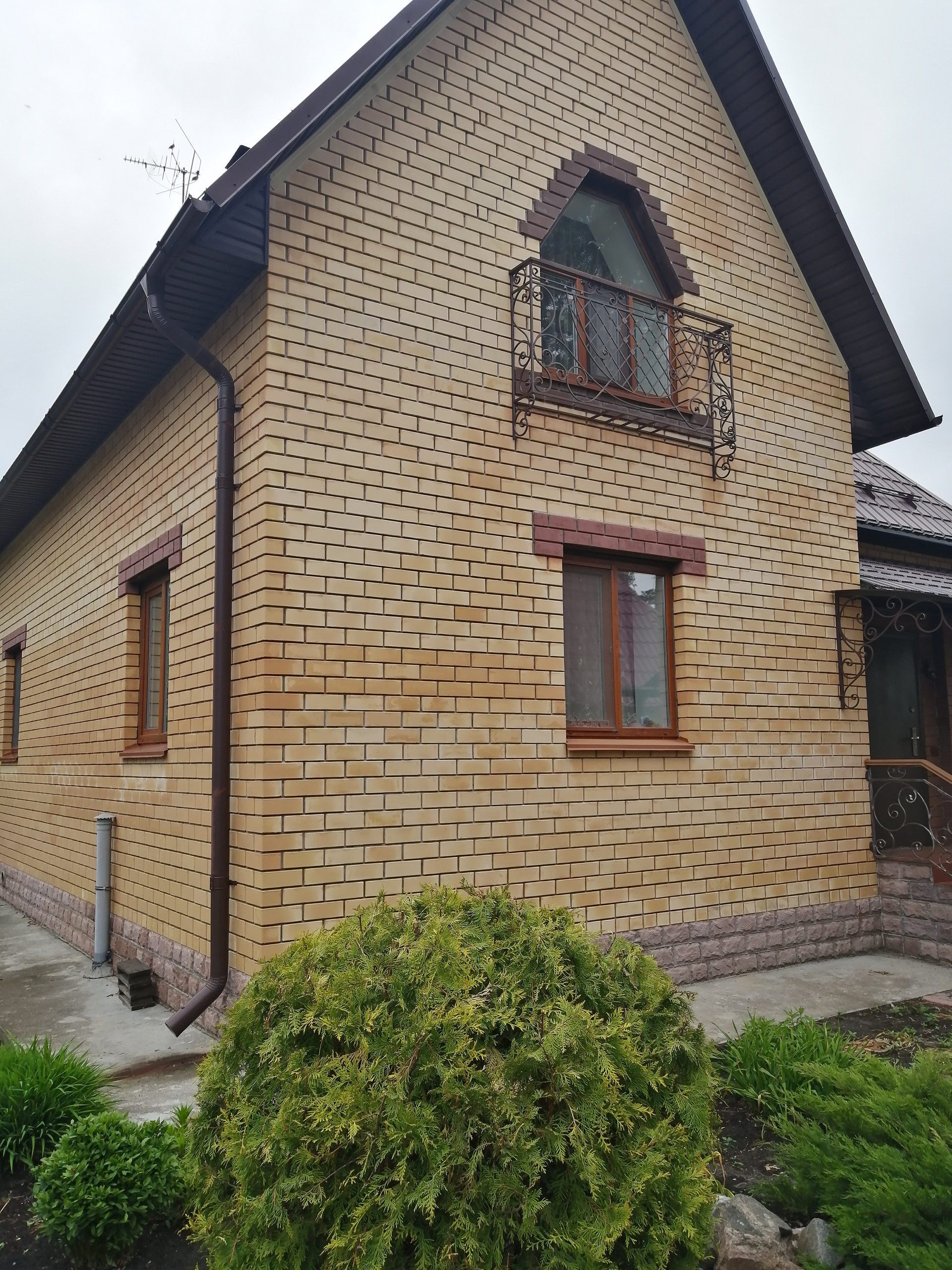 Дом построен из керамзитоблоков, с утеплителем и обложен кирпичом. На первом этаже гостиная, кухня и спальная комната. На втором этаже гостиная и две спальни.