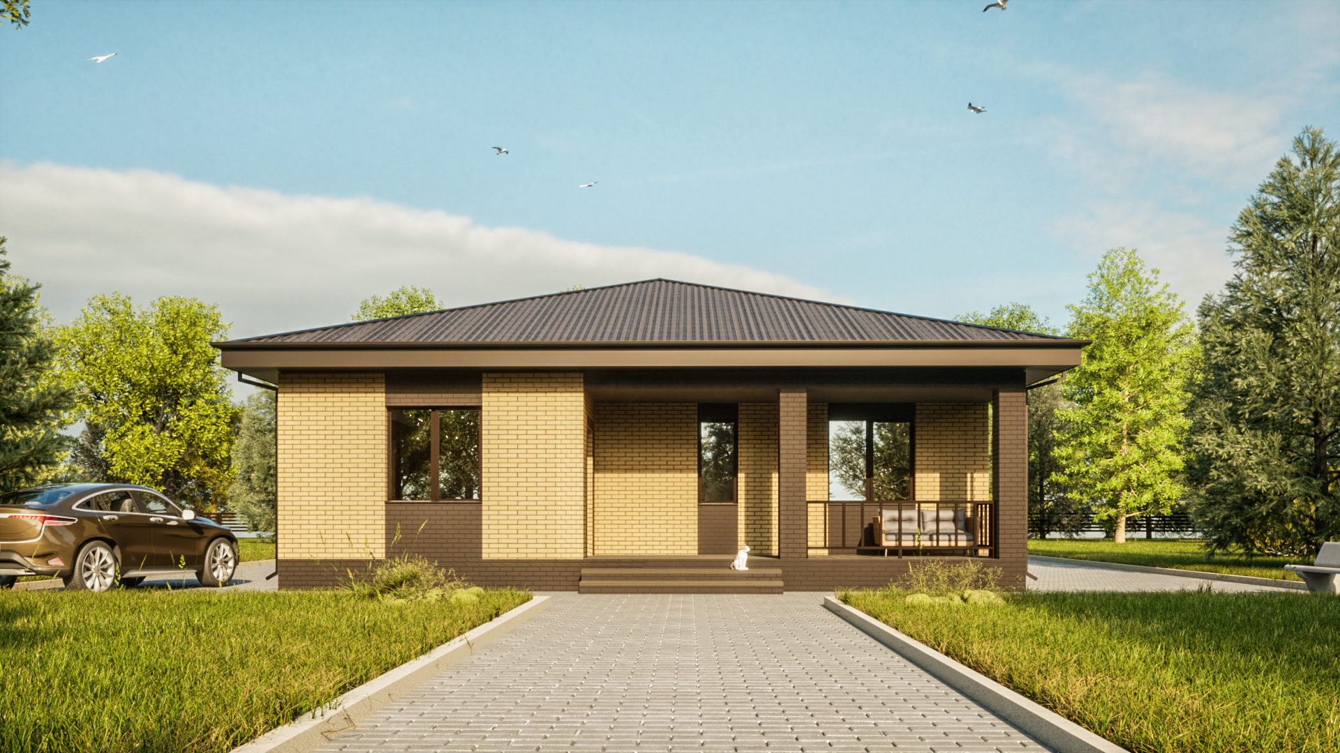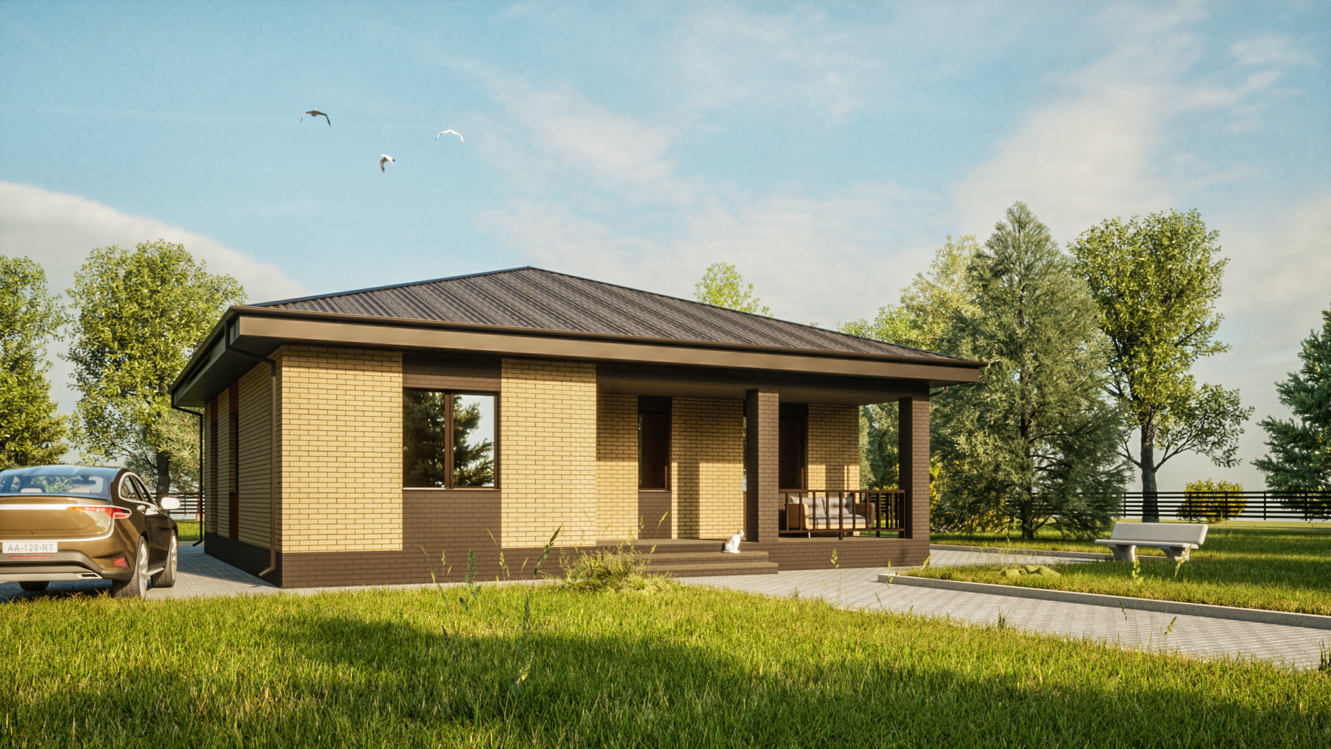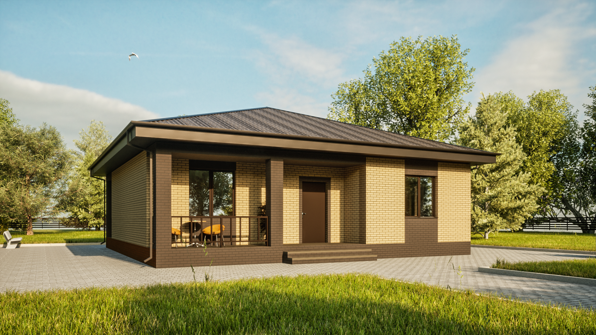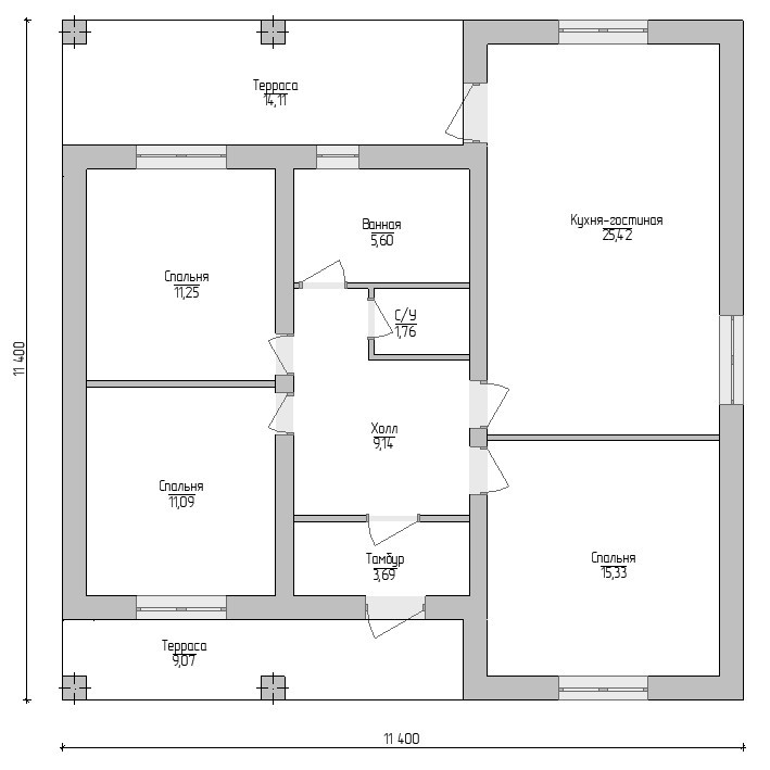 Одноэтажный дом с двумя большими верандами.