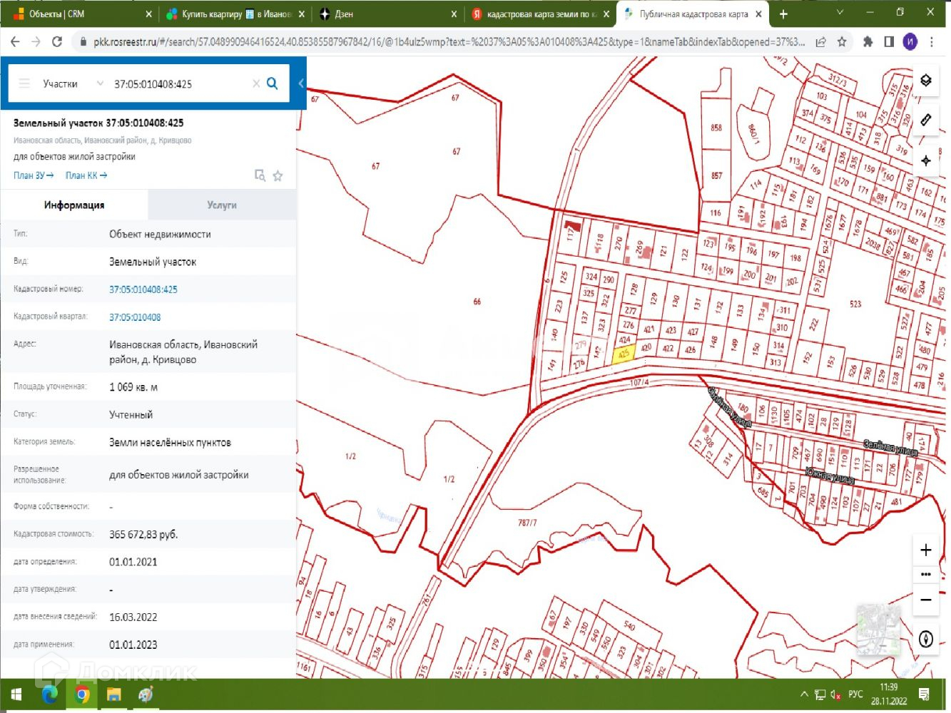 Продается земельный участок 10,69сот. д.Кривцово. Кадастровый номер 37:05:010408:425