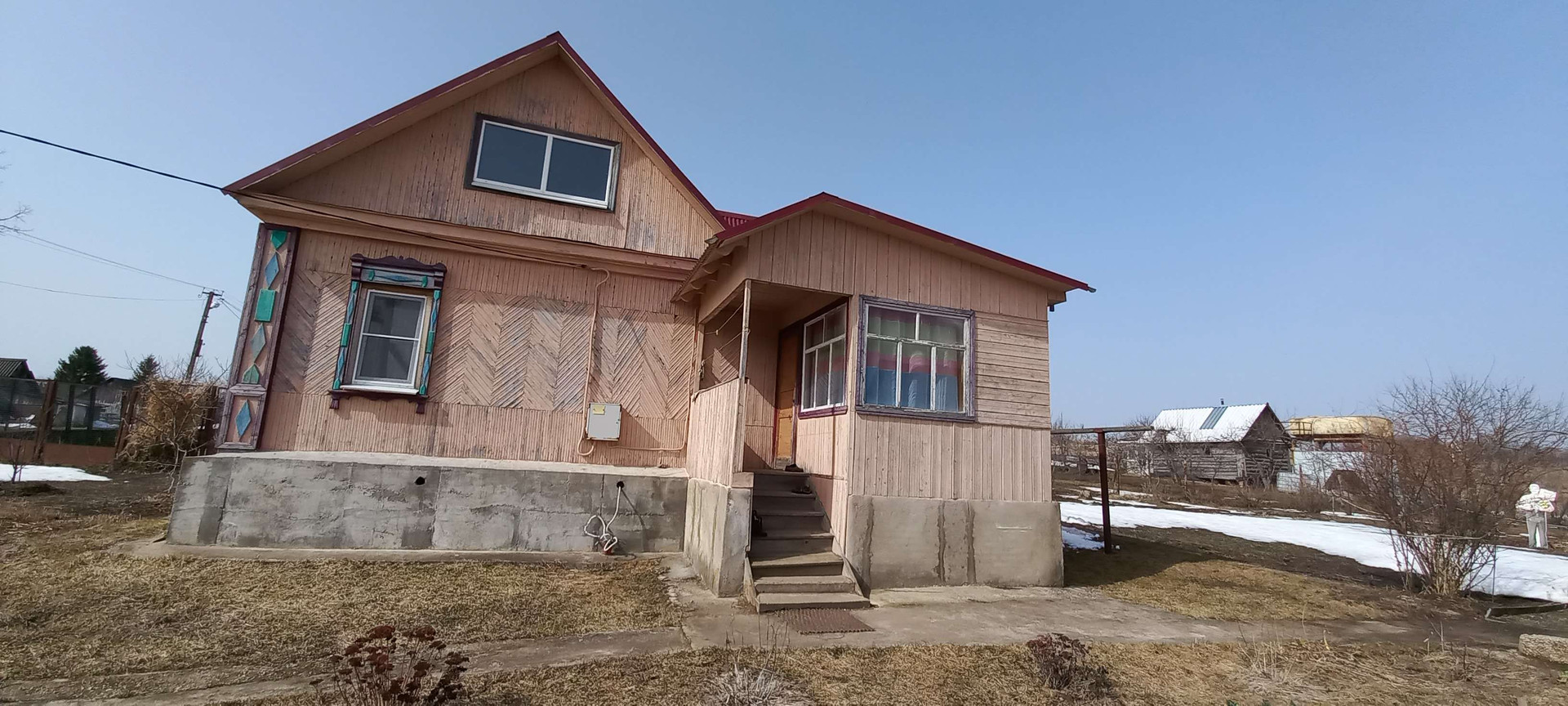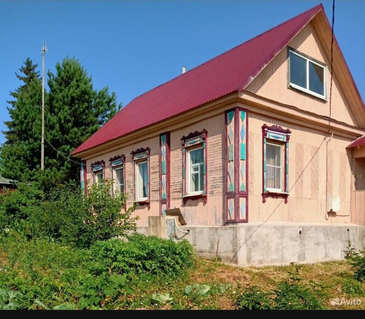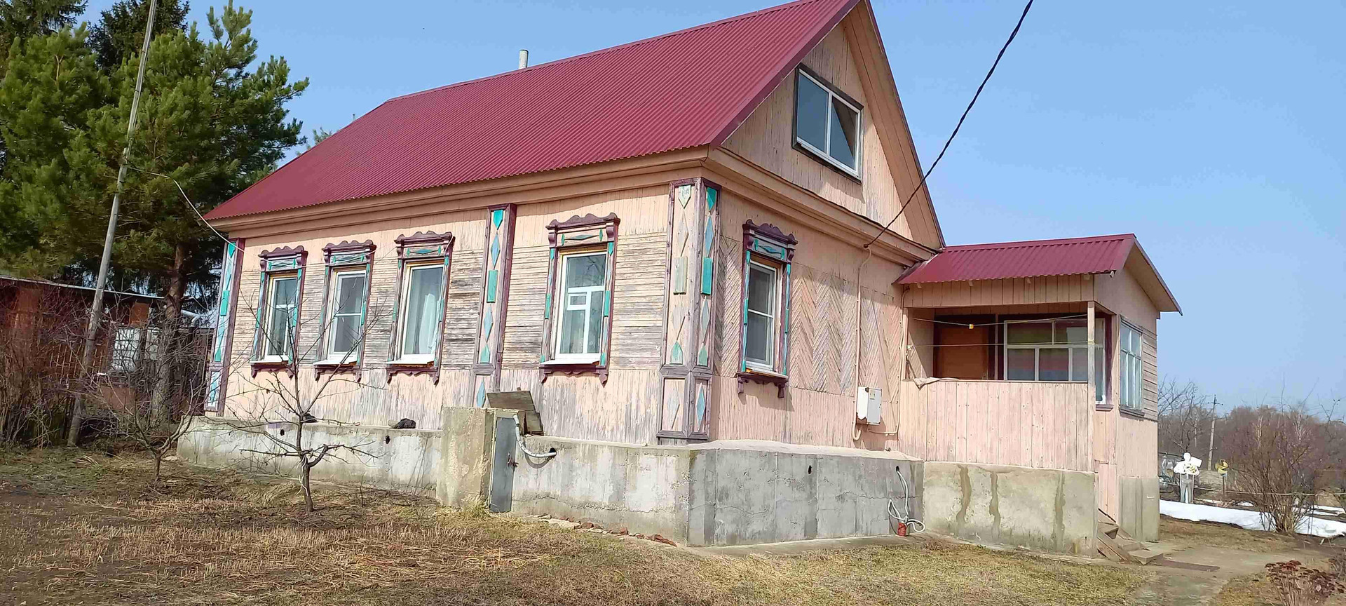 Это красивый терем,пятистенок,на высоком фундаменте с яркой крышей, общей площадью в 71,7 м2, стоит на краю деревни Кривцово,Тульской области.