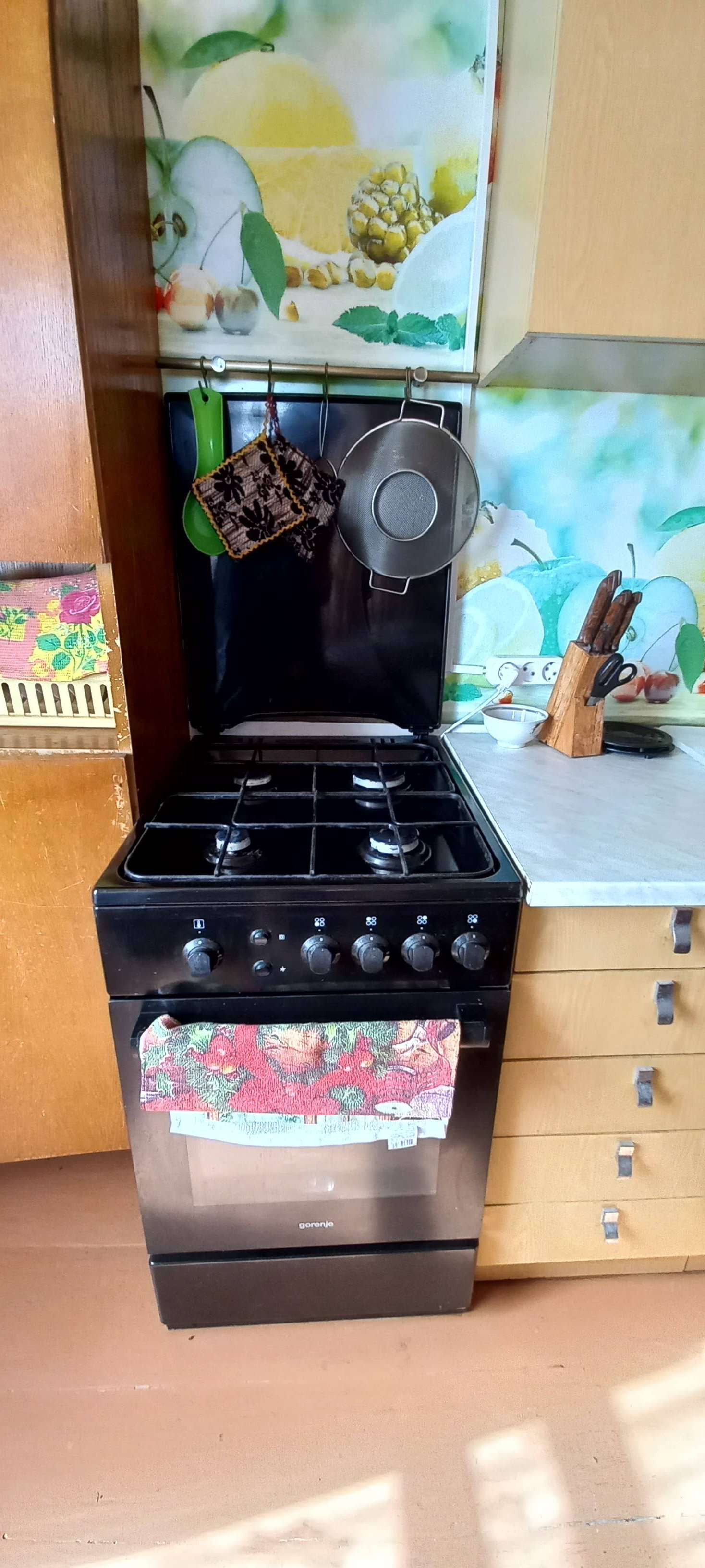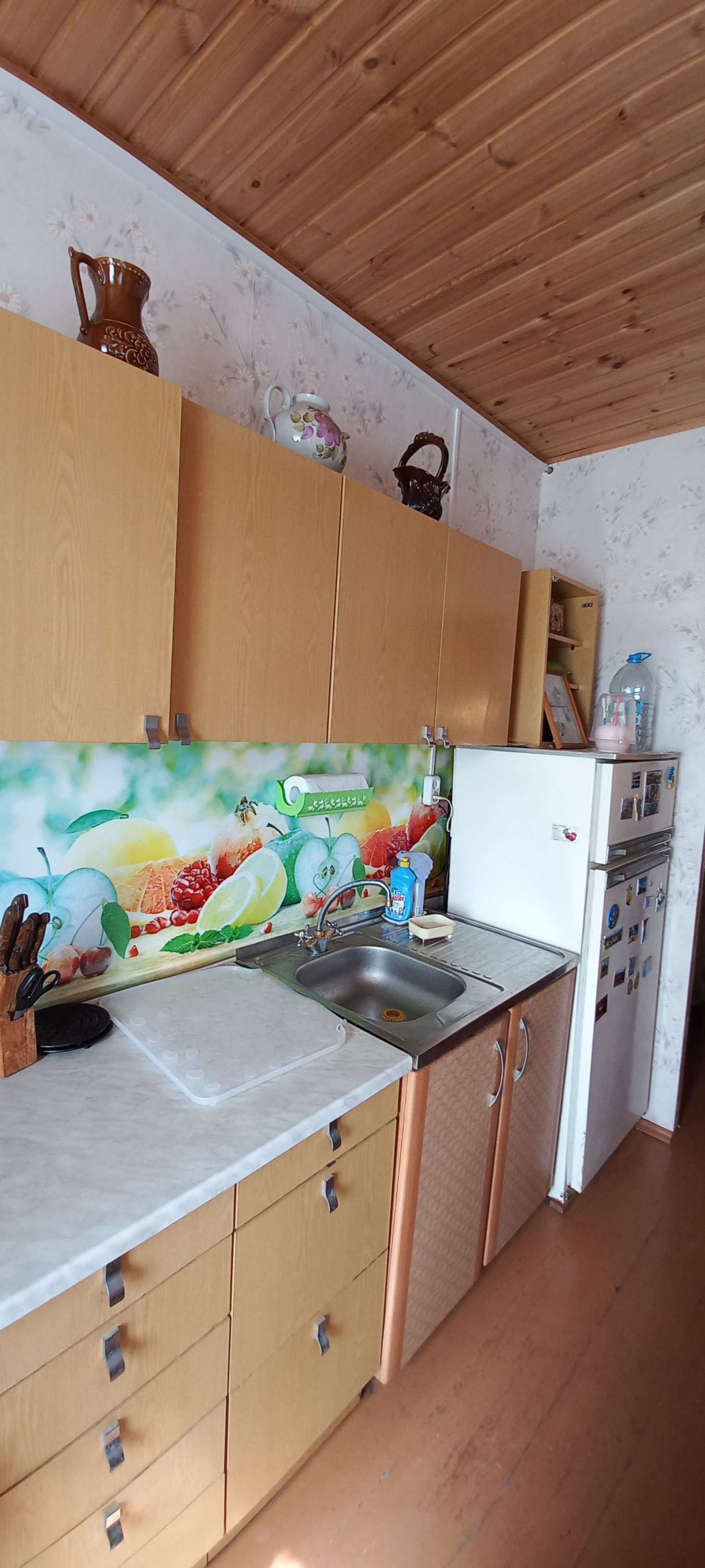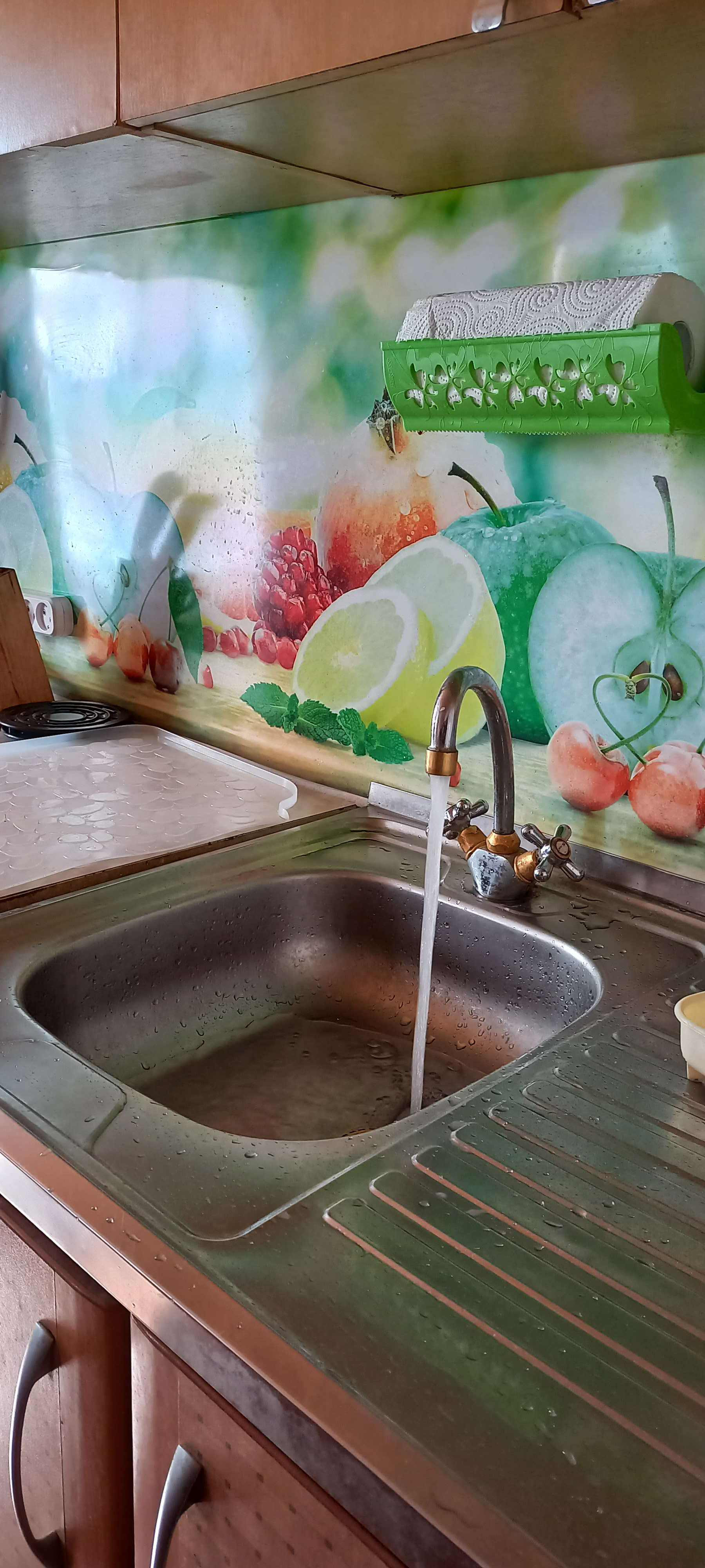 большая уютная светлая кухня-столовая пригласила сразу за большой овальный стол. Из крана лилась с хорошим напором чистая колодезная вода,которую качали насосом из своего колодца на 9,5 колец. Газовая плита трудилась на балонном газе
