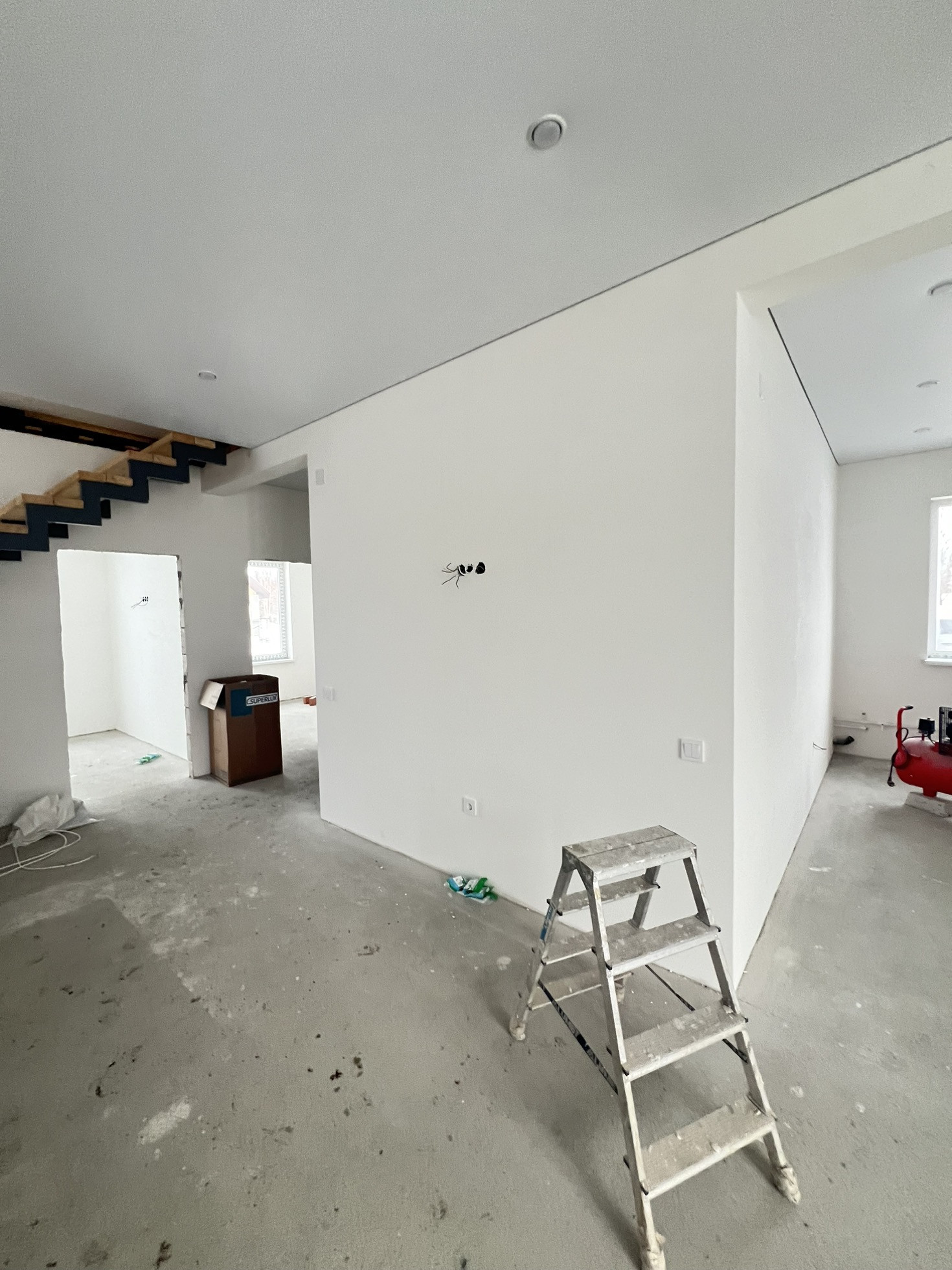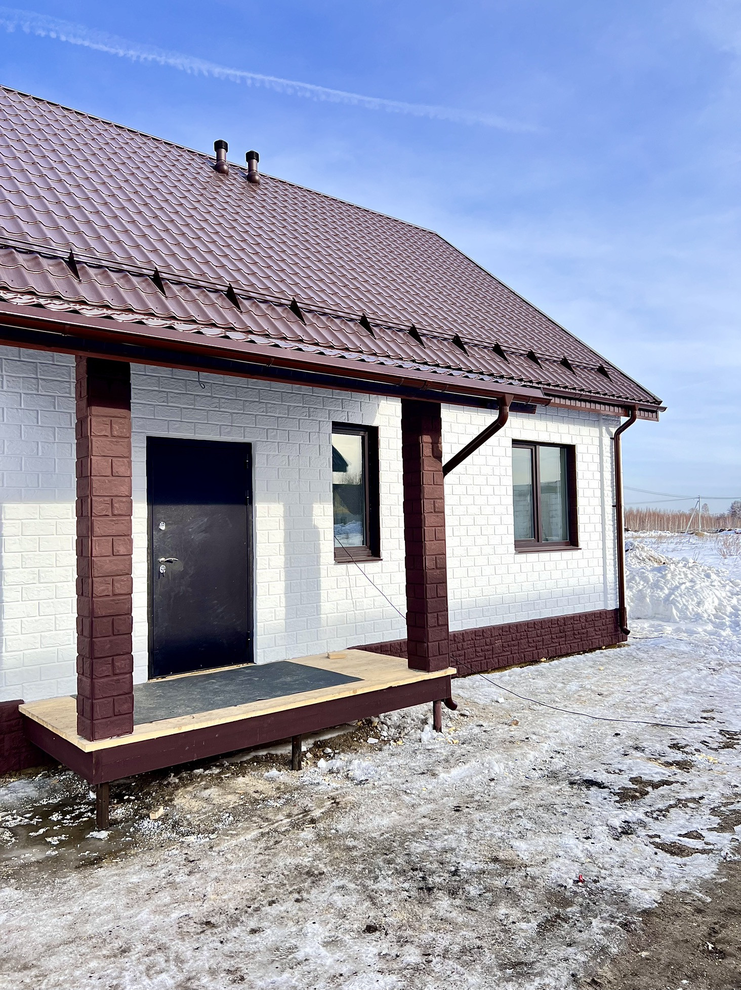 Дом сдаётся с предчистовой отделкой: белые матовые натяжные потолки со светильниками, разводка электричества по дому с установкой выключателей и розеток, стены оштукатурены под обои.