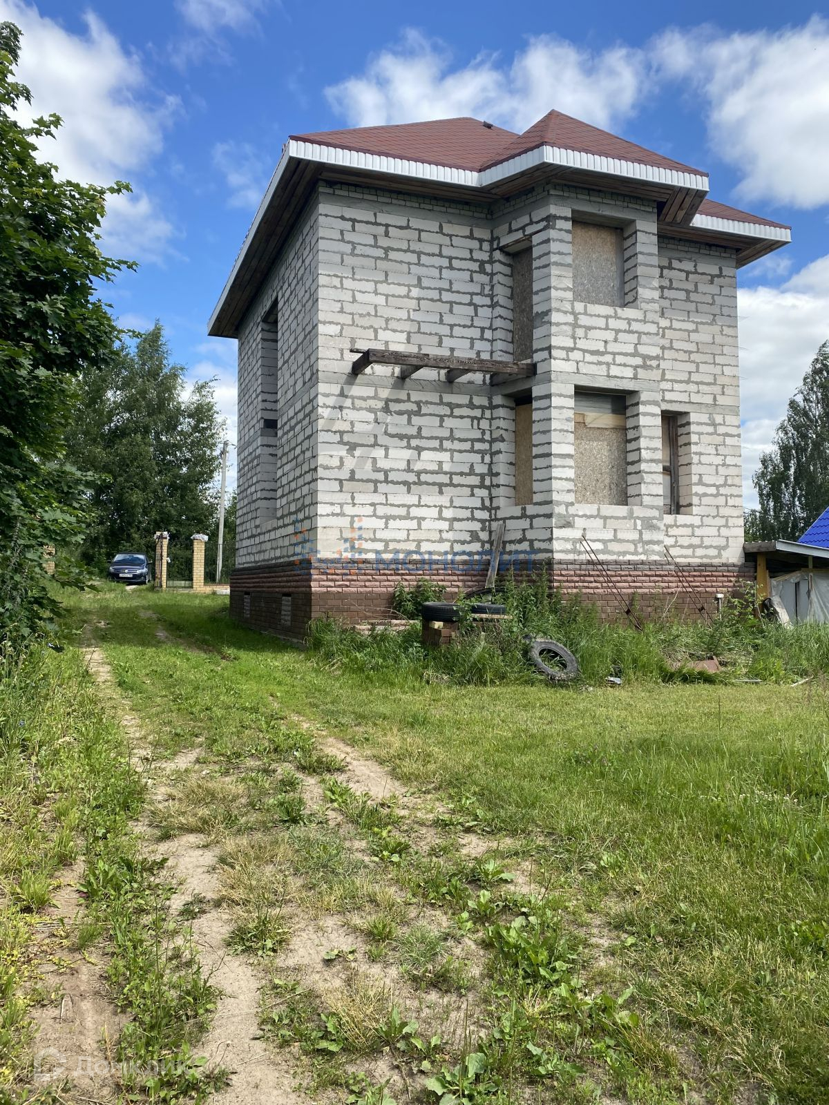 1 (коттедж) без отделки, (2х этажный), фундамент блоки. По проекту :Цокольный этаж - хоз блок.1 этаж: кухня, гардеробная, комната, сан. узел., кухня гостиная, 2 этаж - 3 спальни, сан. узел., Мансардный этаж - свободная планировка