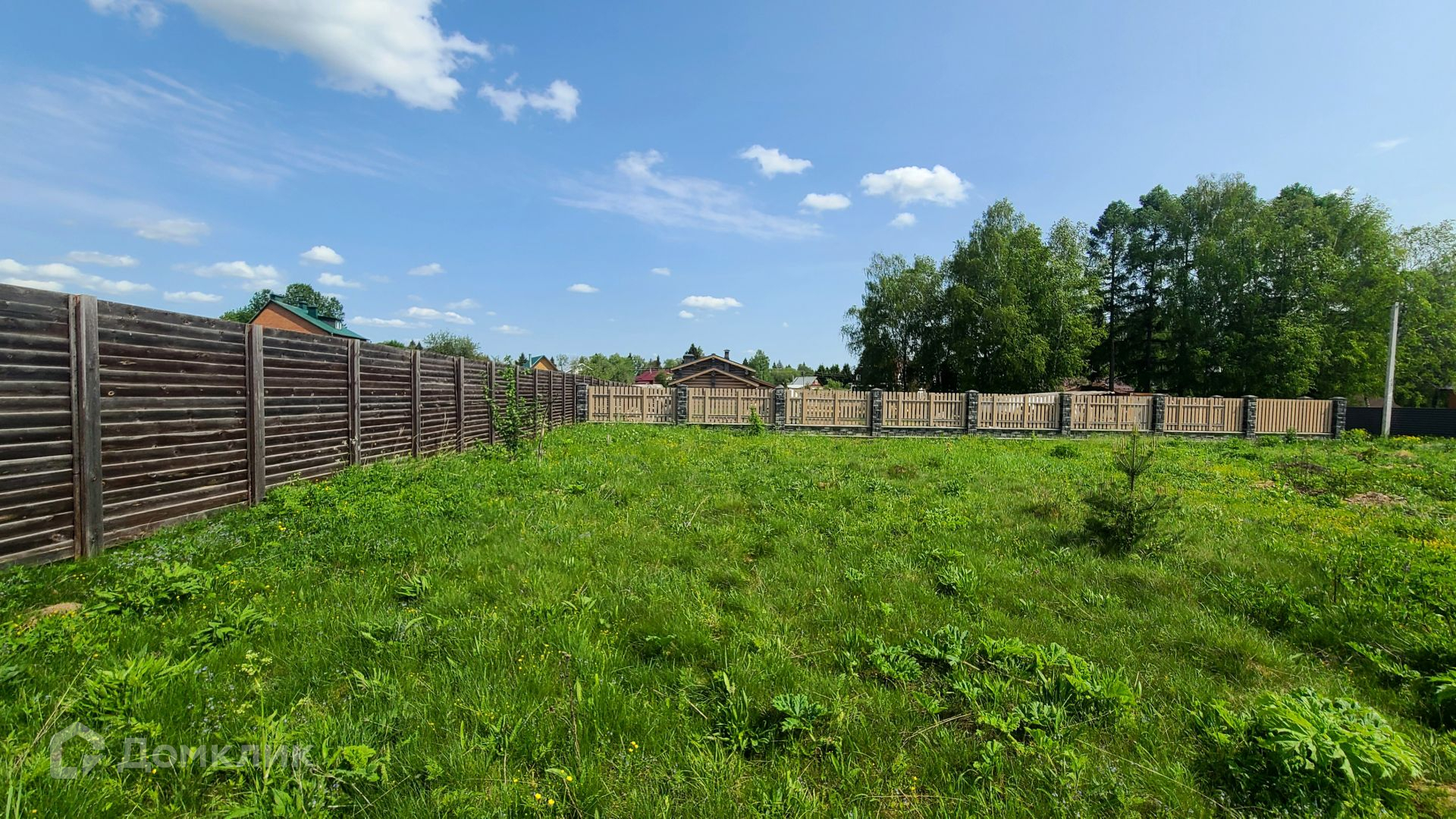 Участок ровный, очень удобно для планирования места, легко и оптимально расположить объекты строительства, огорожен забором с трех сторон.