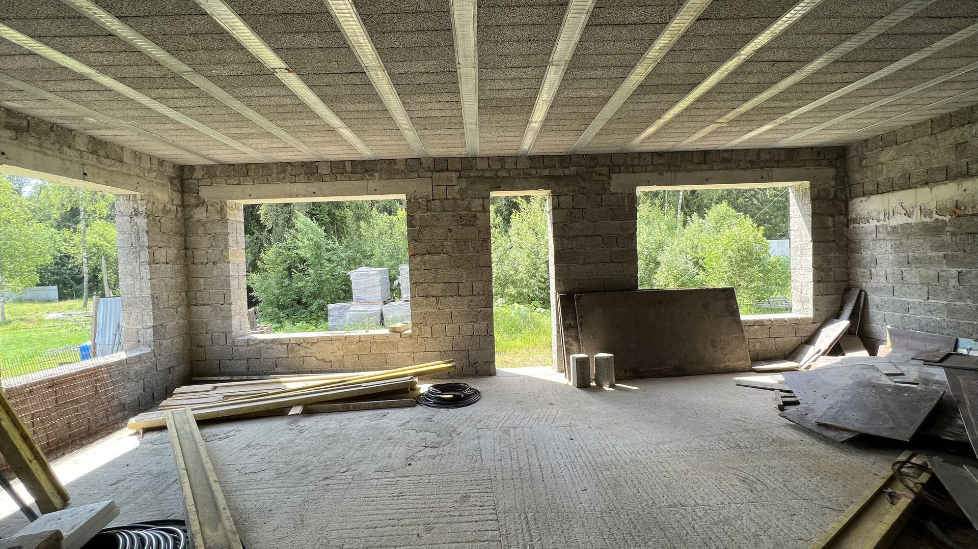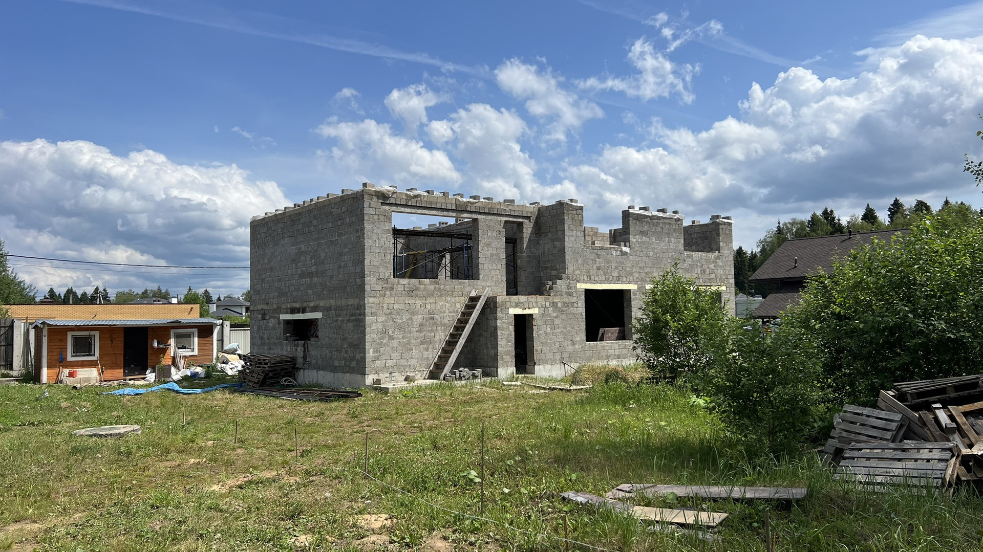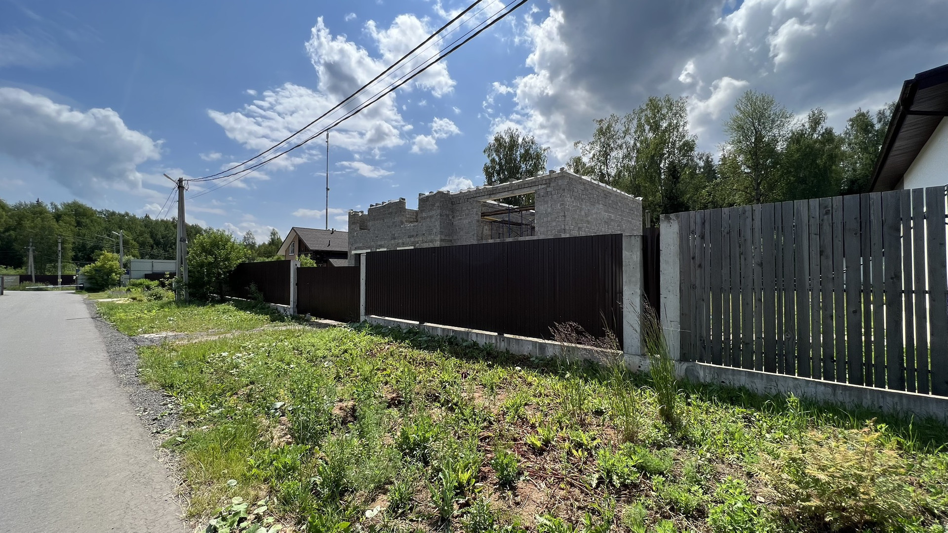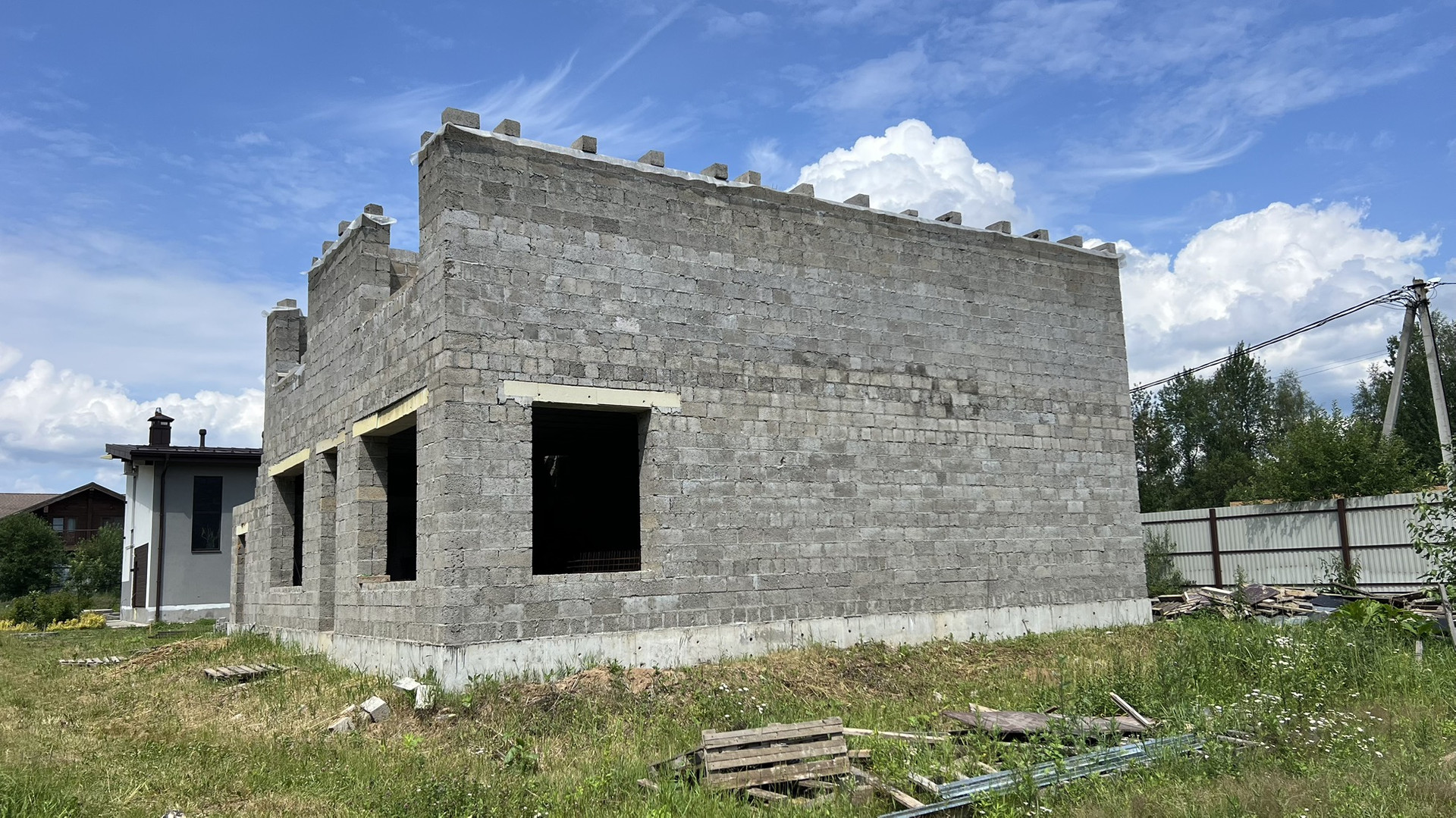 Прилесной участок с недостроенным 2-х этажным домом. ИЖС, земли населенных пунктов. Площадь дома 330 кв. м.  Материал стен - блок керамзитобетон. В поселке газ по границе (среднее давление), электричество 15 кВт по границе, асфальтированные дороги, КПП (охрана), интернет (2 провайдера). Участок огорожен по фасаду. Бытовка для строителей на участке. Быстрая продажа.