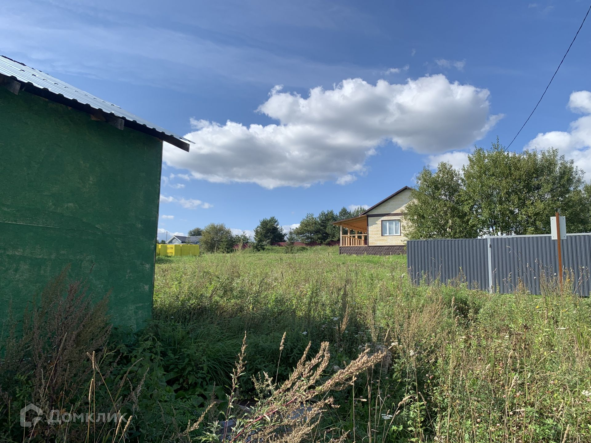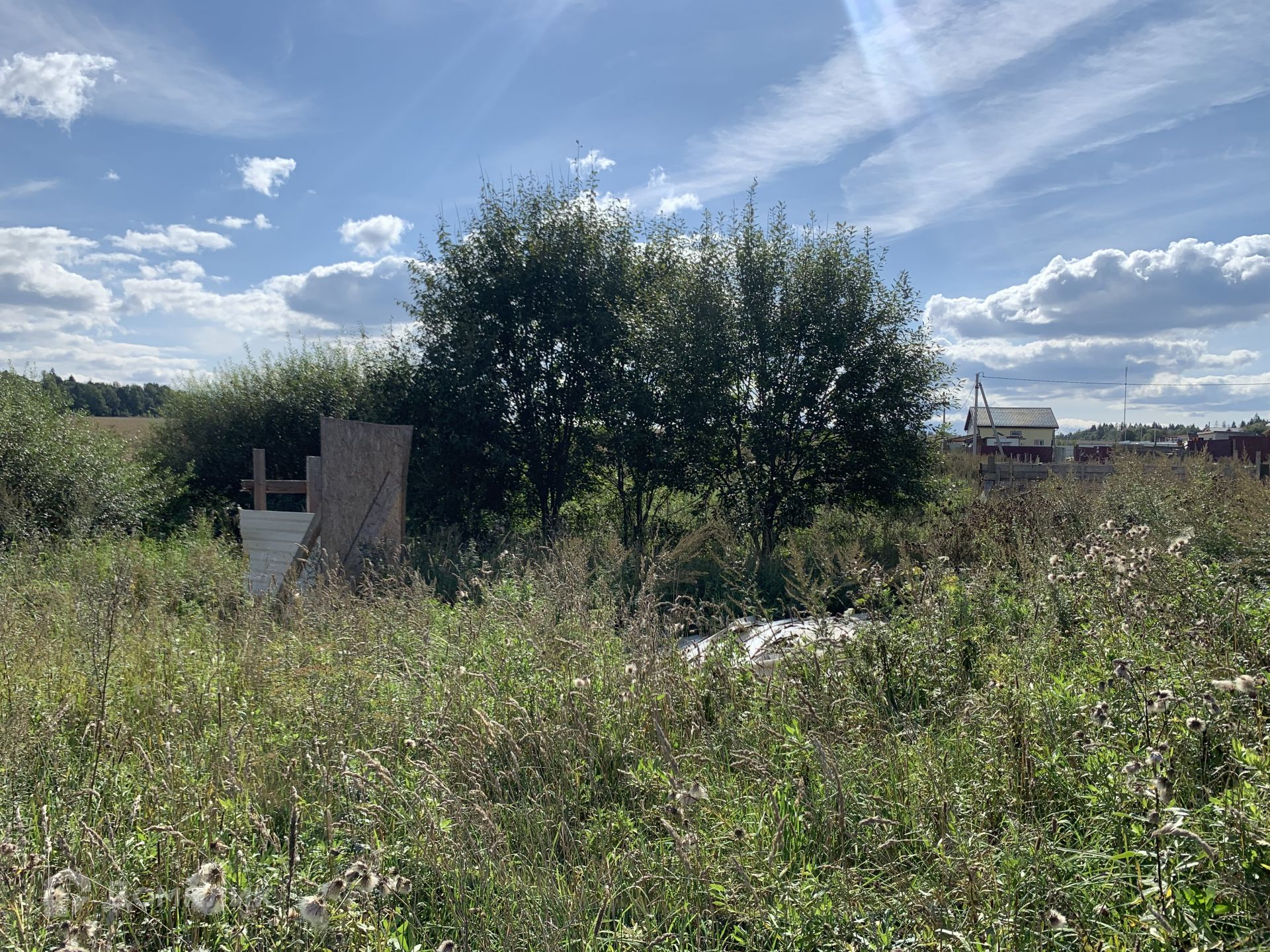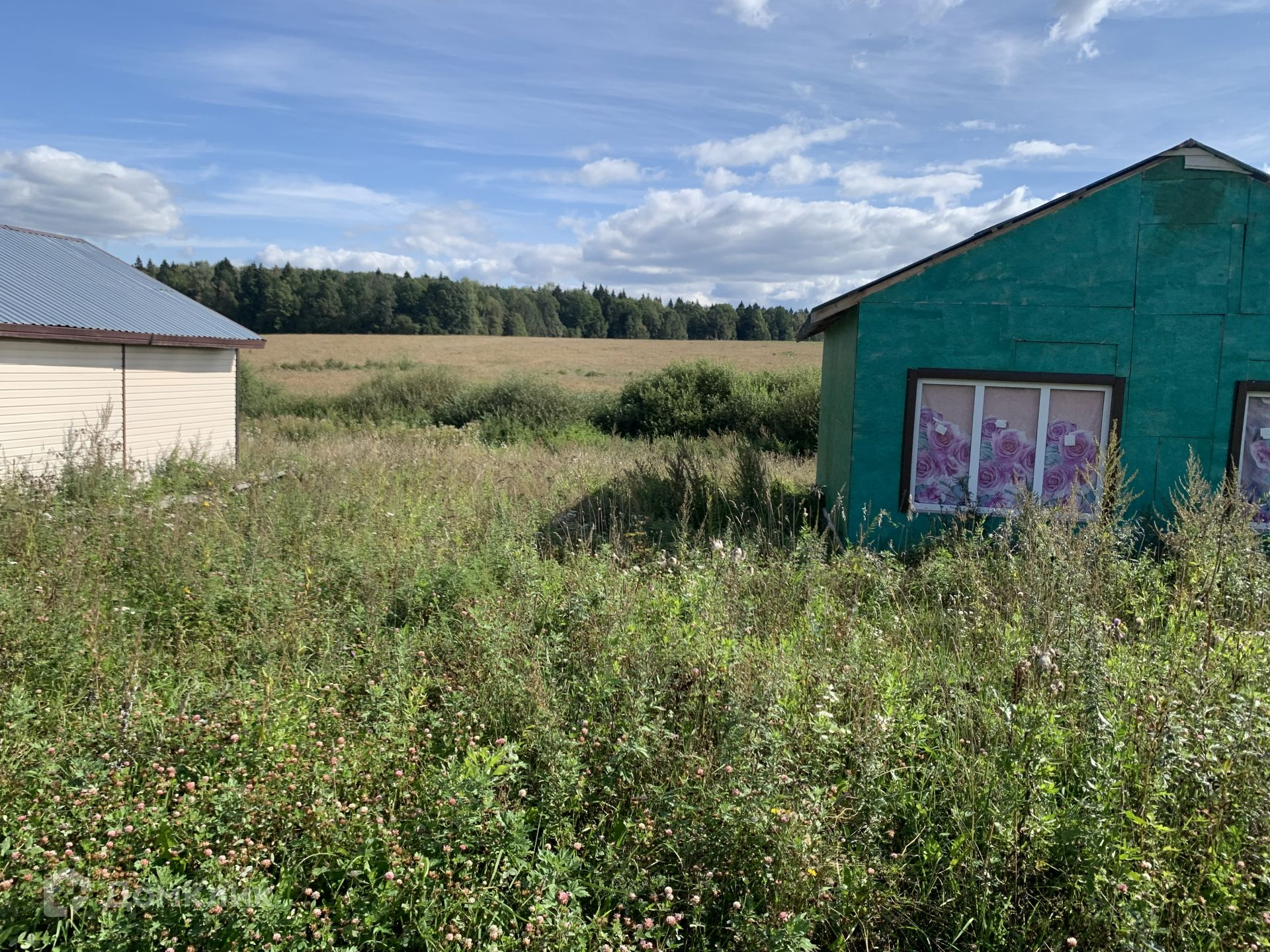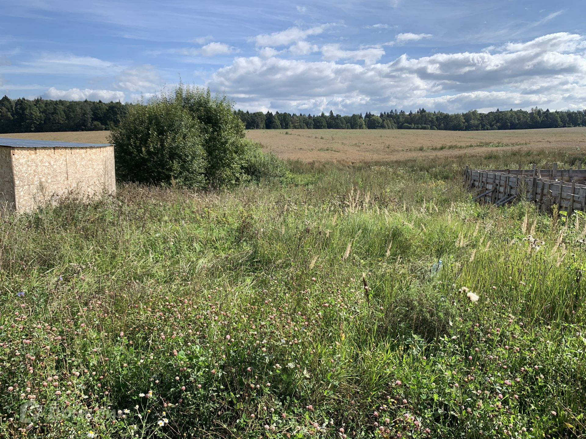 Участок имеет ровную форму с наклоном, на участке находится домик под снос из фанеры, он может пригодиться к примеру как бытовка для строителей если что.