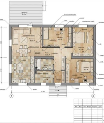 На первом этаже три спальни, гардеробная,2 санузла, гостиная большая, кухня, открытая веранда (можно без веранды). Проект дома обсуждается, можно внести изменения по желанию.