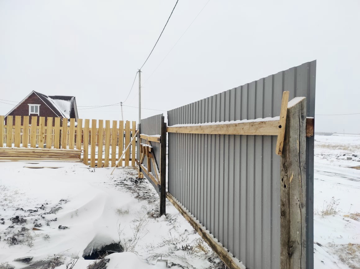 Участок 7 соток, огорожен со всех сторон, лицевая сторона из профлиста, ворота, калитка, подходы к тому зацементированы.