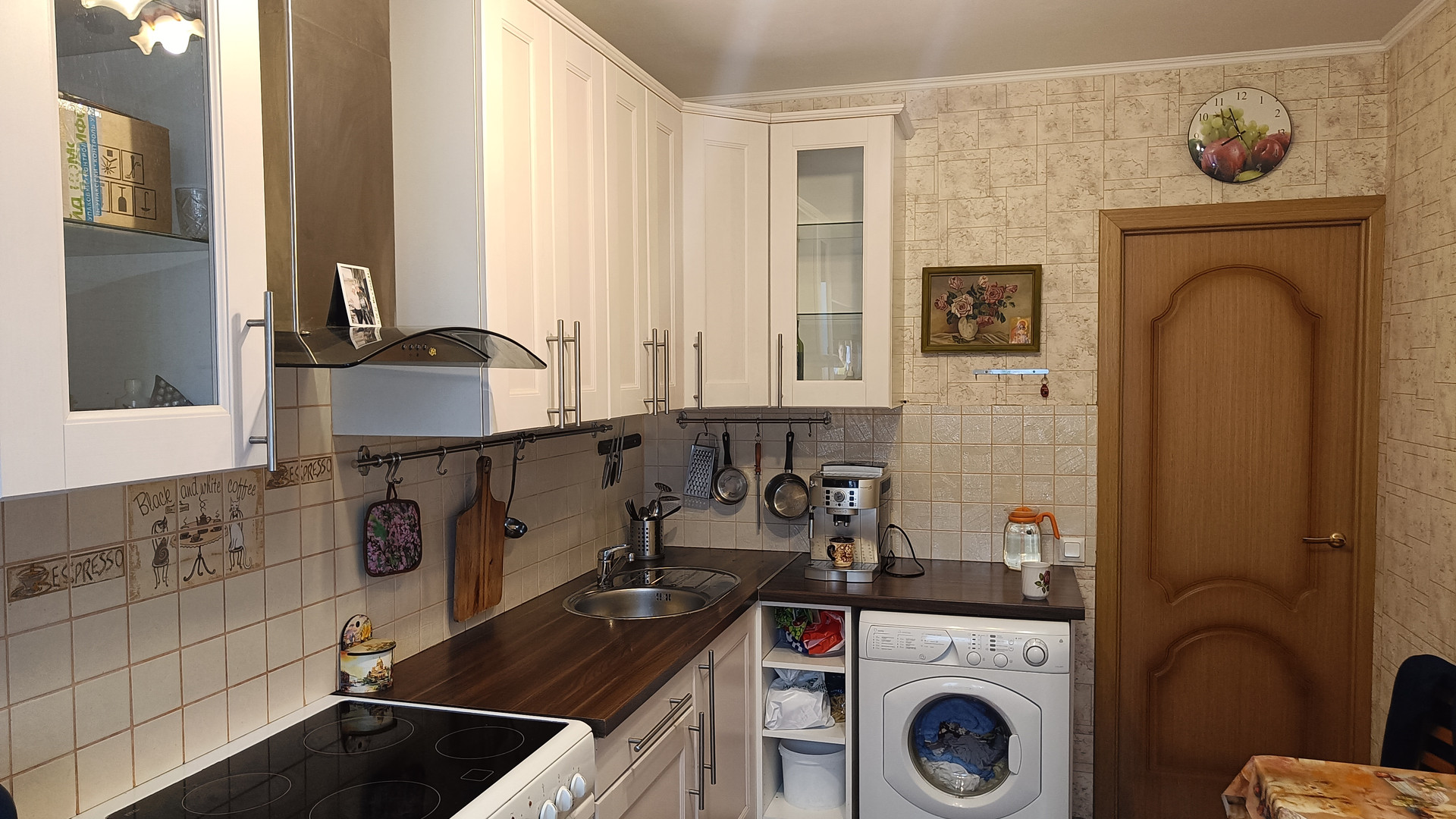Кухня просторная со встроенной мебелью. Плита электрическая, вытяжка, стиральная машина остается в подарок новому собственнику. На полу керамогранит.