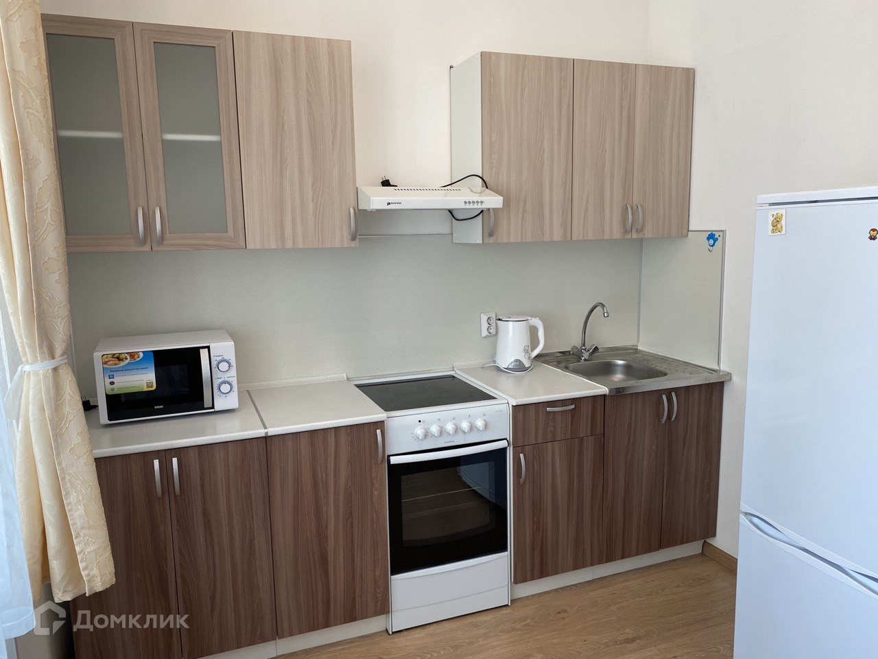 Есть вся необходимая для комфортного проживания техника: стиральная машинка, холодильник, микроволновка, электрический чайник, утюг, пылесос.